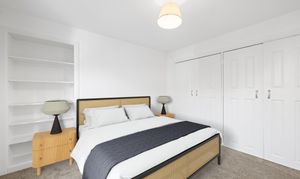 Spacious double bedroom with new UPVC front facing window. Two floor to ceiling fitted wardrobes, one with hanging rail and one shelved concealed behind colonial style doors. Shelved recess. New fitted carpet, radiator.