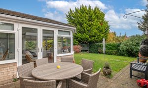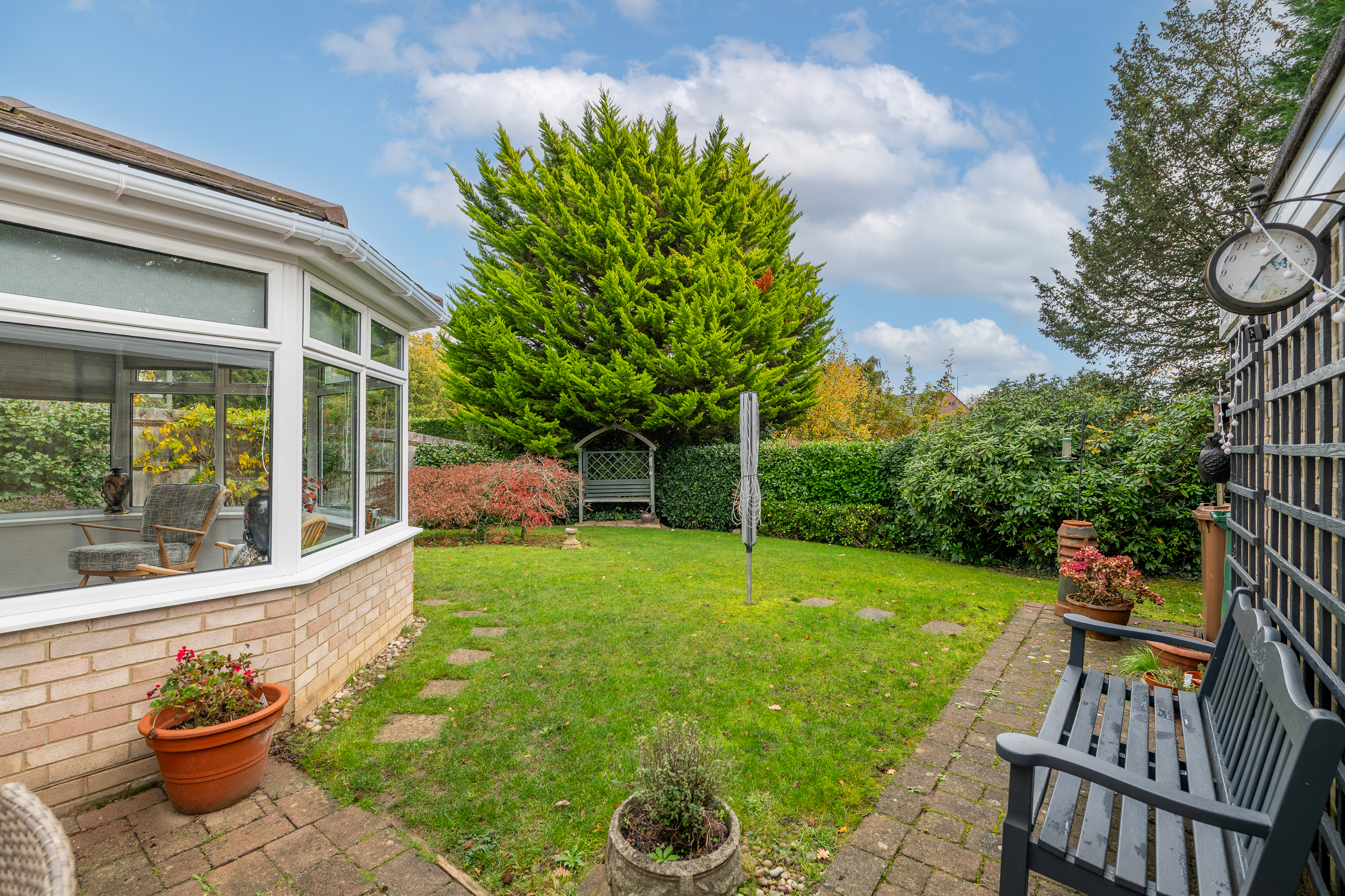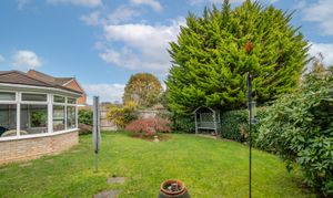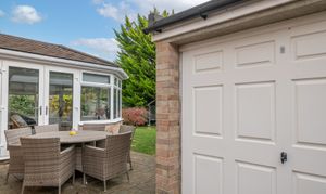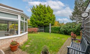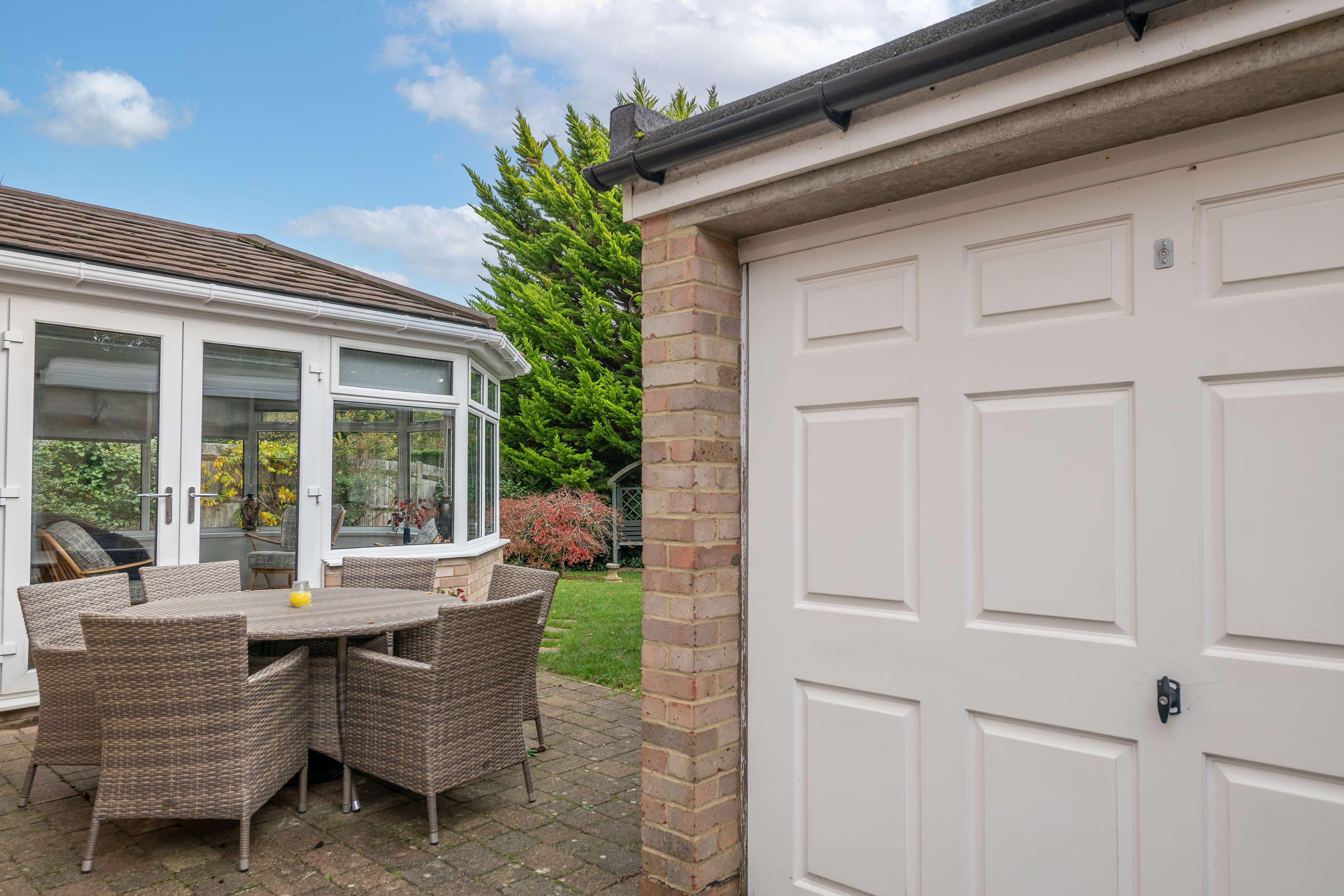 Step outside, and you'll discover a peaceful and private garden oasis. The south-facing garden provides several seating areas and a generous lawn, offering a perfect setting for outdoor relaxation and entertainment. The gates leading to the single garage add a touch of security and convenience, completing the practicality of this delightful abode.