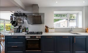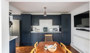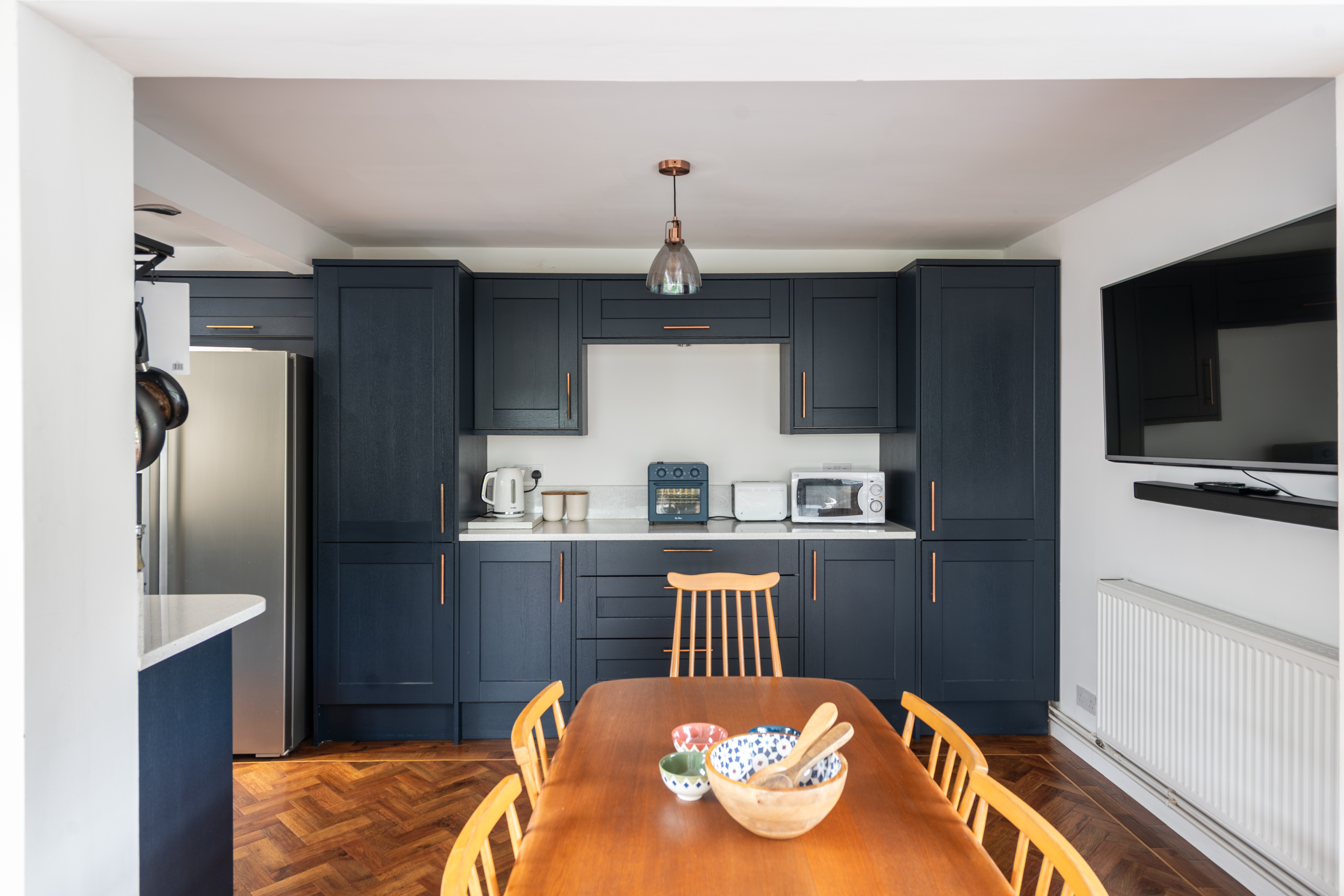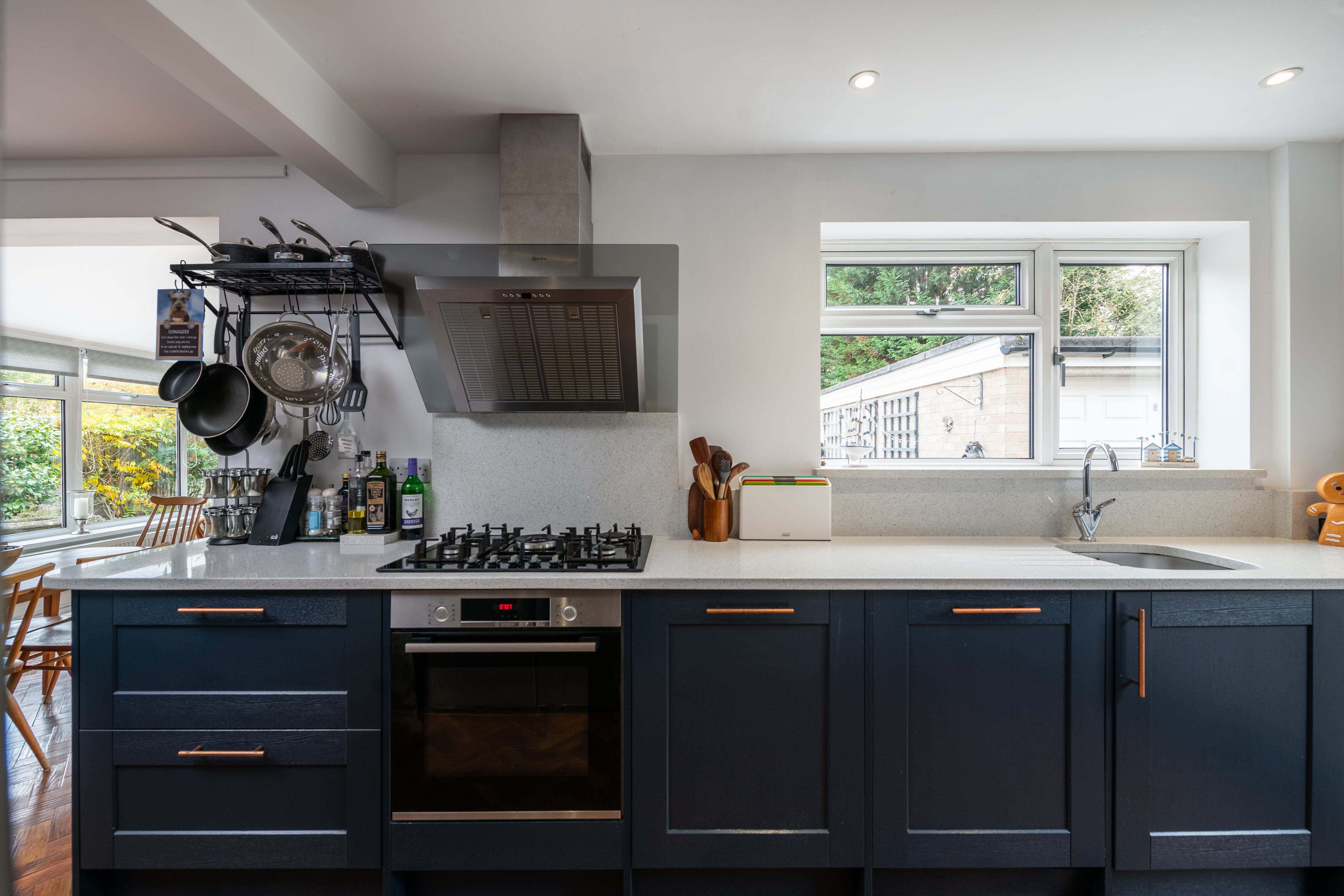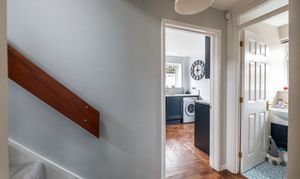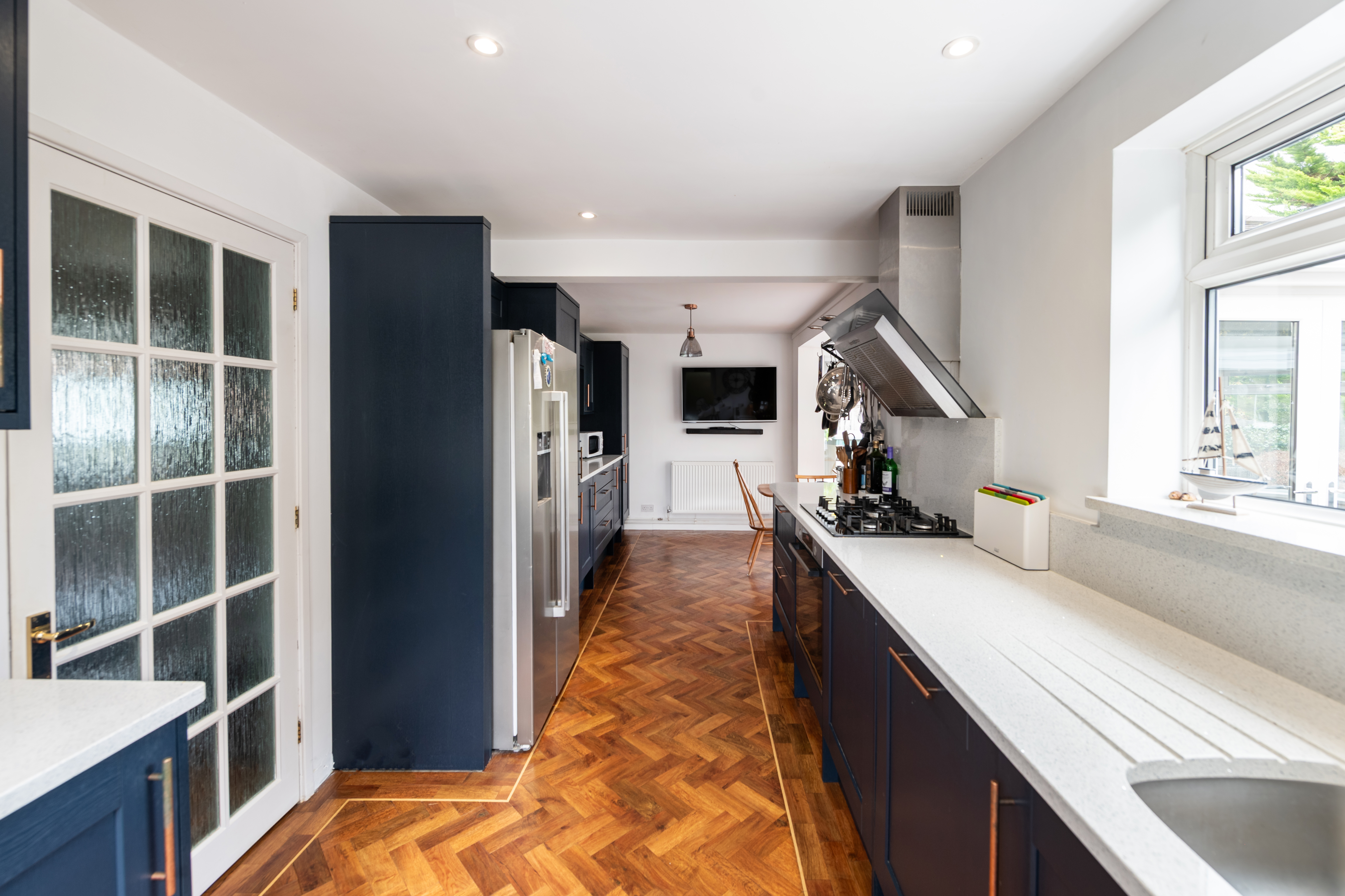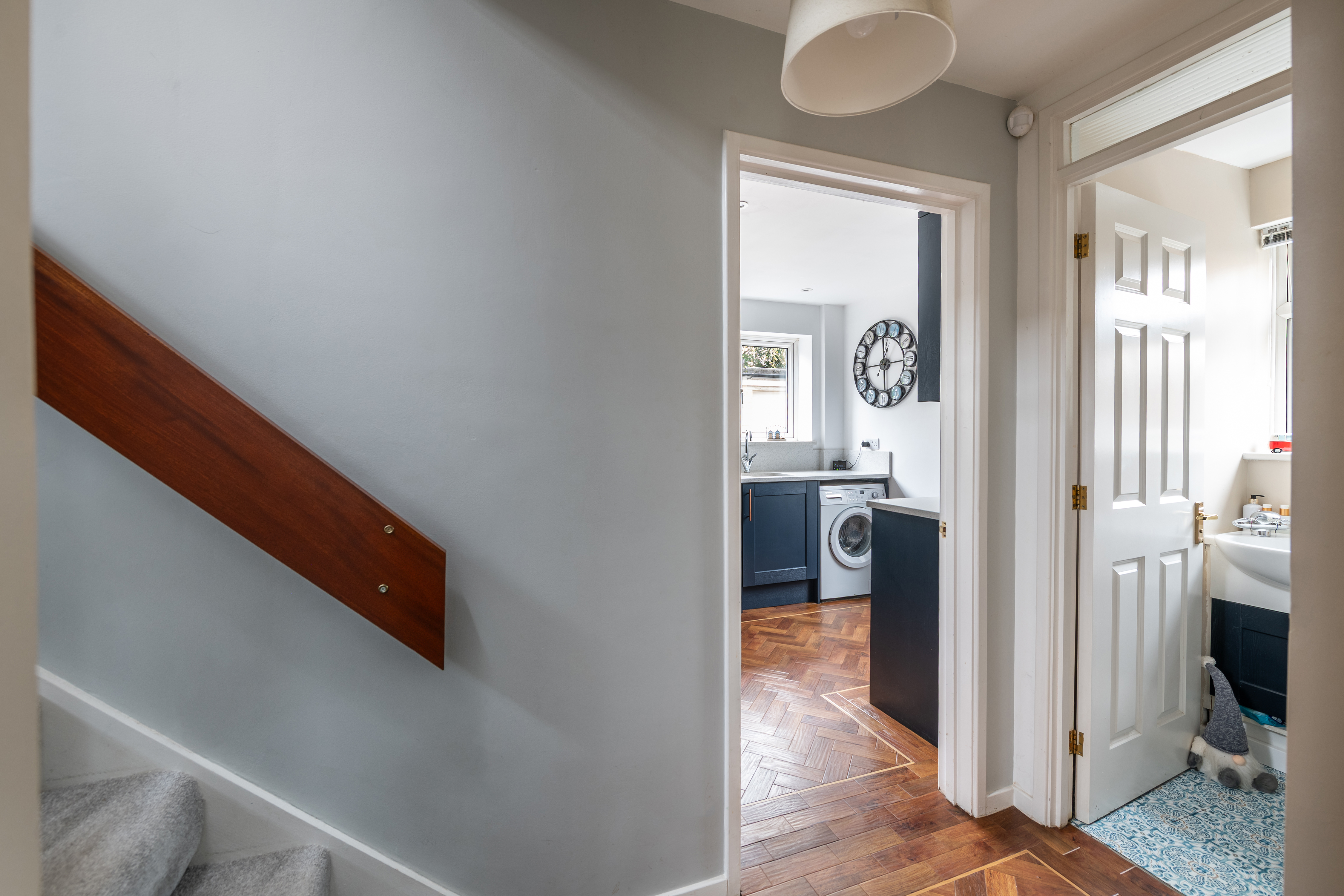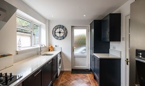 The house welcomes you with an open-plan layout at the back, featuring a modern kitchen adorned with contemporary fitted coloured cabinets and quartz work surfaces. The ground floor is elegantly finished with stylish Karndean flooring, adding a touch of sophistication to the living space.