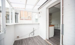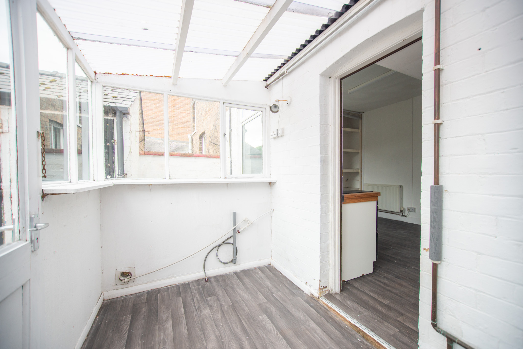 With laminate flooring and windows and plumbing for a washing machine.