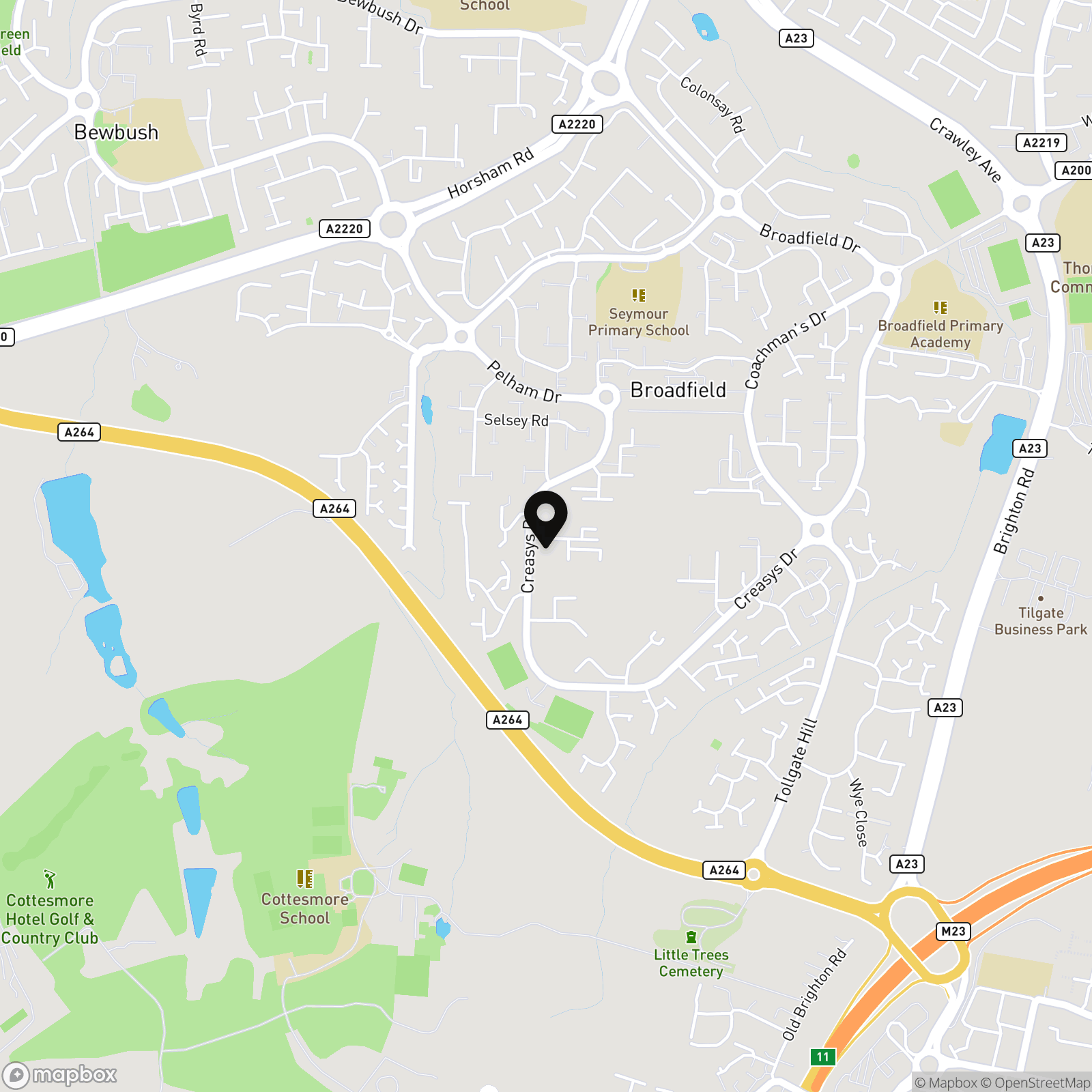 Located to the south west of the town, Broadfield has one of the largest neighbourhood shopping parades in the town with a wide variety of shops, a library, a church, a nearby mosque and a large medical centre. There are two primary schools, an adventure playground, many open spaces with football pitches and the Broadfield Stadium which is home to Crawley Town Football Club. Broadfield Park is next to the stadium, this used to be part of Tilgate Estate and there is a small lake and some woods. Buchan Country Park and Tilgate Park are roughly equidistant, both with large, open spaces to relax in and K2 Leisure centre is nearby. The 24 hour Fastway bus service connects Broadfield to Crawley town centre, Gatwick Airport and beyond and the A23 / M23 provides access to London and the south coast.