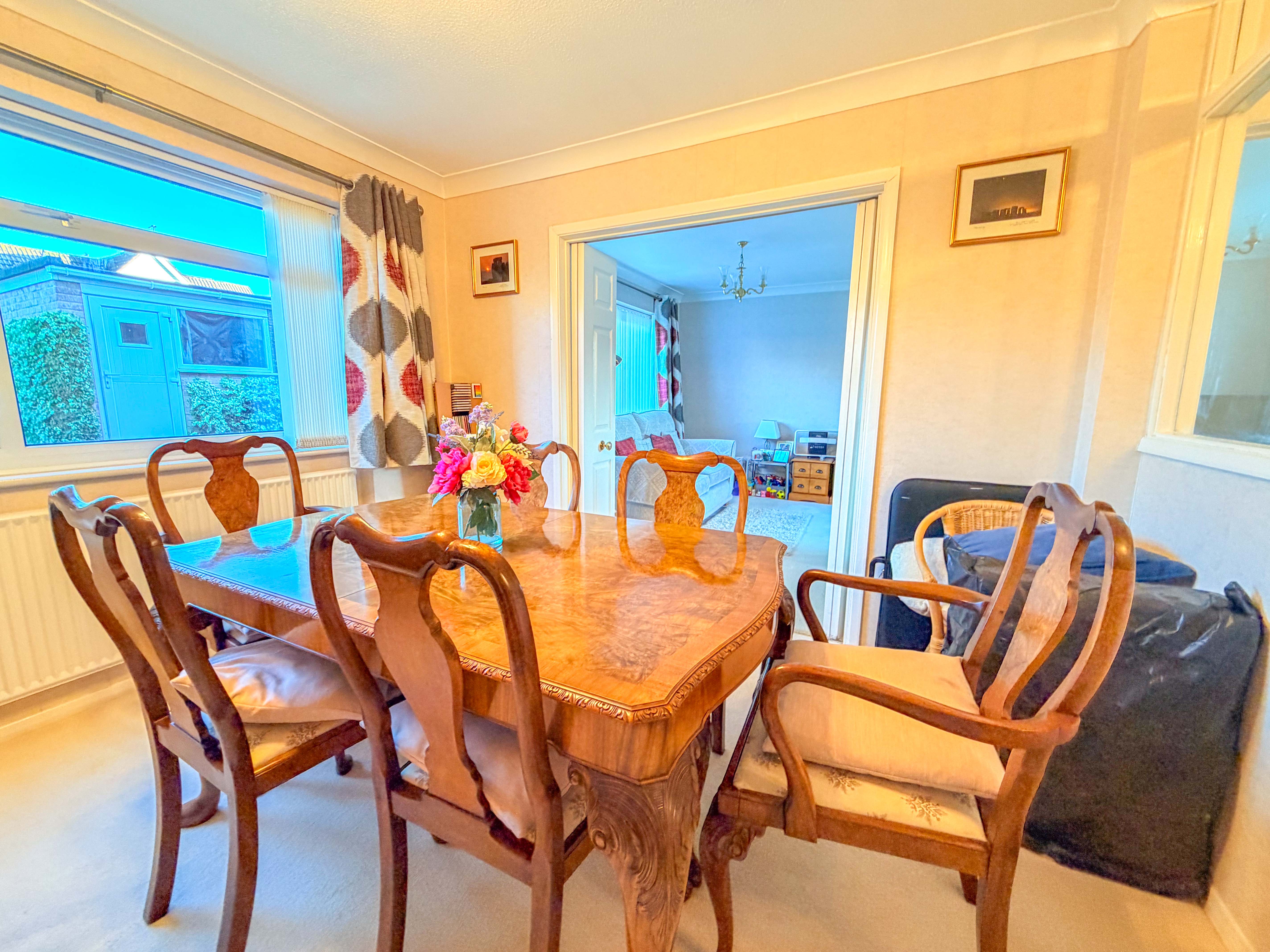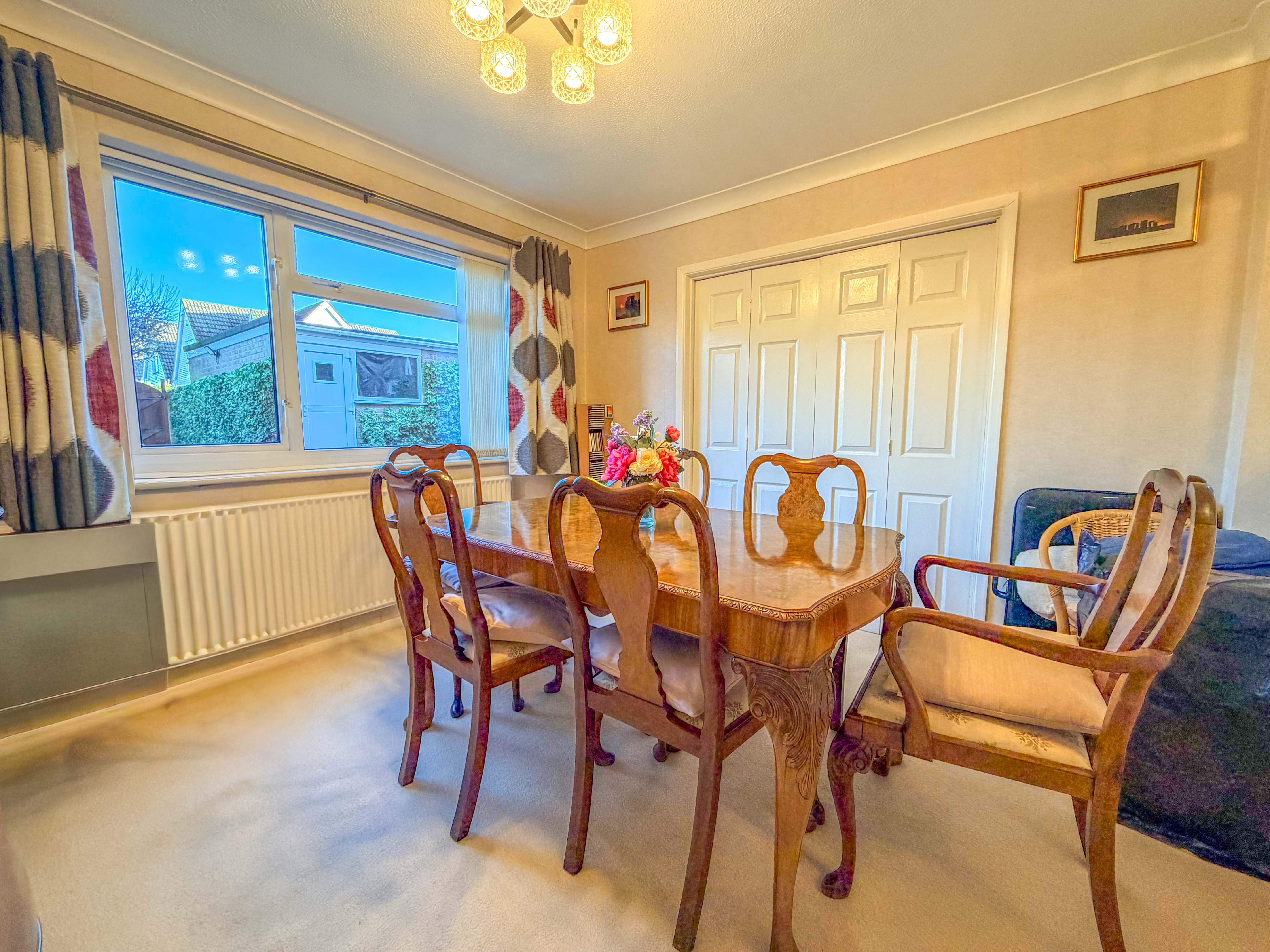 The lounge is an inviting, homely retreat, stretching from the front to the rear of the property and enjoying a dual aspect that fills the room with natural light. It offers the perfect space to unwind at the end of a busy day. Double doors lead into the separate dining room, allowing the two rooms to effortlessly combine when opened up—ideal for larger gatherings, celebrations, or simply creating a more expansive living space.