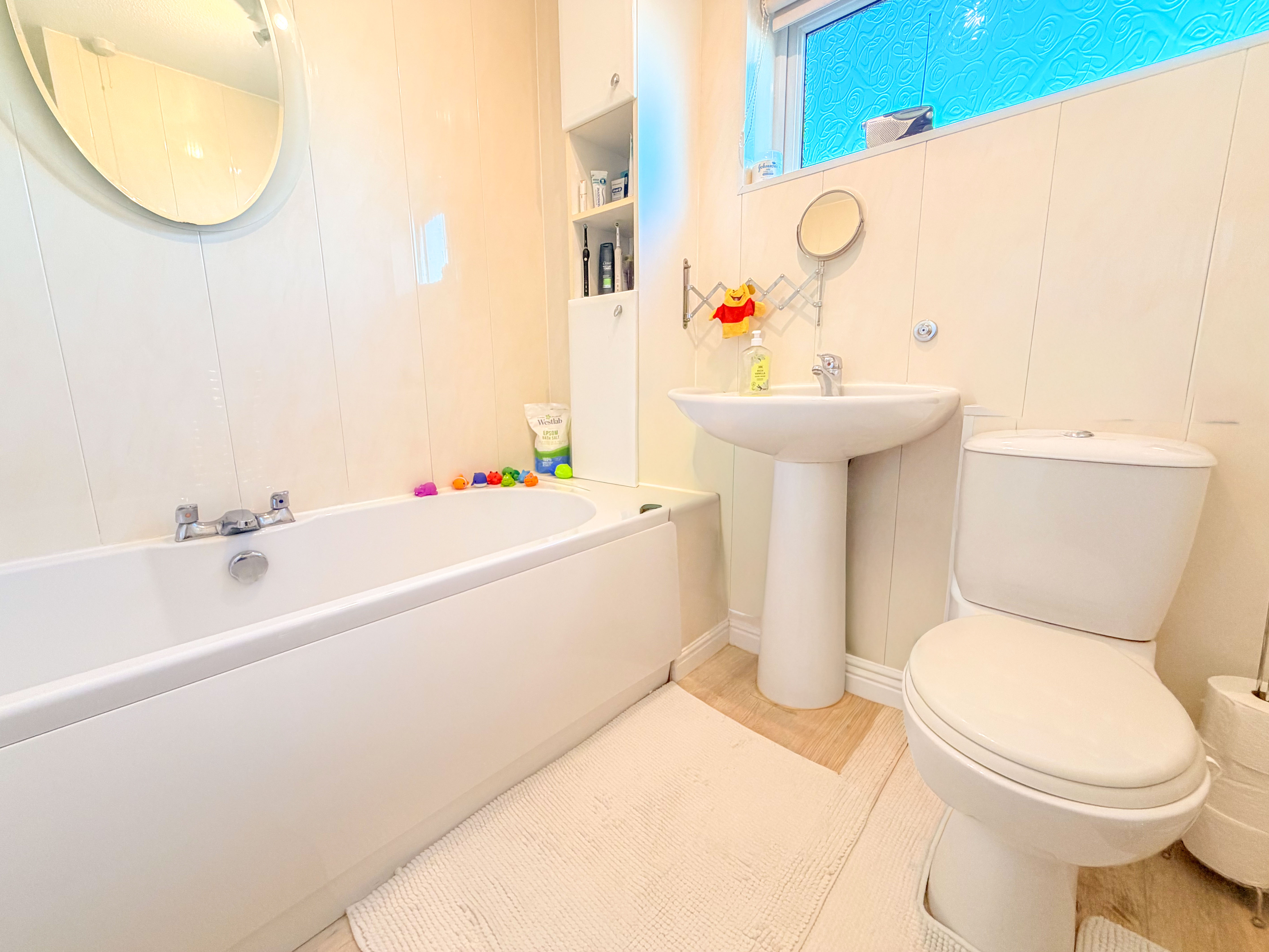 Upstairs, the first floor continues to impress. All four bedrooms are well proportioned, creating comfortable and versatile accommodation for families of all sizes. Whether used as bedrooms, hobby rooms or home offices, each space allows for flexibility. The four-piece family bathroom, complete with bath and a separate shower, provides both convenience and a touch of indulgence.