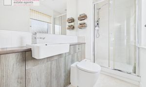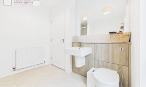 Upstairs, the front-facing principal bedroom is tastefully finished in a modern style and benefits from excellent built-in storage and it’s own en-suite bathroom. Three further well-proportioned bedrooms provide flexible space for family, guests, or home working. A fully fitted family bathroom, comprising bath, wash hand basin and WC, along with a separate shower, completes the first-floor accommodation.