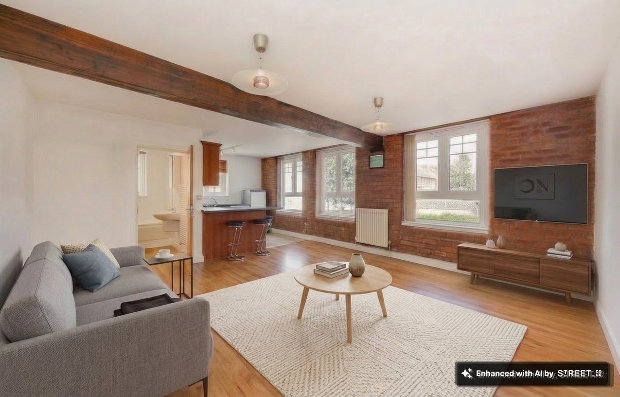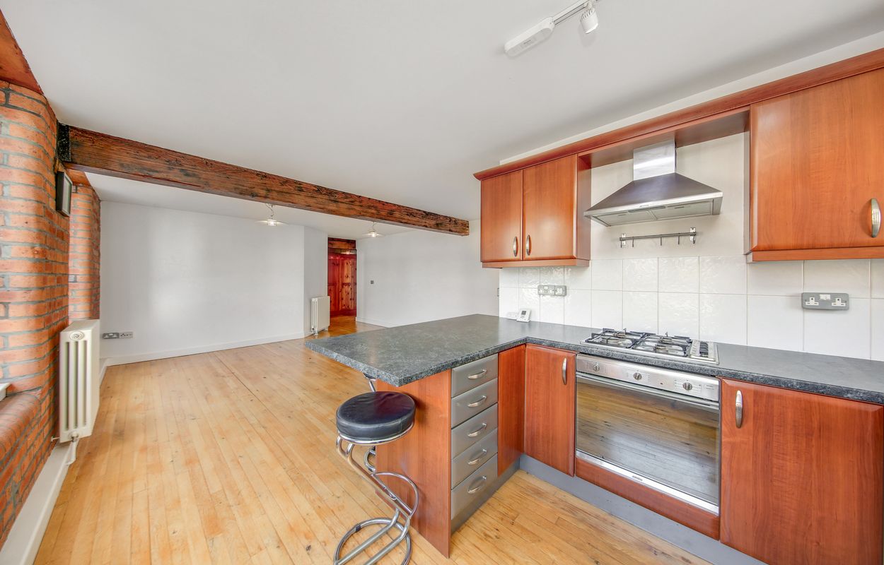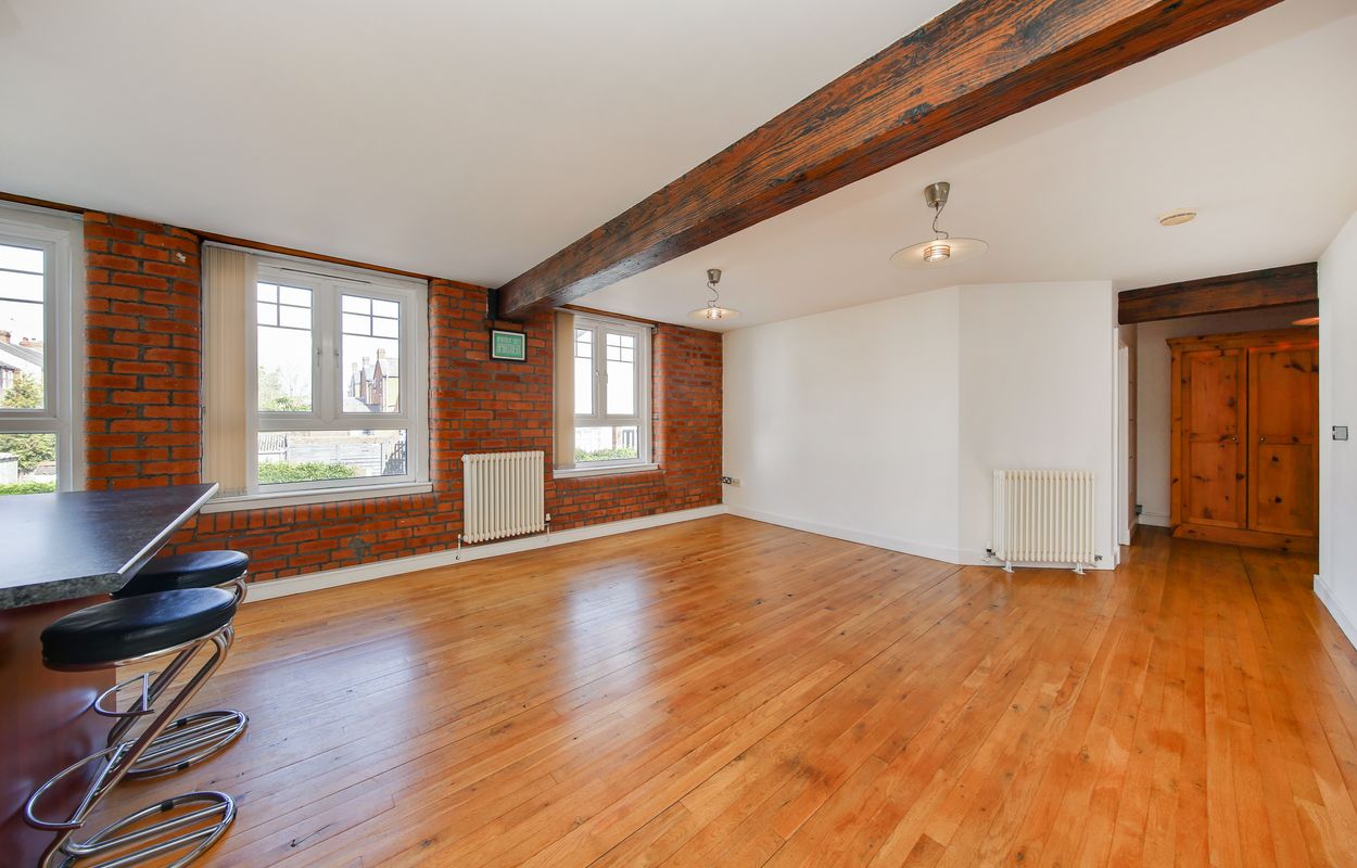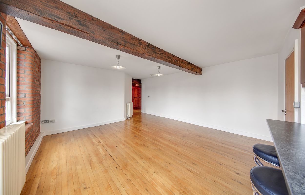 The standout space is the generous open-plan living area, where exposed brickwork and original beams bring real personality. There’s plenty of room for both living and dining, while the fitted kitchen and breakfast bar keep the layout feeling sociable and easy to use day to day, complete with an oven, hob, extractor fan, washer, and fridge.
