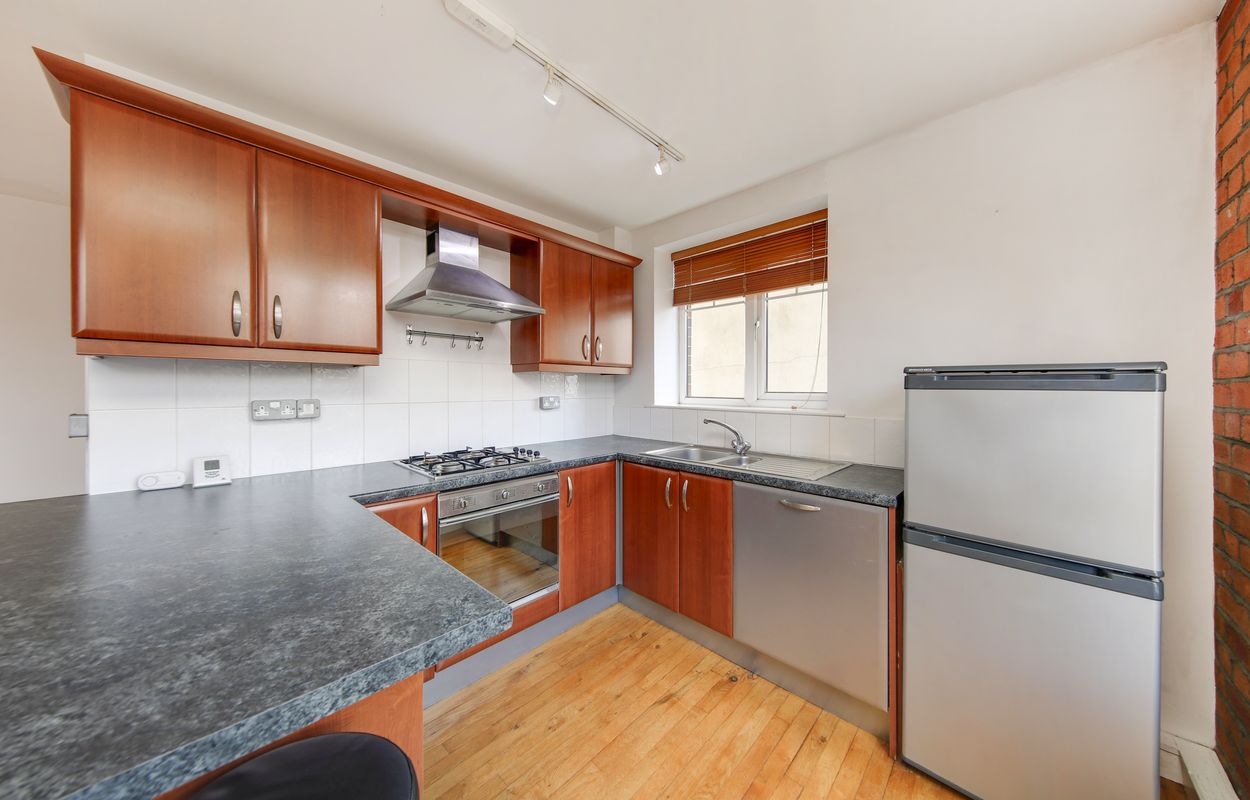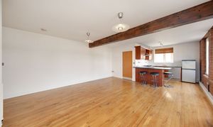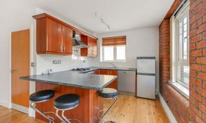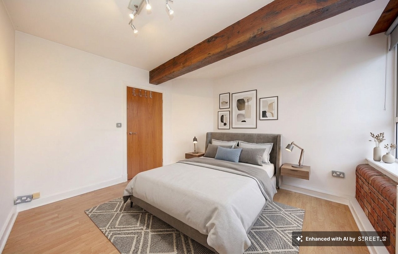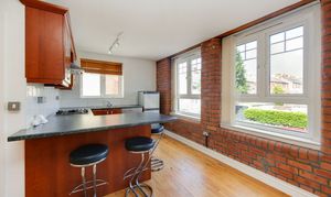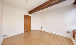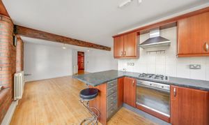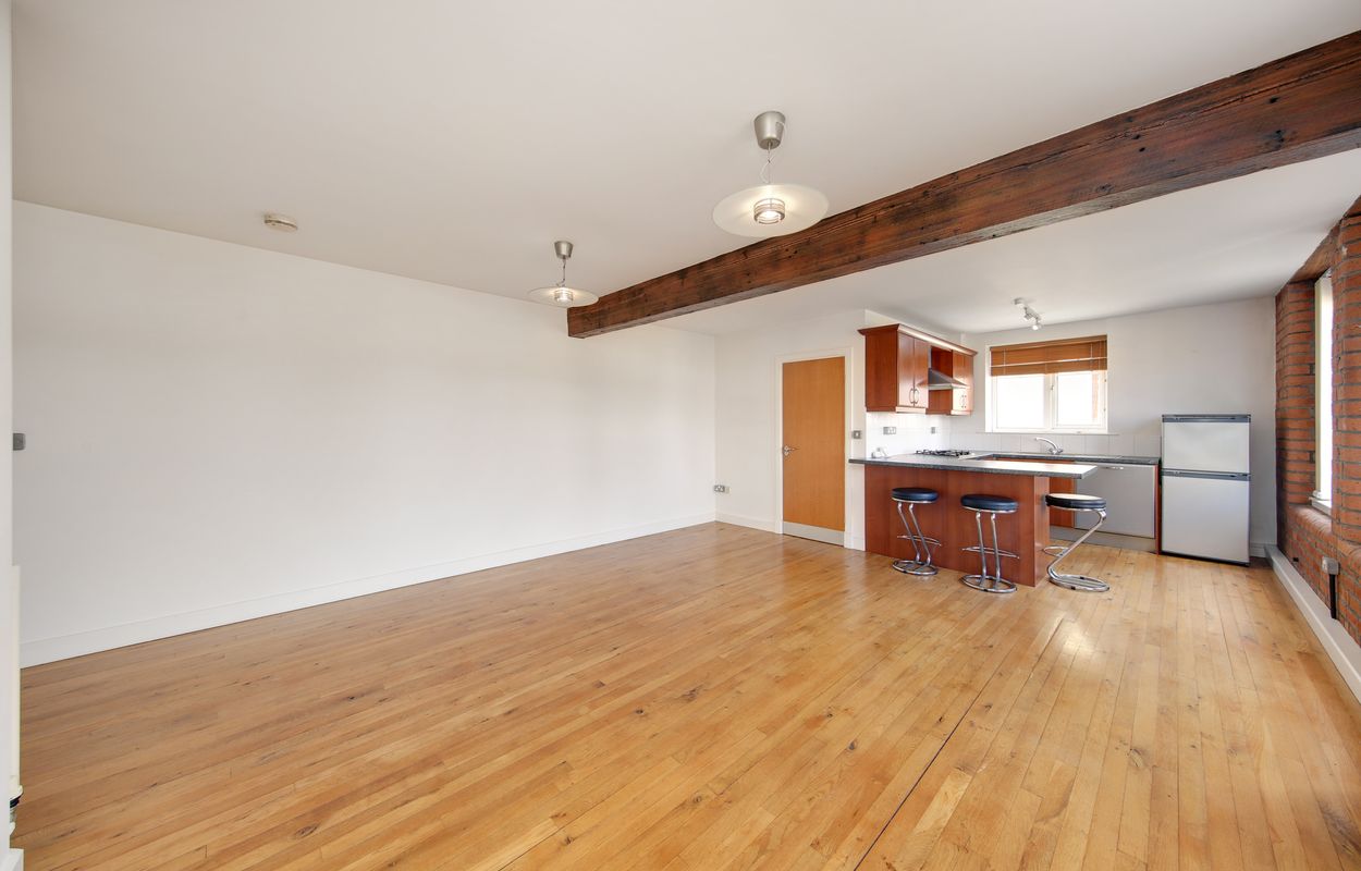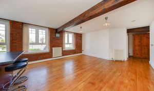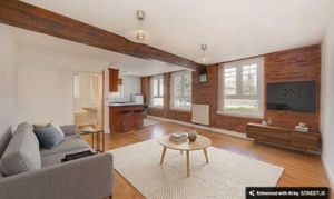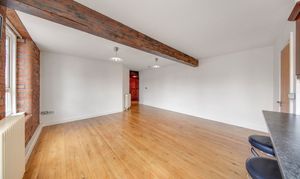 The standout space is the generous open-plan living area, where exposed brickwork and original beams bring real personality. There’s plenty of room for both living and dining, while the fitted kitchen and breakfast bar keep the layout feeling sociable and easy to use day to day, complete with an oven, hob, extractor fan, washer, and fridge.