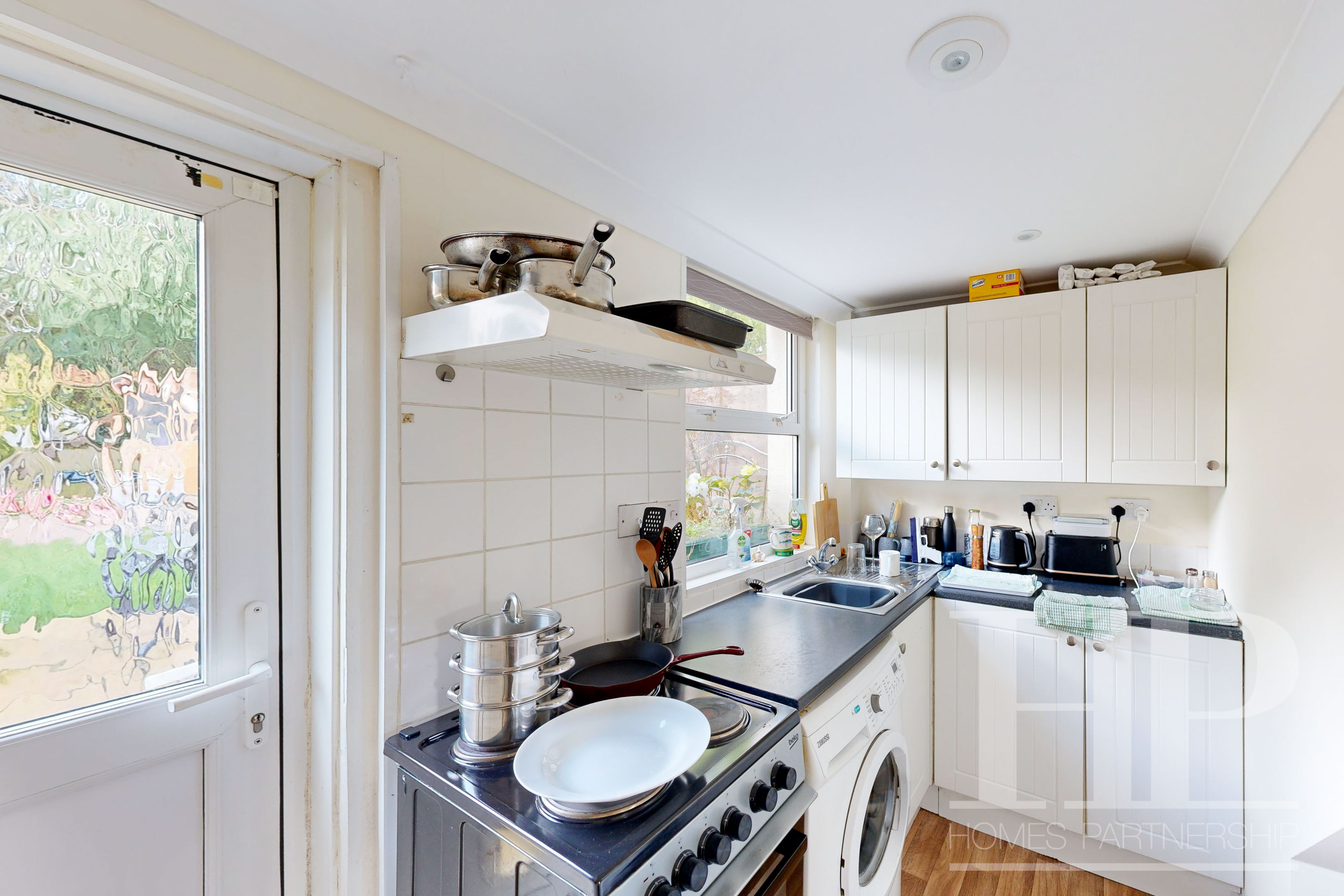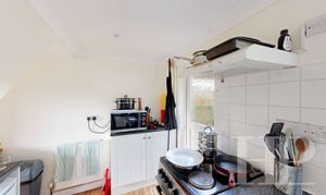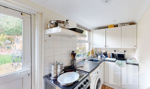 The room narrows to 1.49 m. The galley kitchen has wall and base-level units with a work surface over, incorporating a single bowl, single drainer, stainless steel unit with mixer tap, cooker, washing machine, and under-counter fridge and freezer. Radiator. Window to the rear. Door opens to the rear garden.