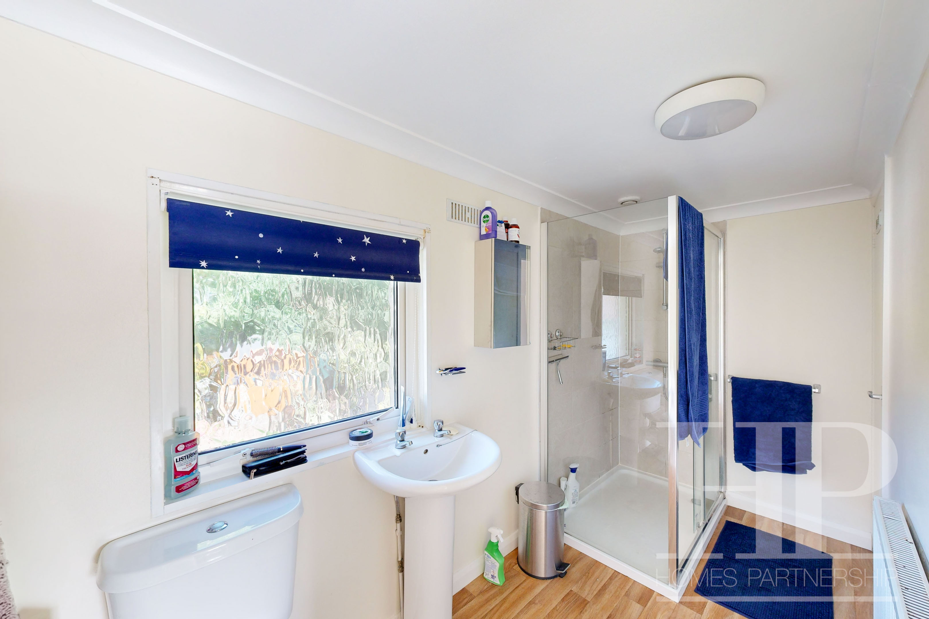 Fitted with a white suite comprising a shower cubicle, a wash hand basin, and a low-level WC. Radiator. Over stair linen/storage cupboard. Opaque window to the rear.