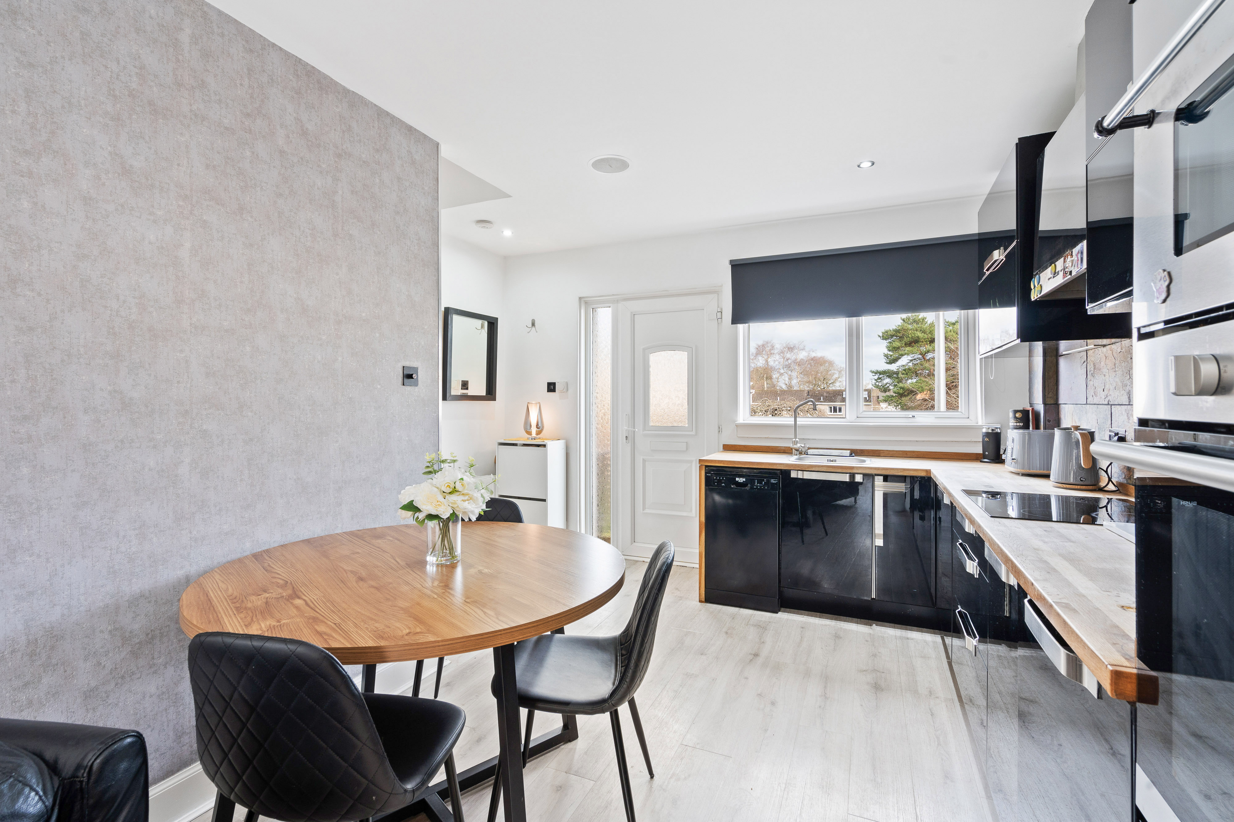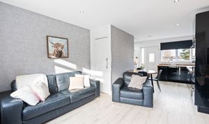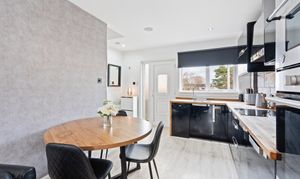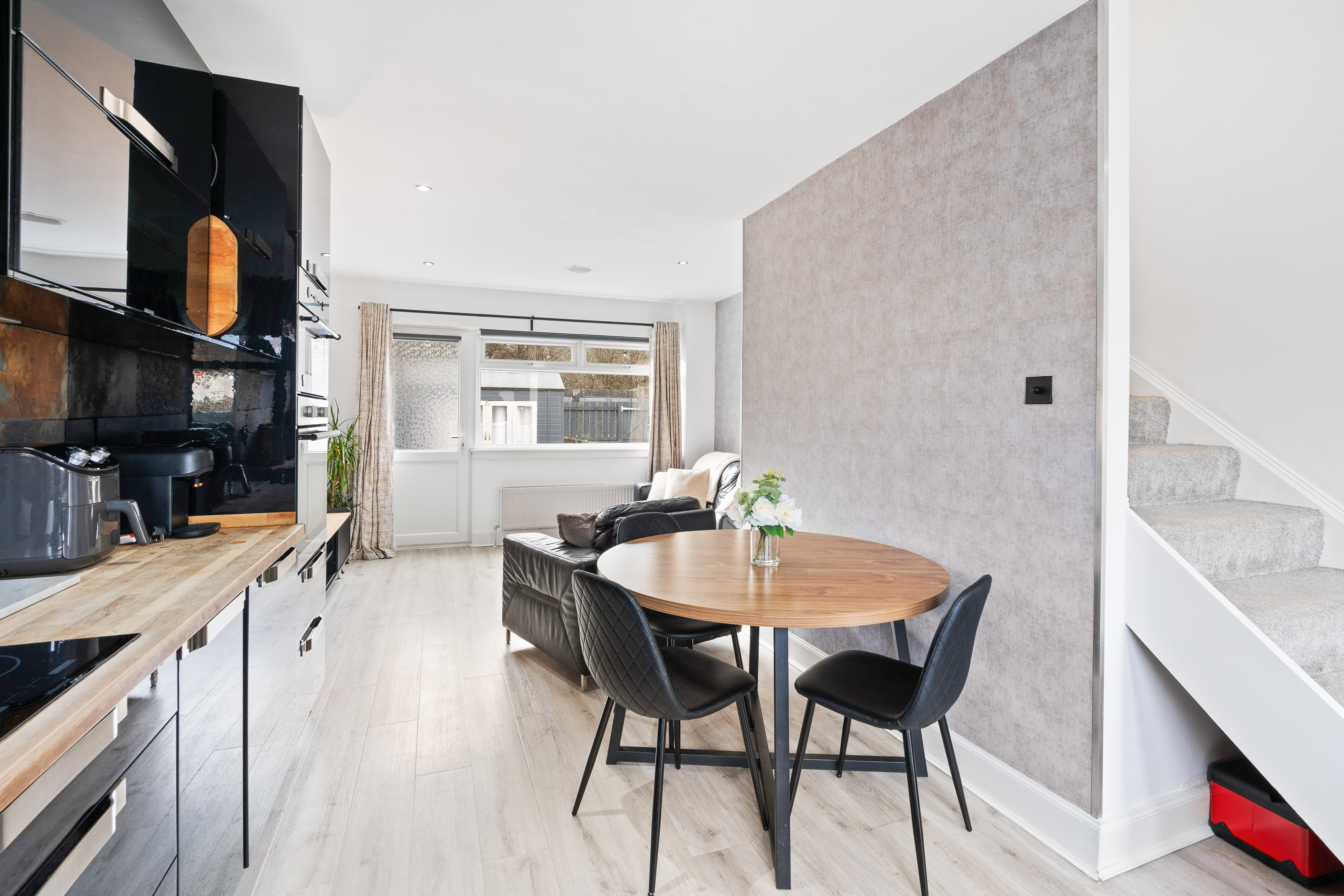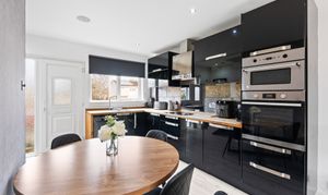 This modern and versatile family home offers a bright and welcoming interior, designed for comfortable everyday living. The heart of the property is the open-plan kitchen/diner, fitted with sleek black high-gloss units, wooden worktops, and integrated appliances including a fridge, freezer, washing machine, electric fan oven, microwave, and hob. The space flows effortlessly into the rear lounge, which enjoys a large window overlooking the enclosed garden.
