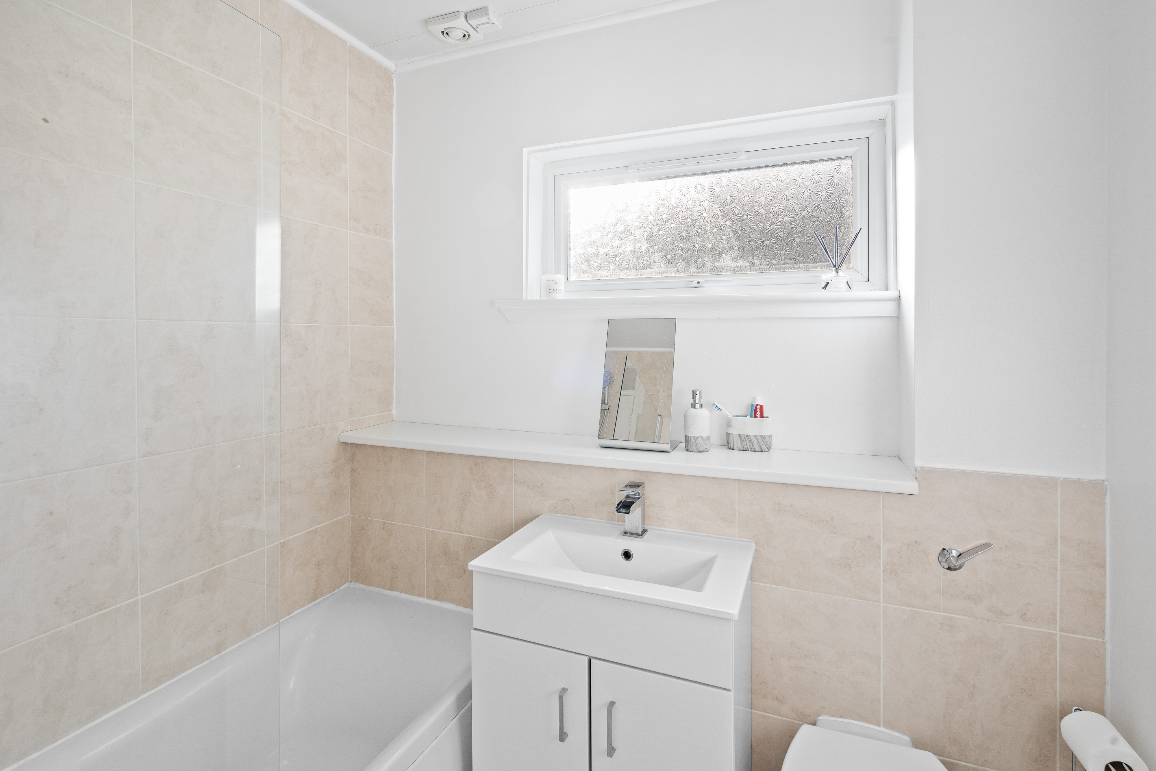 The family bathroom is positioned at the rear of the property and benefits from natural light through an opaque window. It features a modern back-to-wall W.C. and a stylish sink set into a contemporary vanity unit. A bath with a glass shower screen is fitted with a mains-operated shower, while a heated chrome towel rail adds a practical and elegant finishing touch.