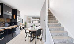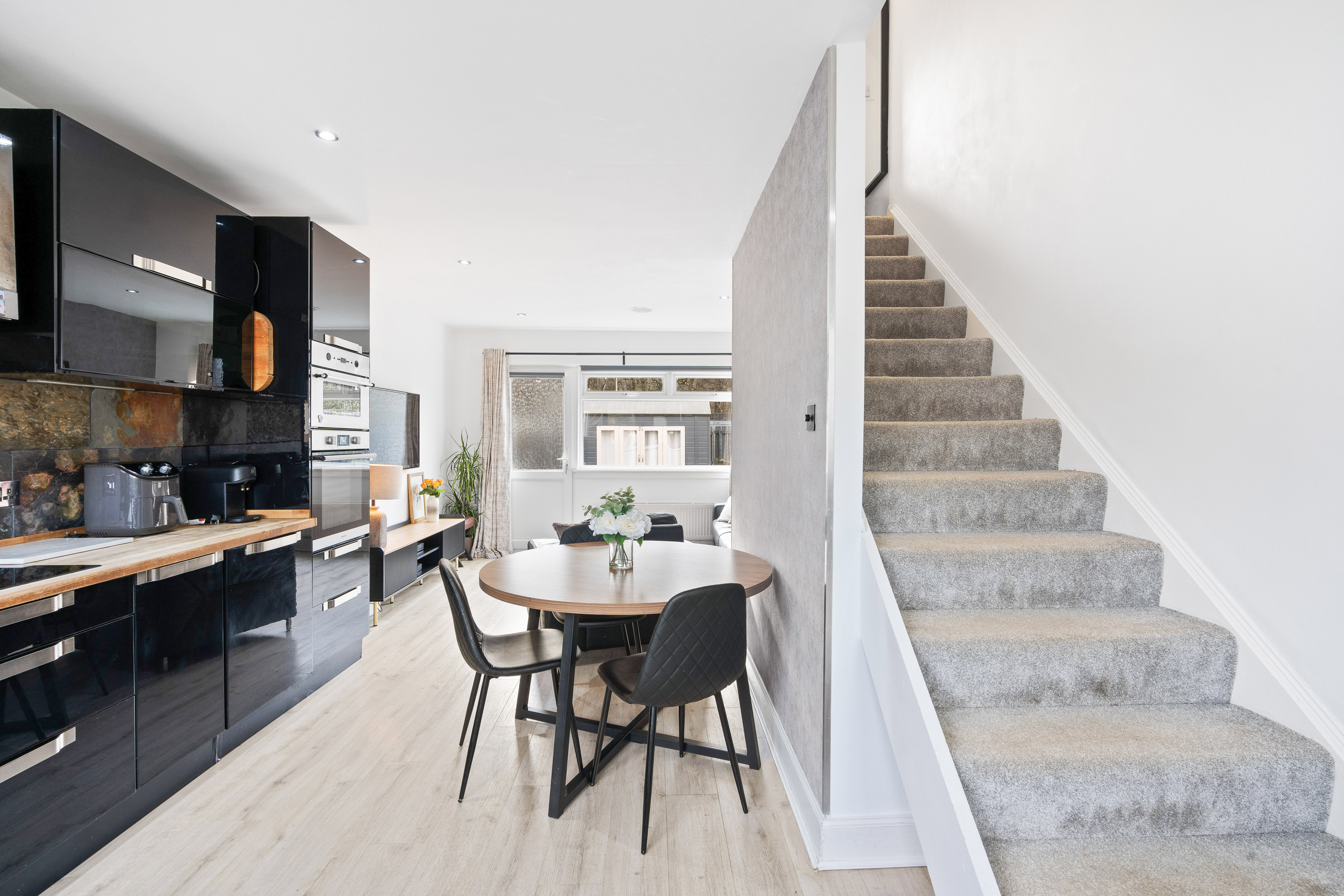 The kitchen/diner is a stylish, sociable space open plan to the lounge and forming the heart of the home. Entered directly from the front, it creates a bright and welcoming first impression. Fitted with sleek black high-gloss units and warm wooden worktops, it offers excellent storage and preparation space. Integrated appliances include a fridge, freezer, washing machine, electric fan oven, microwave and electric hob, all neatly concealed for a seamless finish. The generous layout easily accommodates a dining table and flows through to the lounge and rear door leading to the garden. A staircase within the room provides access to the first-floor accommodation.