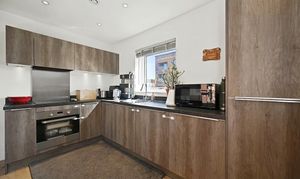 The heart of the home is the spacious open plan kitchen, living, and dining area, providing a bright and comfortable space for both relaxing and entertaining. The living area also benefits from direct access to a private balcony. The modern kitchen is well-appointed with a range of wall and base units, along with integrated appliances.