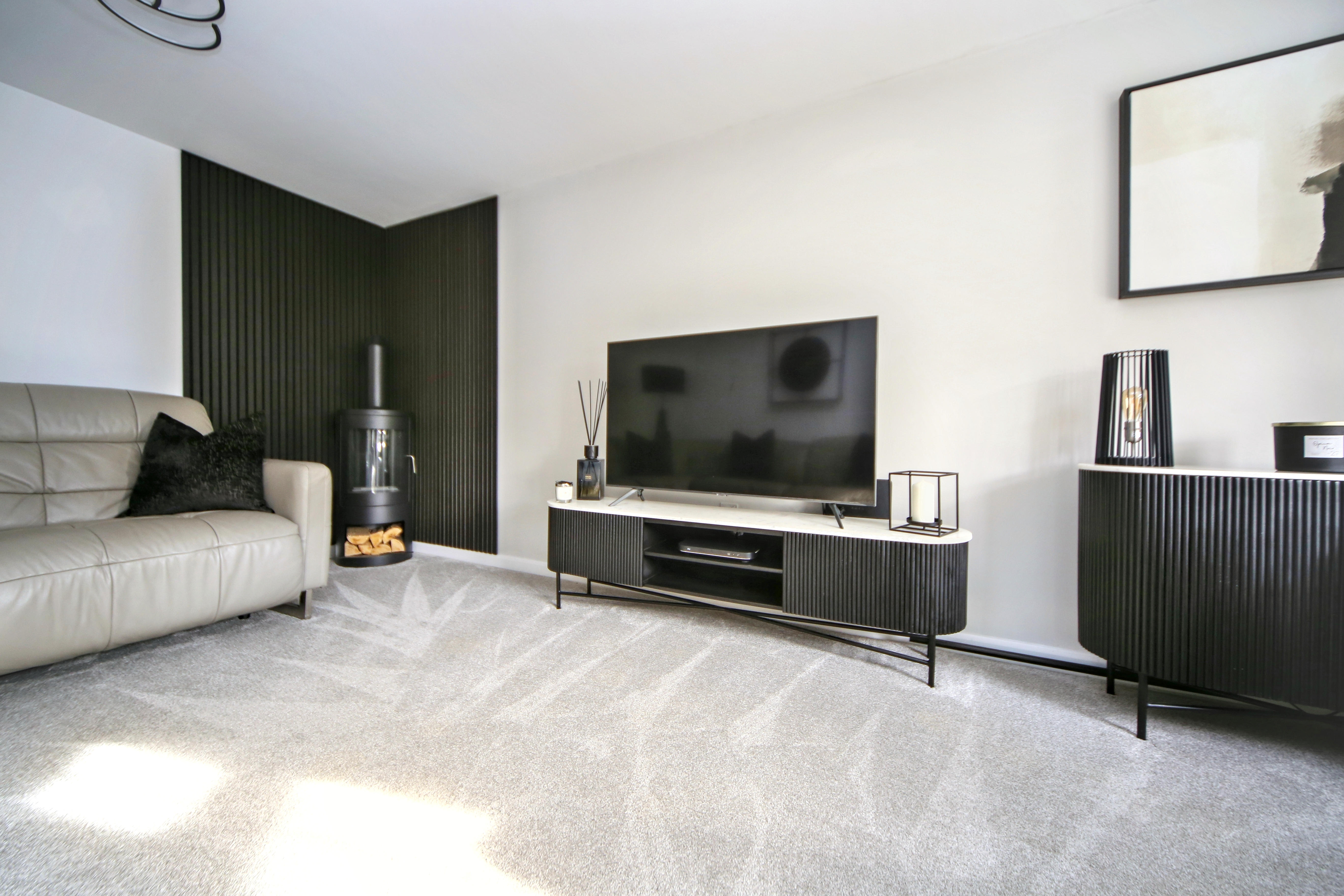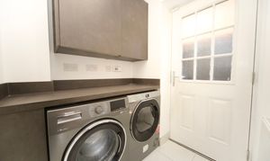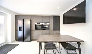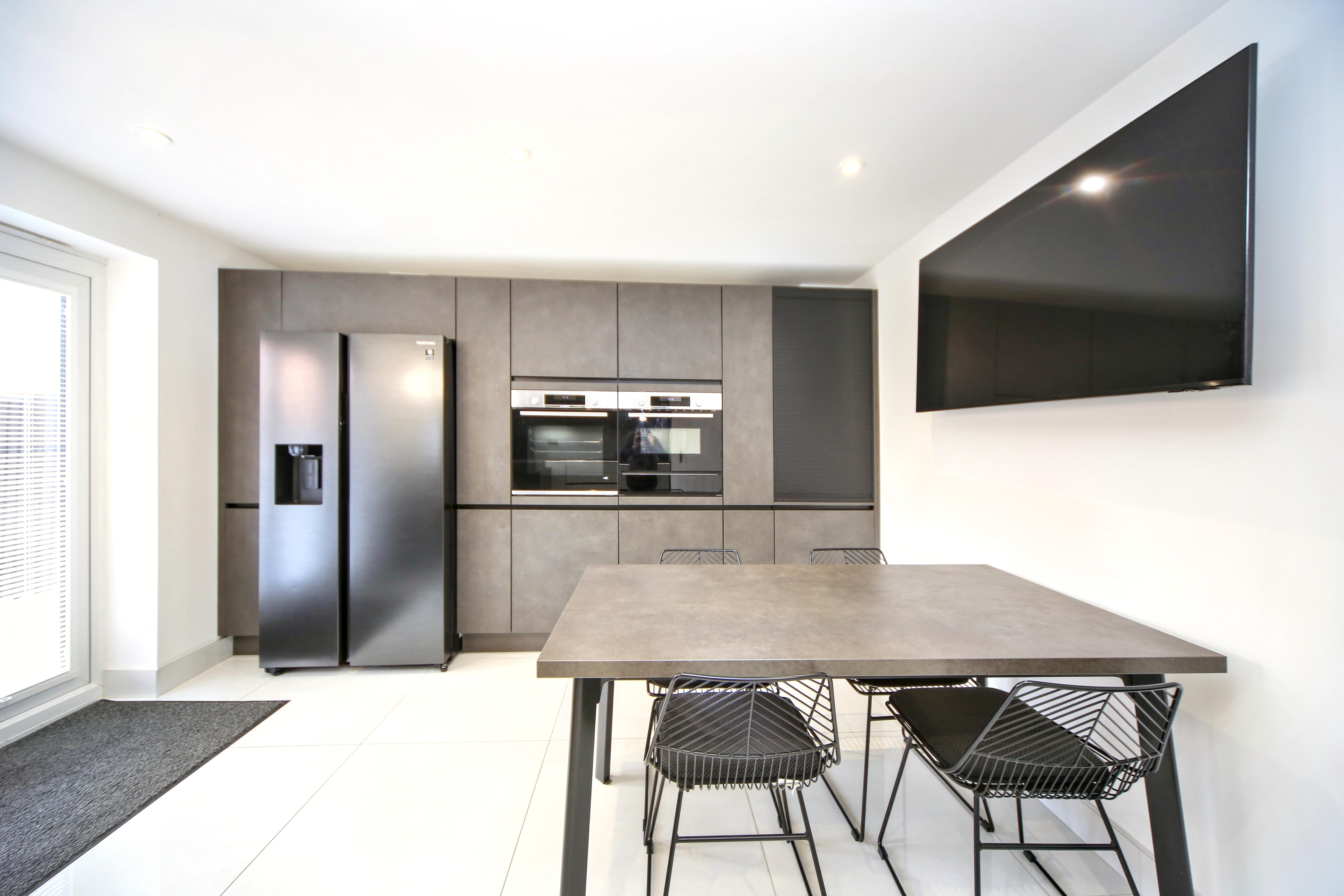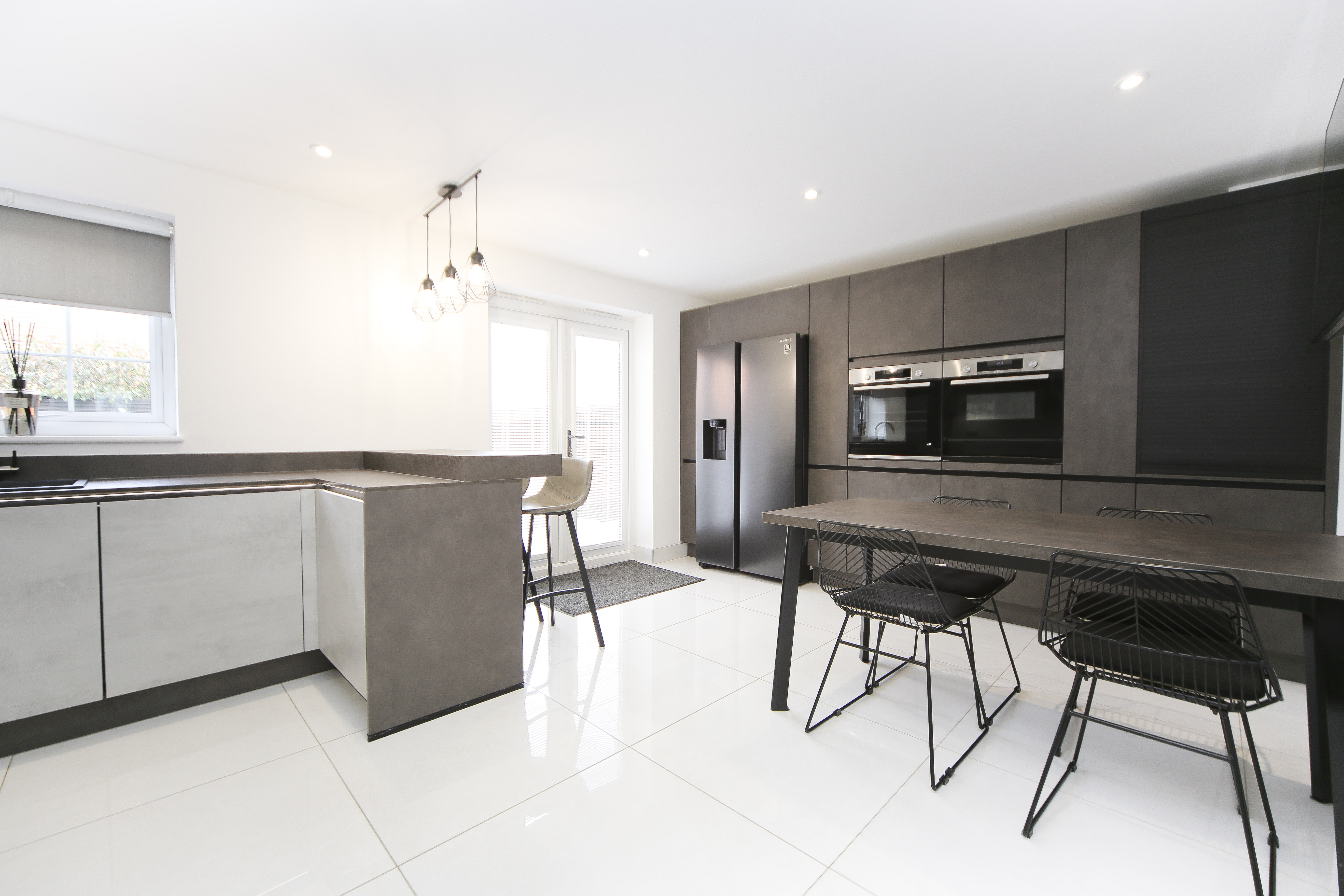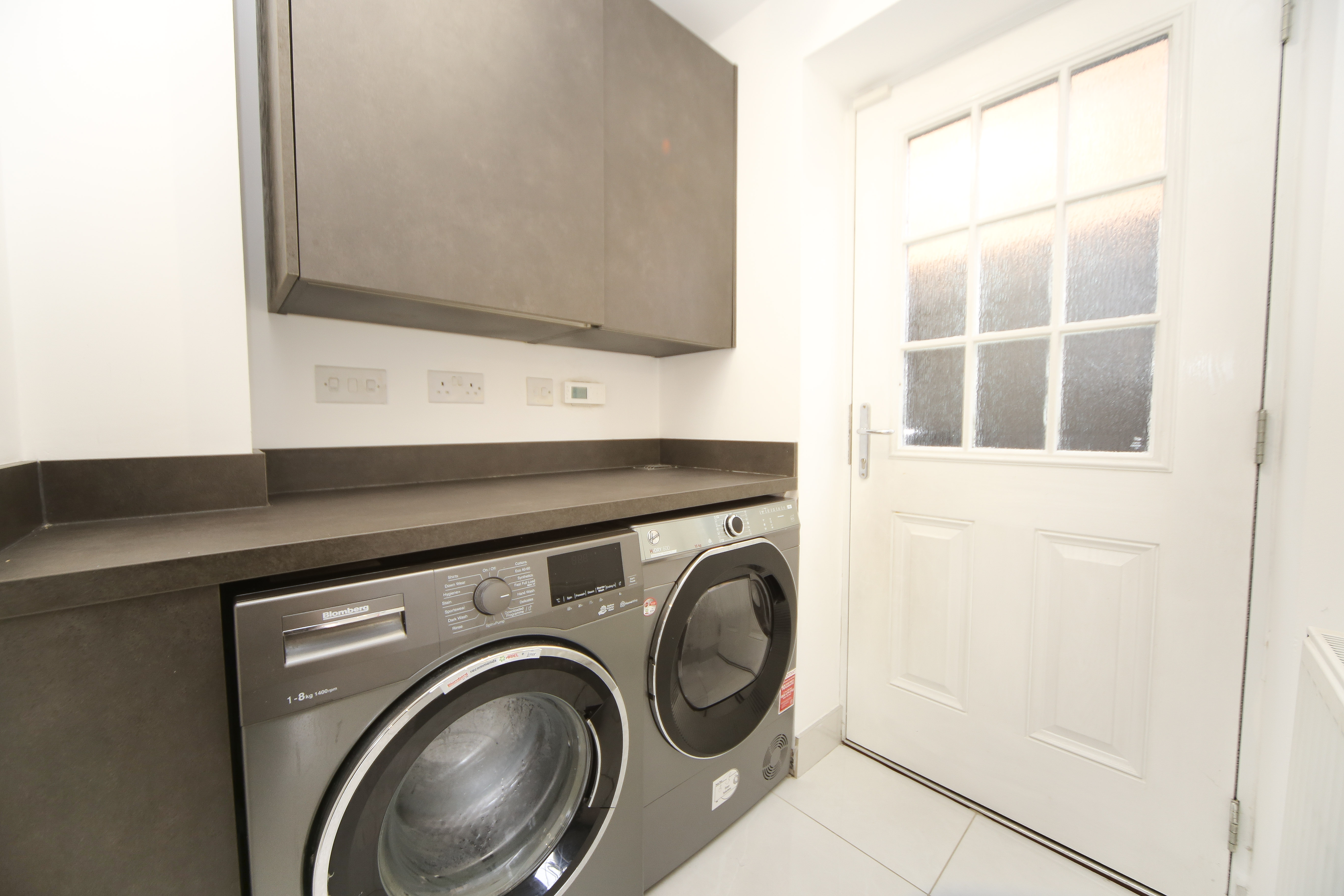 To the rear of the property, the standout feature is the large, contemporary kitchen/diner. Finished to an exceptional standard, this modern space is fitted with a range of integrated appliances and offers ample room for dining and entertaining. The layout is ideal for family living, with plenty of natural light and direct access to the garden. A separate utility room provides additional storage and practicality, alongside a convenient ground floor WC.