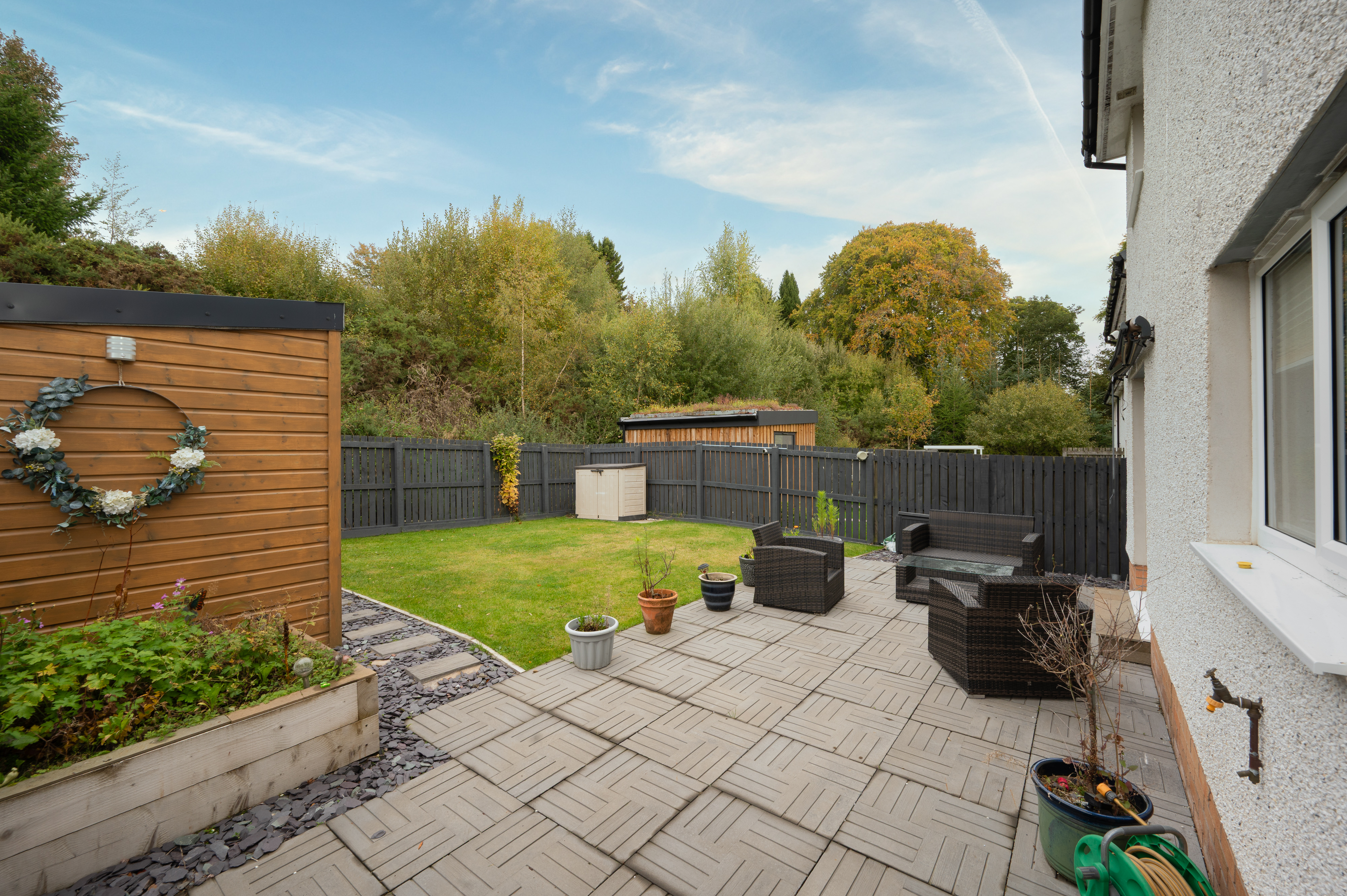 - Private, Fully Enclosed Rear Garden – Offers a level lawn, paved patio area for outdoor dining, and a timber outbuilding with power and lighting — perfect for a home office or studio