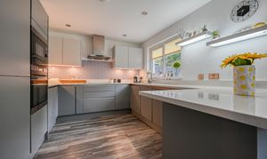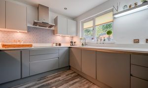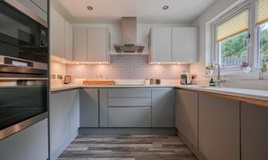 - Modern Designer Kitchen – Featuring sleek fitted units, integrated appliances, a breakfast bar, and direct access to the utility room and garden