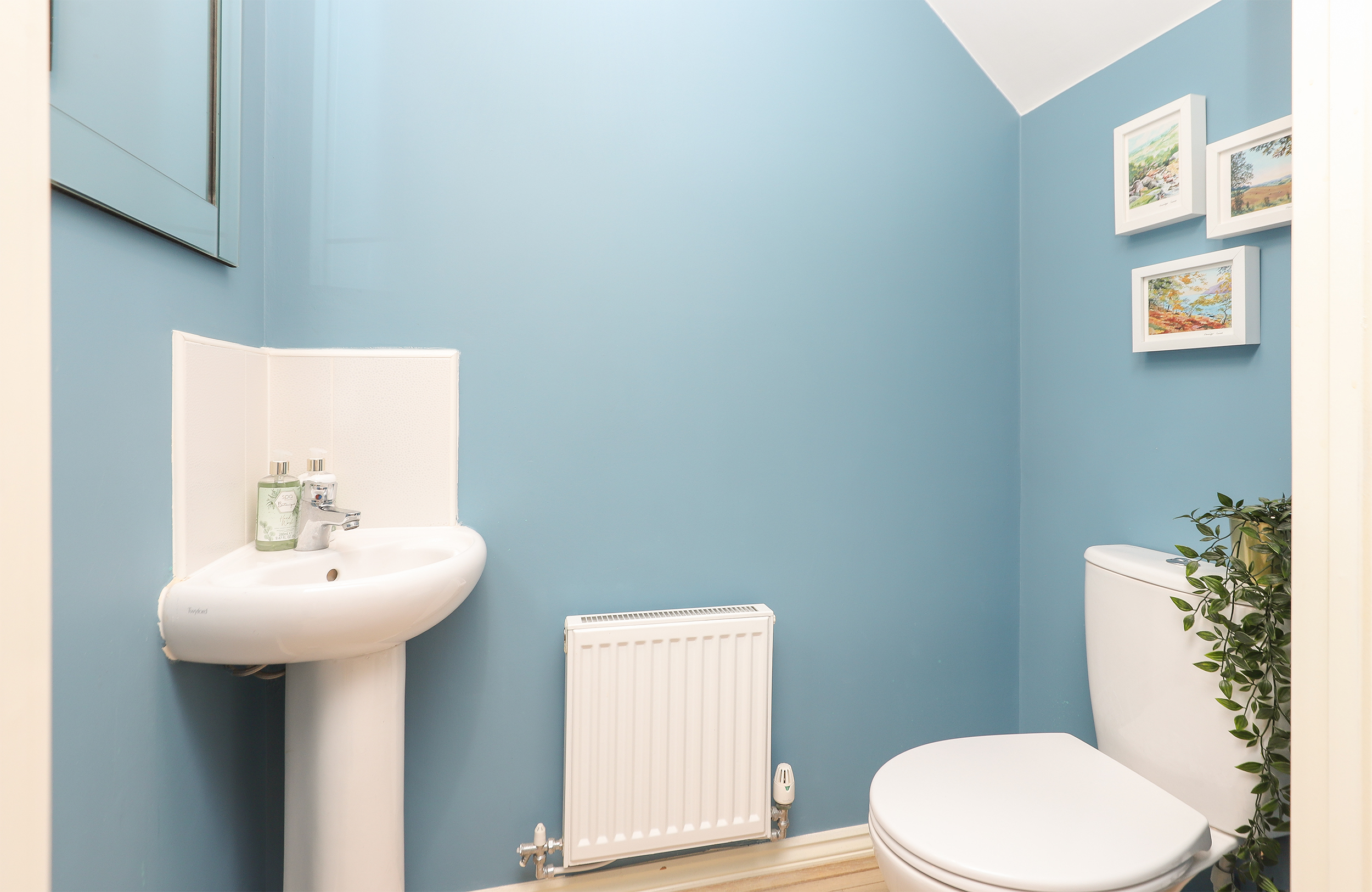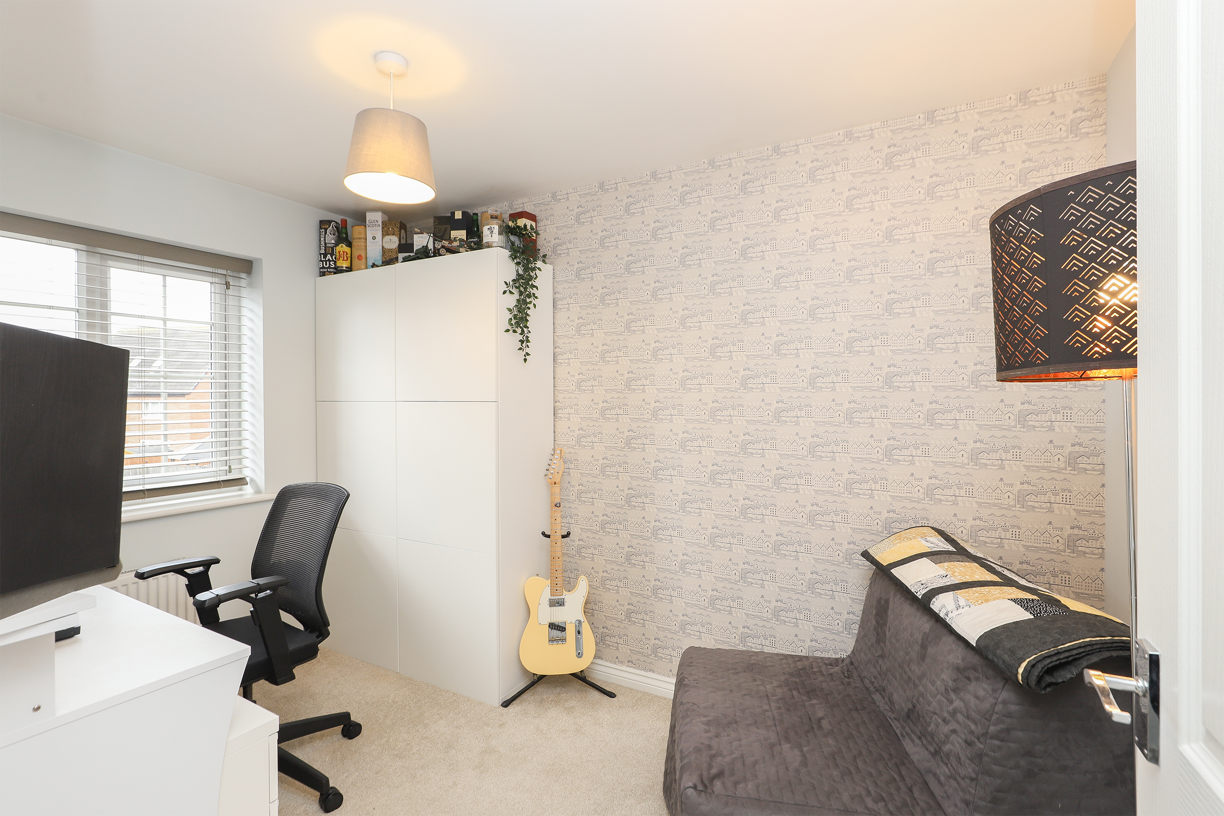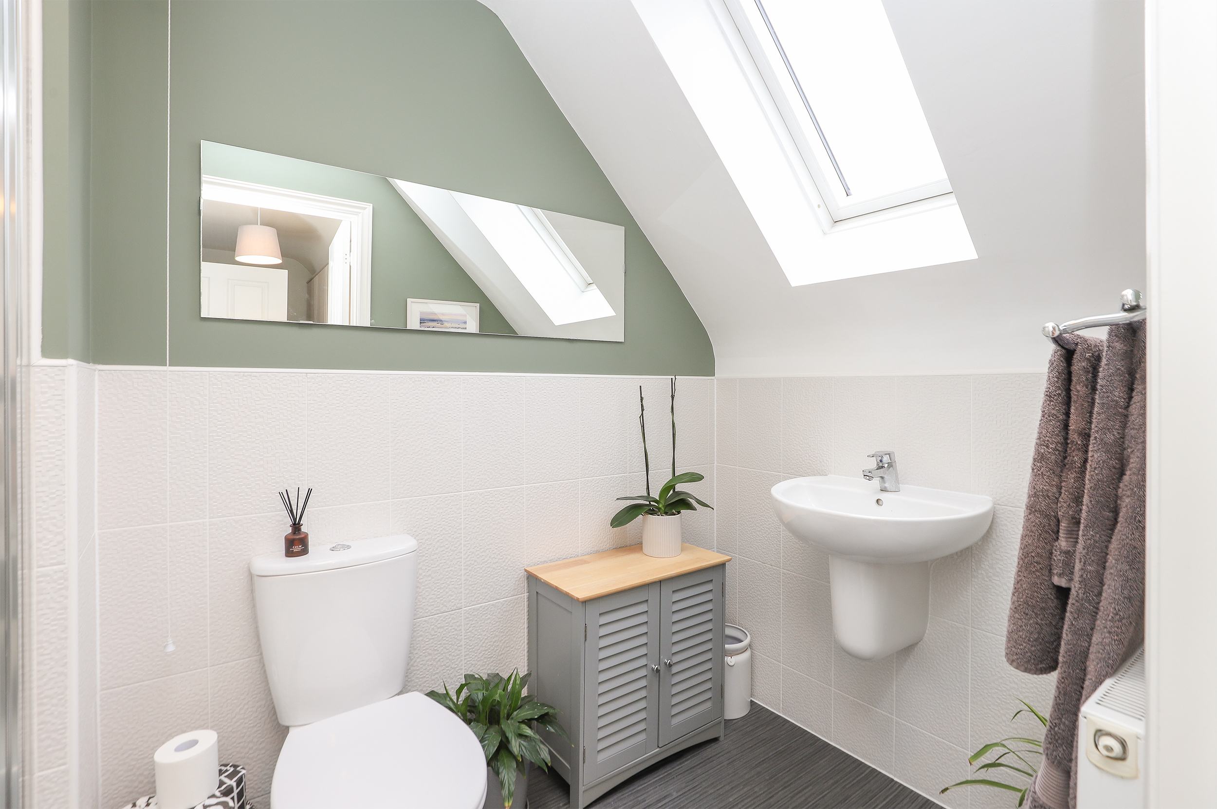 The three bedrooms are spread across the first and second floors, with the fabulous principal bedroom occupying the entire second floor, boasting an en-suite shower room and fitted wardrobes. The two further bedrooms on the first floor are equally well-appointed, with one enjoying fitted wardrobes and the other offering flexibility to the modern family as a home office space. A family bathroom complements the bedrooms with a three-piece suite, alongside a ground floor w/c adding to day to day convenience.