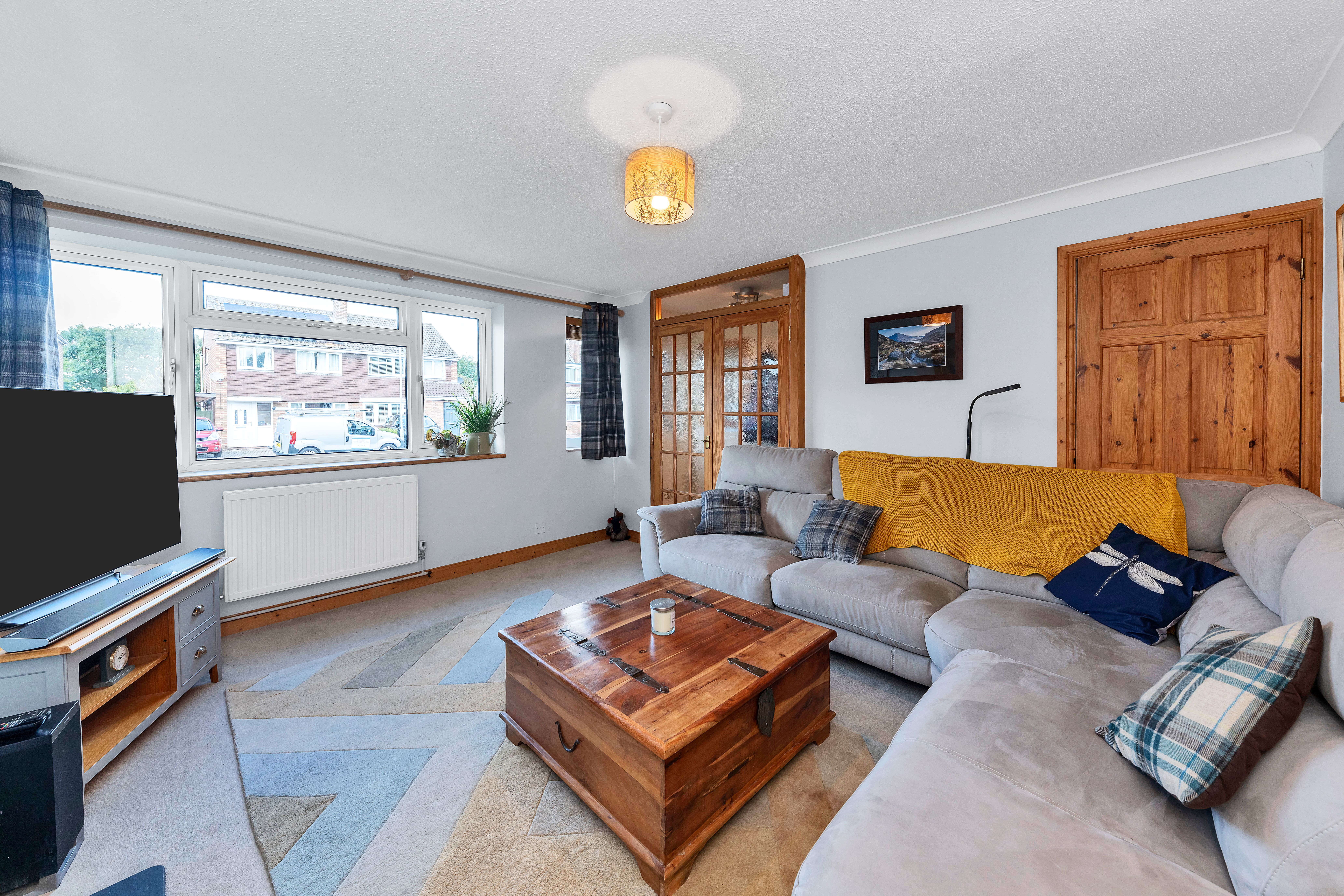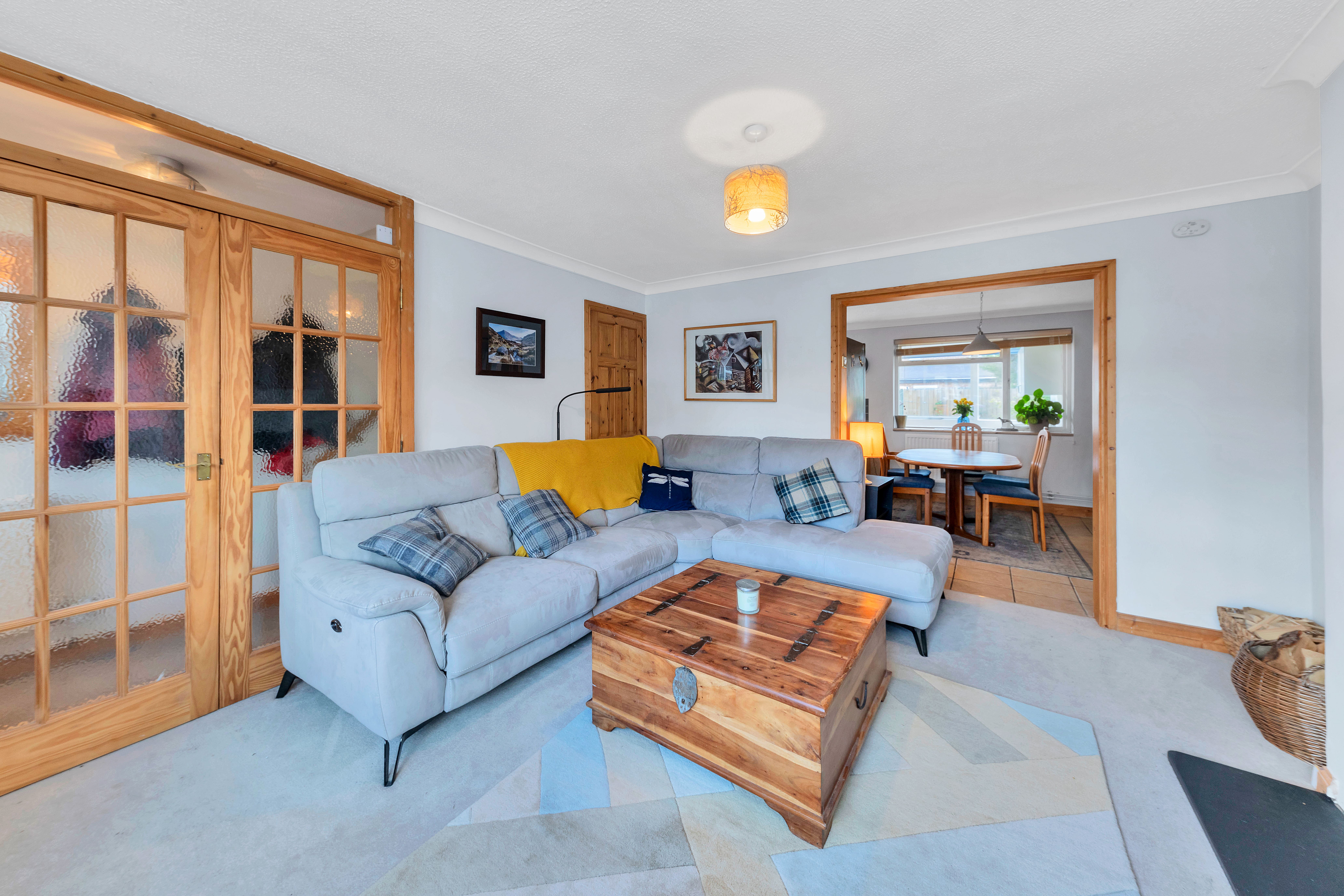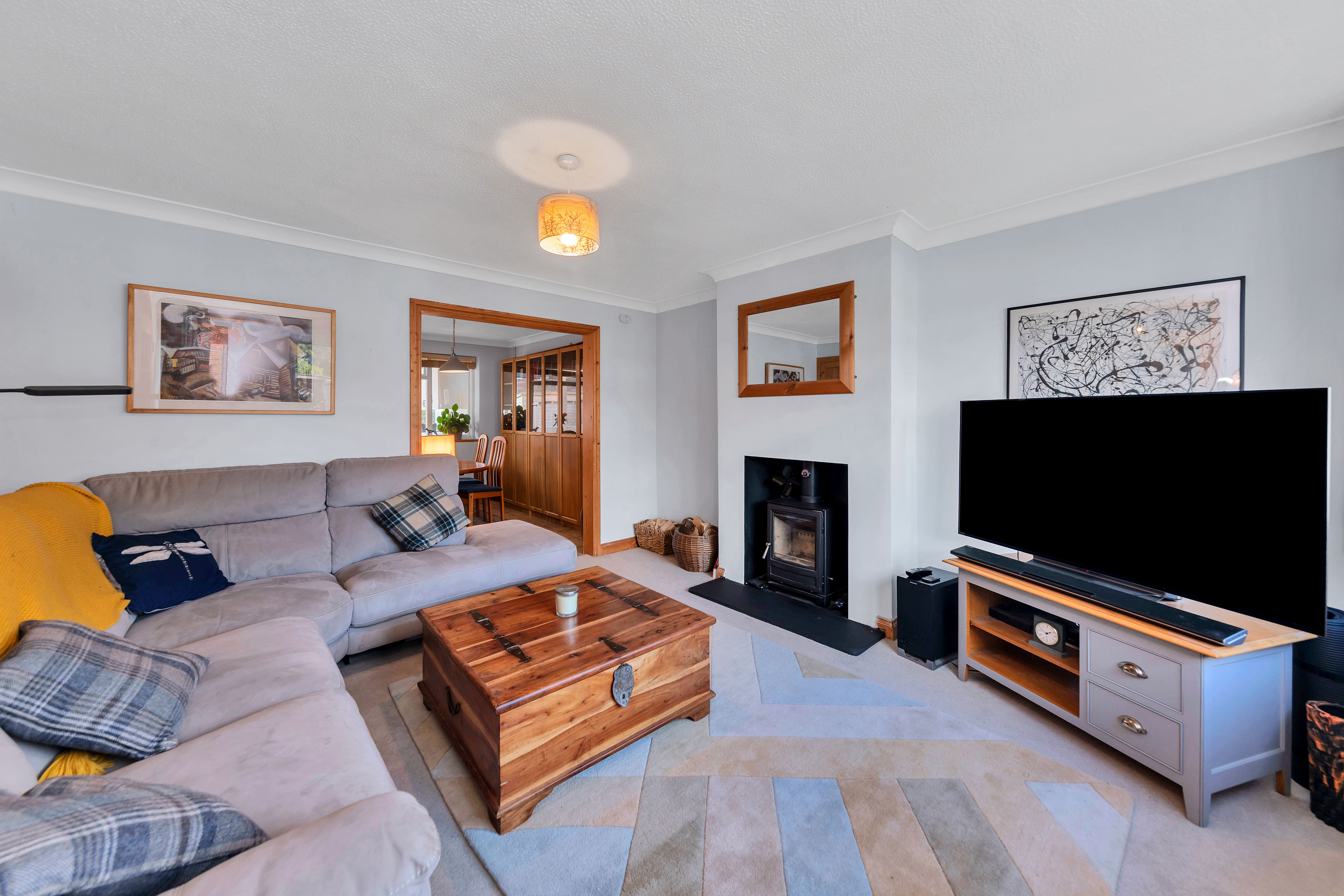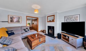 The lounge is a very good size and benefits from a large window to a front aspect, a fireplace with a wood-burning stove, integrated storage, pendant lighting, carpets and ample space for a variety of lounge and storage furniture.