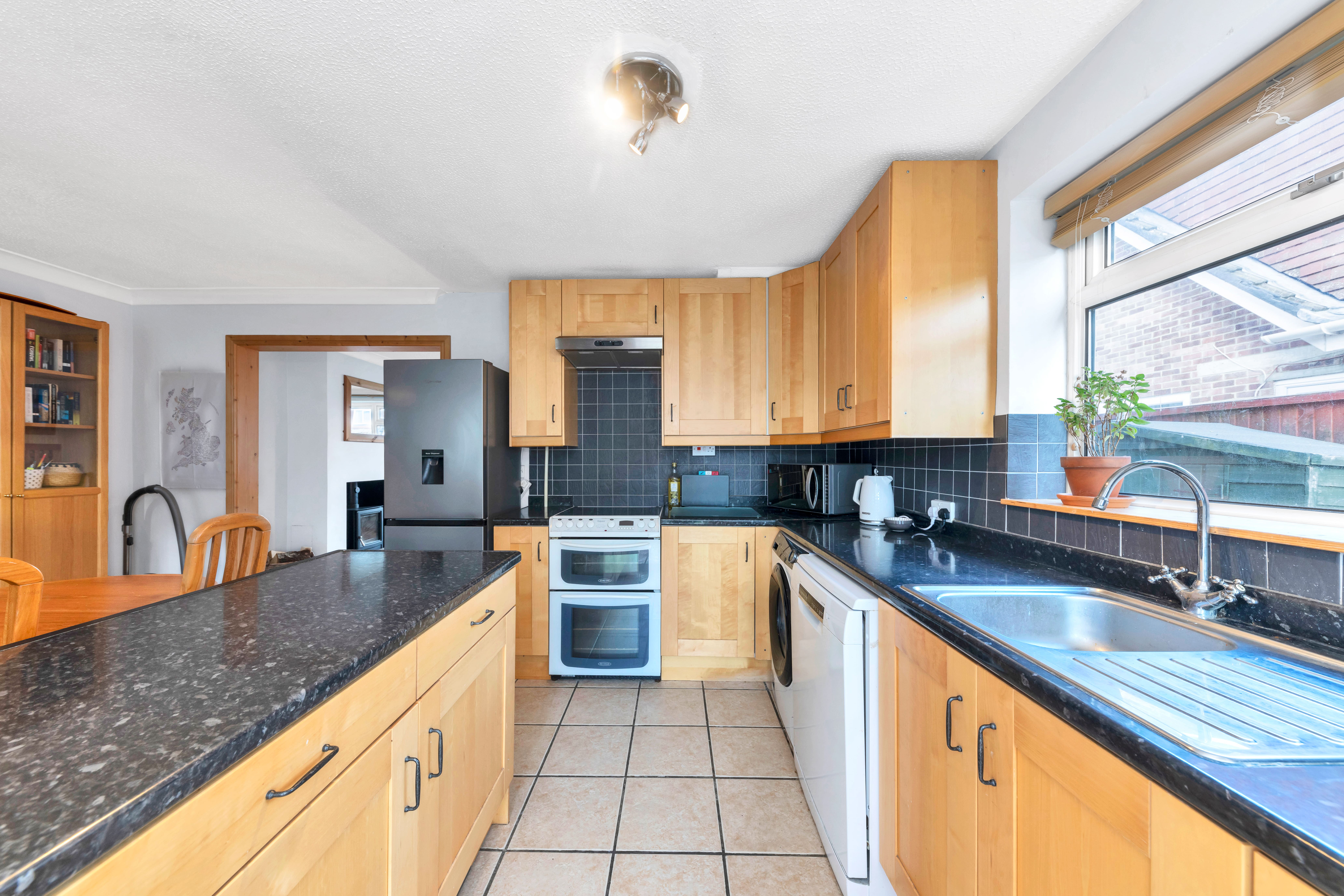 Through an archway, the kitchen/dining room is wonderfully open-plan, with windows and a door to a dual aspect, pendant and spot lighting, tiled flooring and splashbacks, a range of base and wall units, laminate worktops, and space for a fridge/freezer, washing machine, dishwasher, oven, dining setting and storage furniture. The utility/boot room offers further storage, access to the rear garden, and space for laundry appliances.
