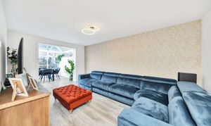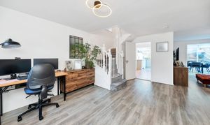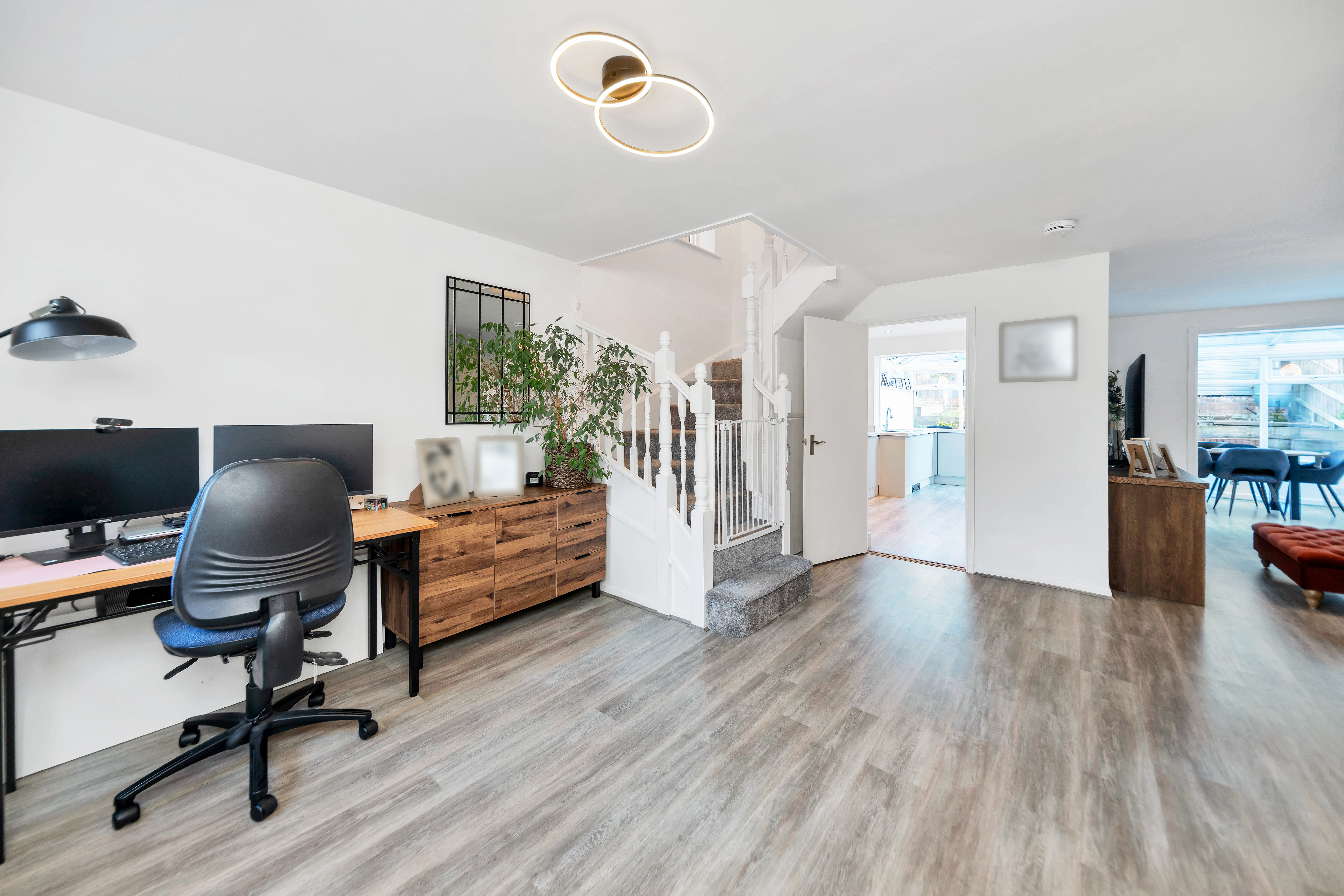 Accessed via a large archway from the kitchen/diner, the lounge and study area is also a fantastic open-plan space, benefiting from wood flooring, pendant lighting, beautiful neutral decor, stairs to the first floor, and ample space for a wide variety of furniture.