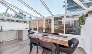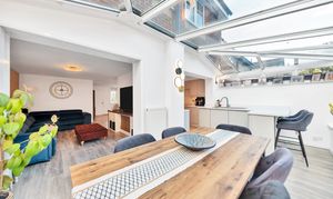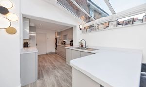 The kitchen/dining room is wonderfully open-plan, enjoying windows and double French doors to a rear aspect, wood effect flooring, sconce and inset lighting, and space for seating and furniture. The kitchen area is beautifully designed, with modern base and wall units, quartz worktops, under-cabinet lighting, an integrated double oven, hob, extractor, fridge/freezer and dishwasher, and space for other small kitchen appliances.