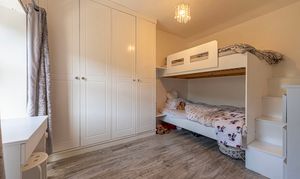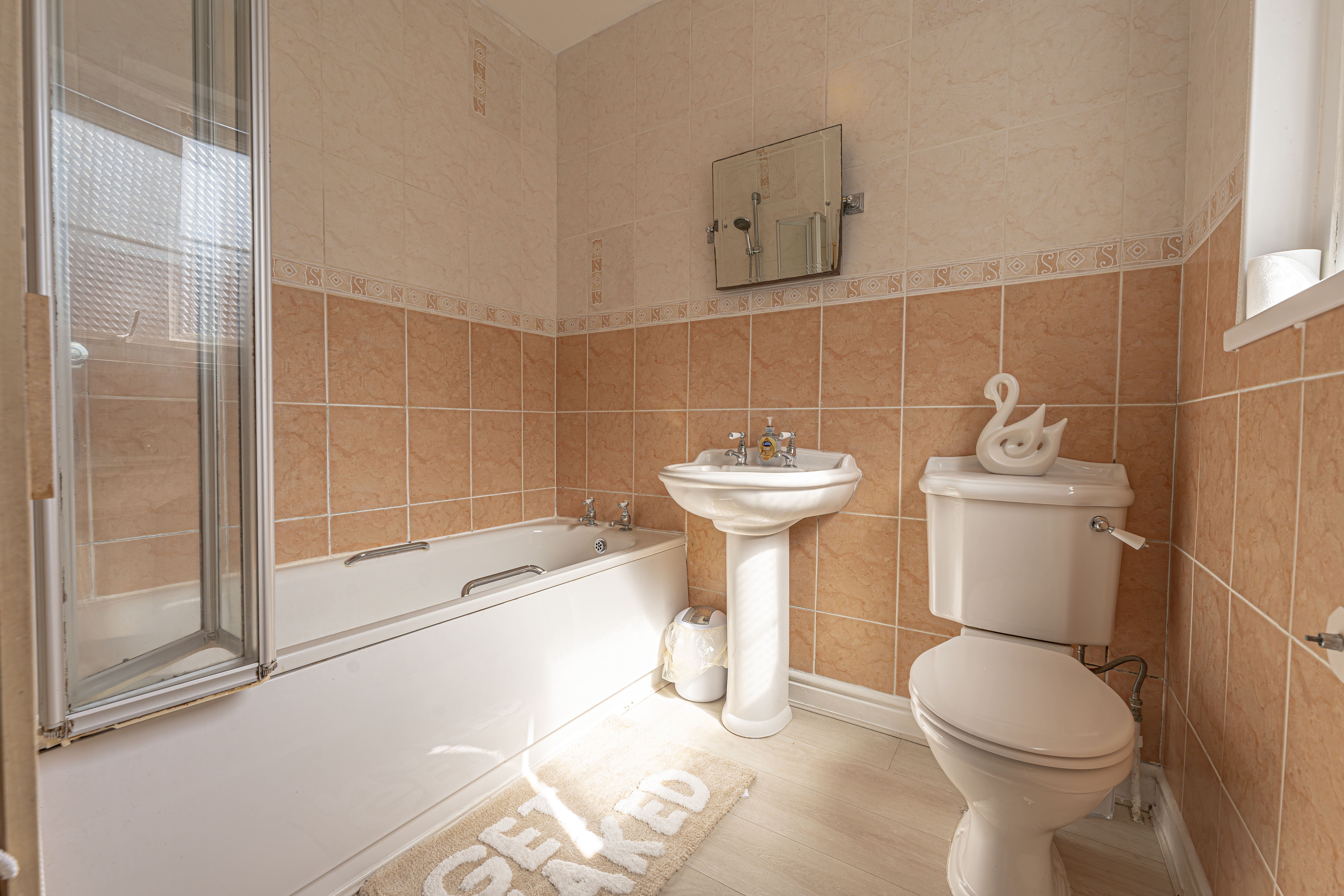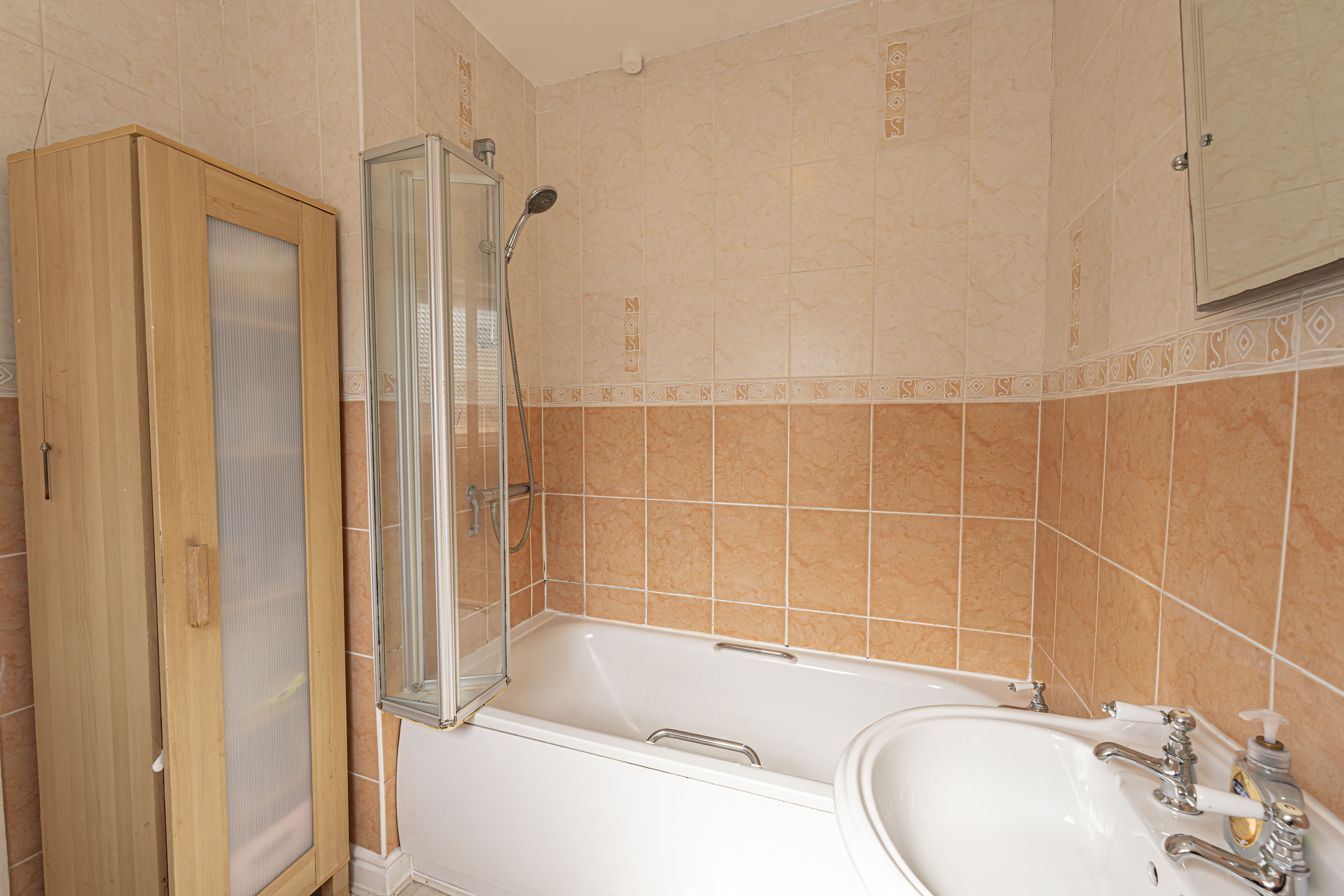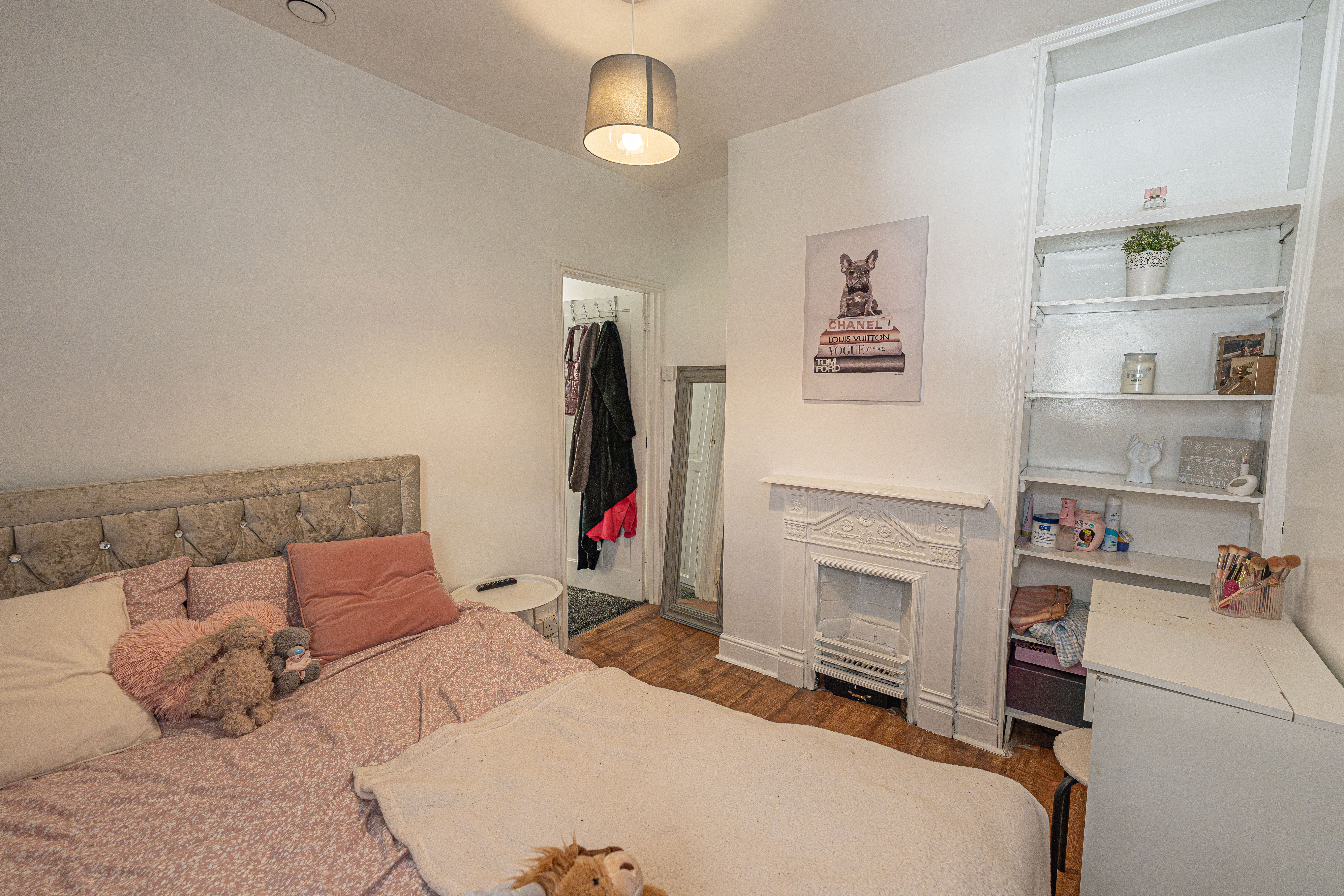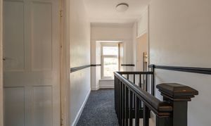 To the first floor we have three bedrooms, which are all double rooms, sharing an airing cupboard from the hallway, and the family bathroom with a shower over bath suite. One of the bedrooms benefits from a fitted wardrobe for easy storage, while another boasts a period fireplace and fitted shelving.