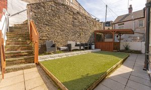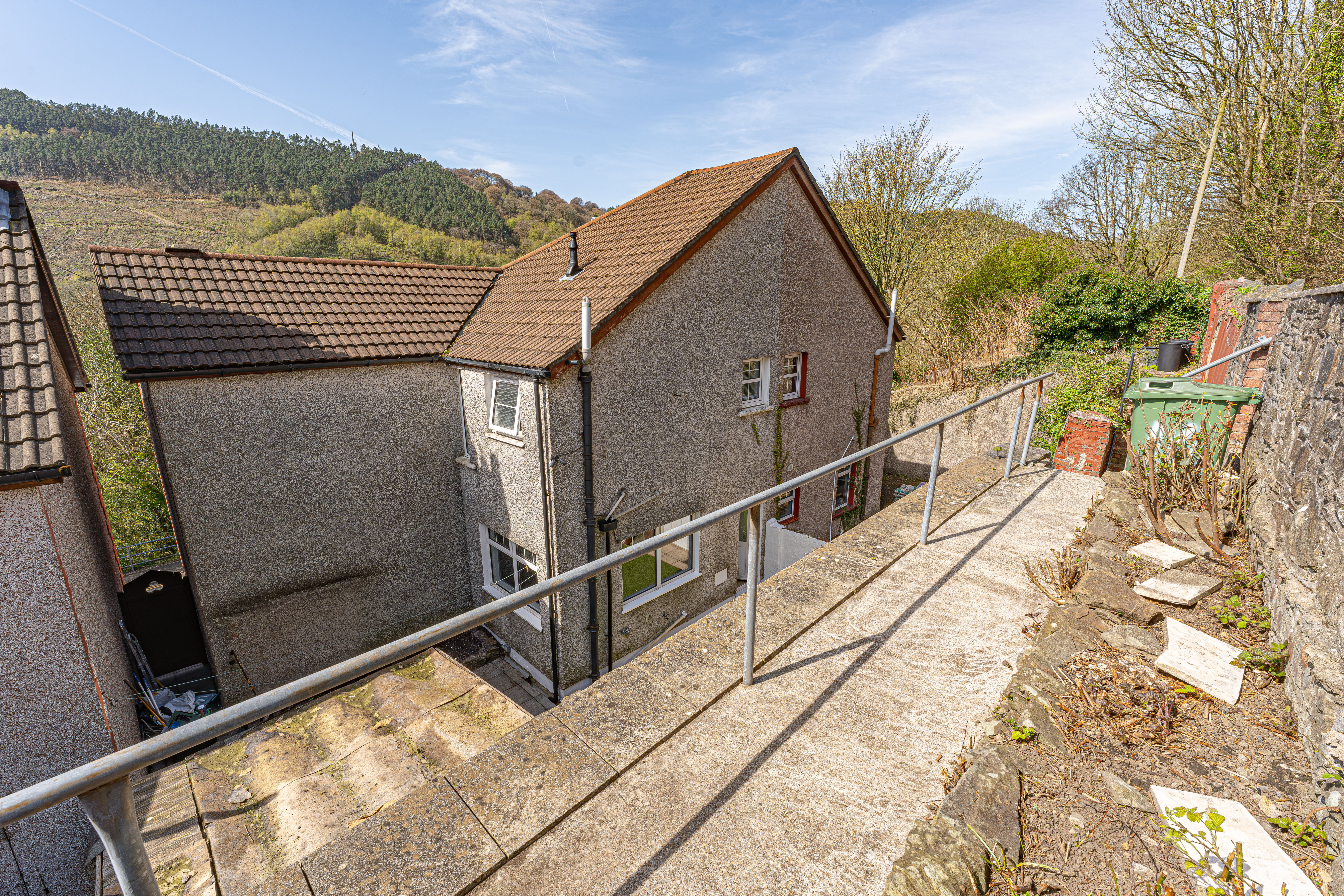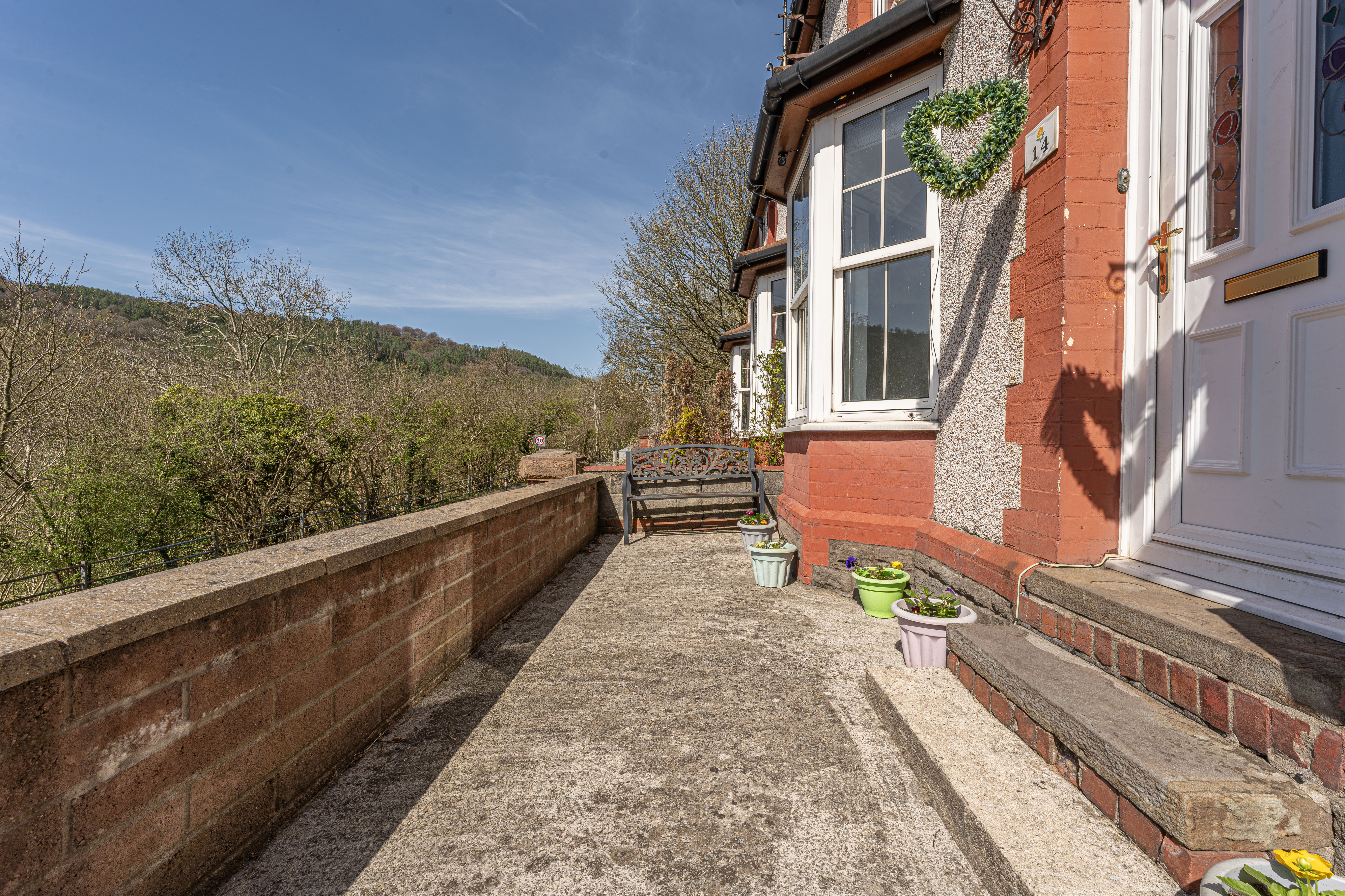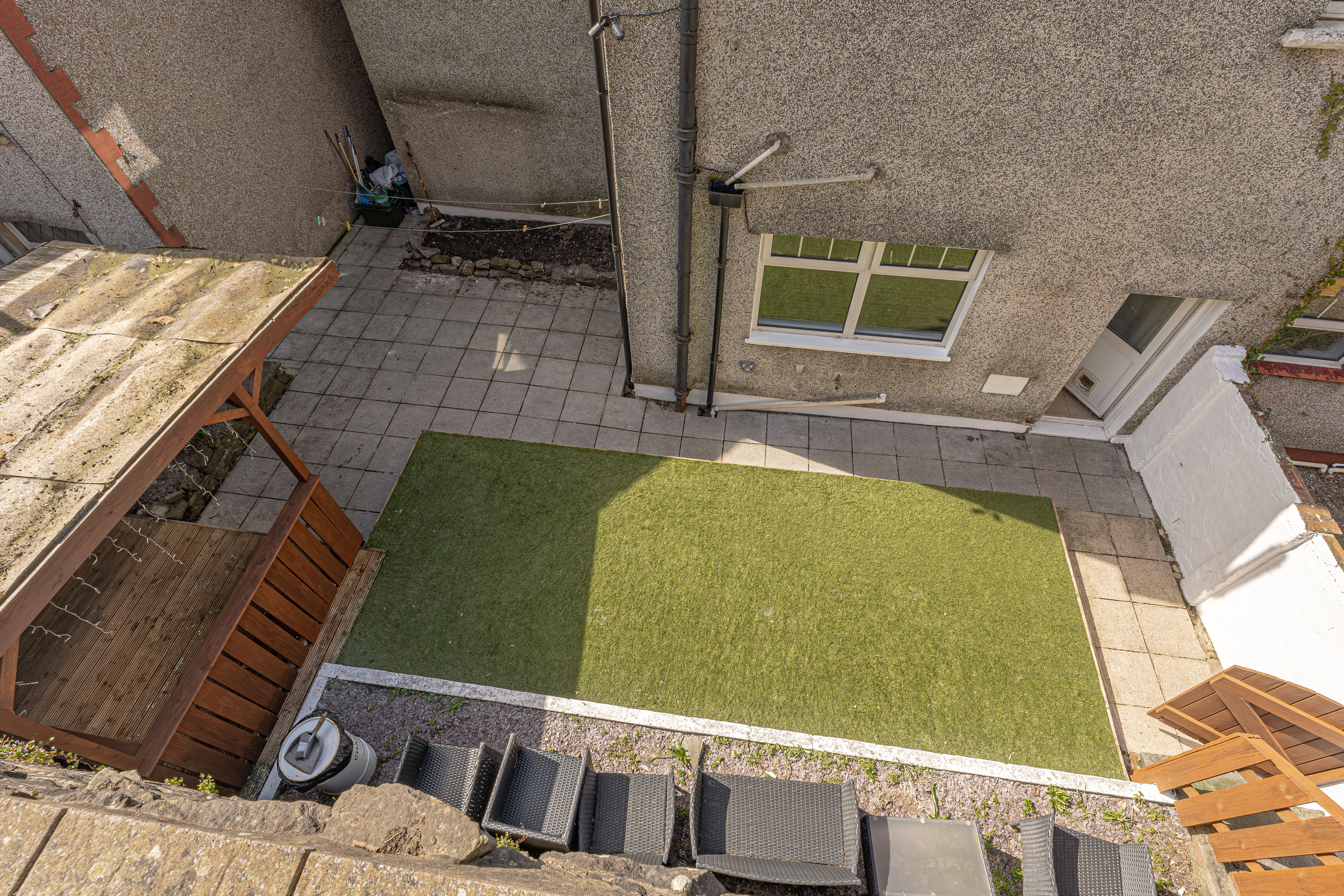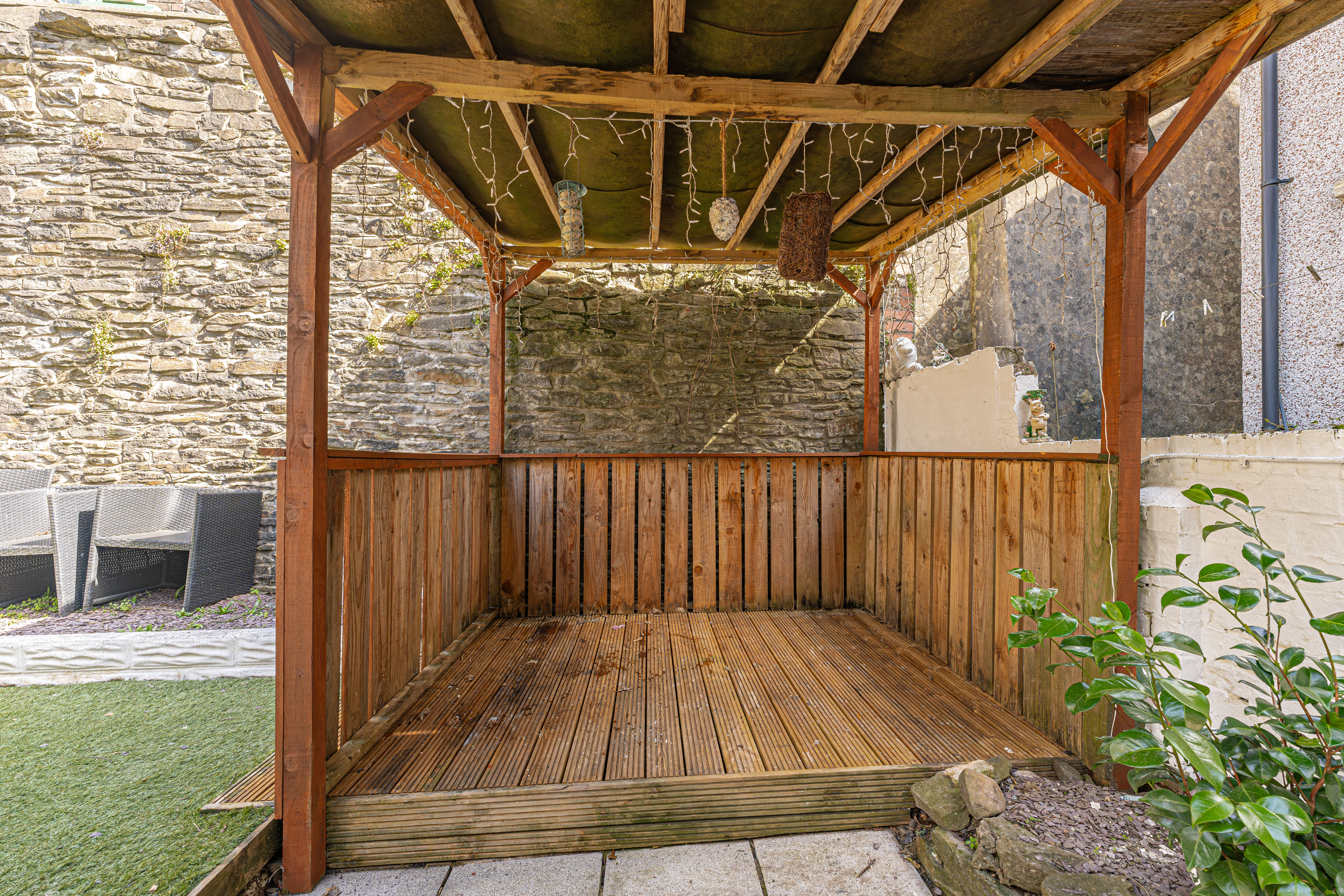Stepping outside we arrive at the rear garden, which blends artificial lawn and patio space to create an idyllic low maintenance retreat that is ideal for relaxing and entertaining guests. A covered wooden gazebo highlights another perfect space for residents to enjoy dining al-fresco style, with a side walkway that is great for bin storage. The garden continues with a steep staircase above, elevating us to an additional patio space overlooking the house below, while also opening out to the road beyond. At the front of the house we can find a separate patio space at the front of the terrace, providing a beautiful view of the surrounding countryside, with on-road parking readily available below.