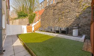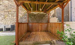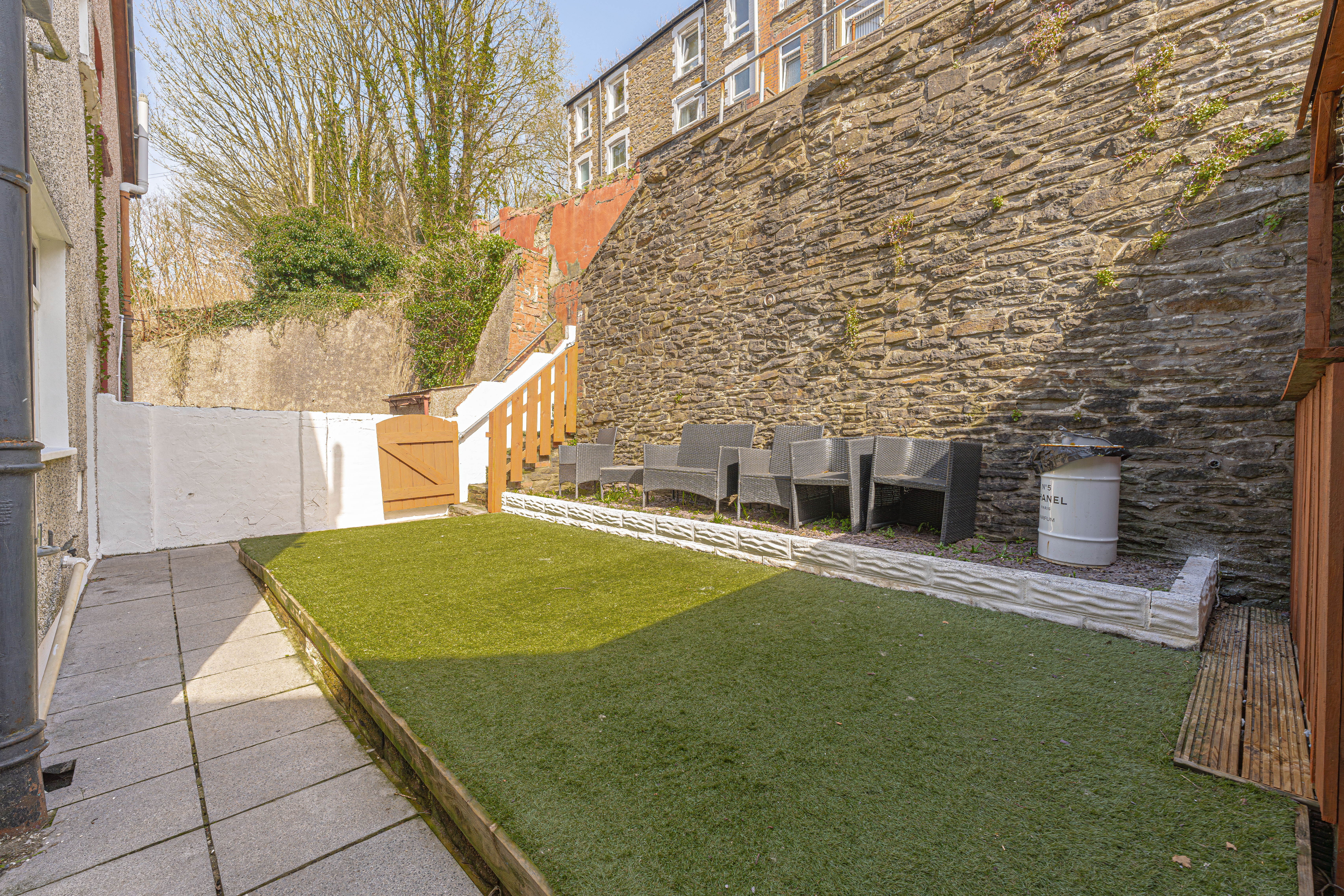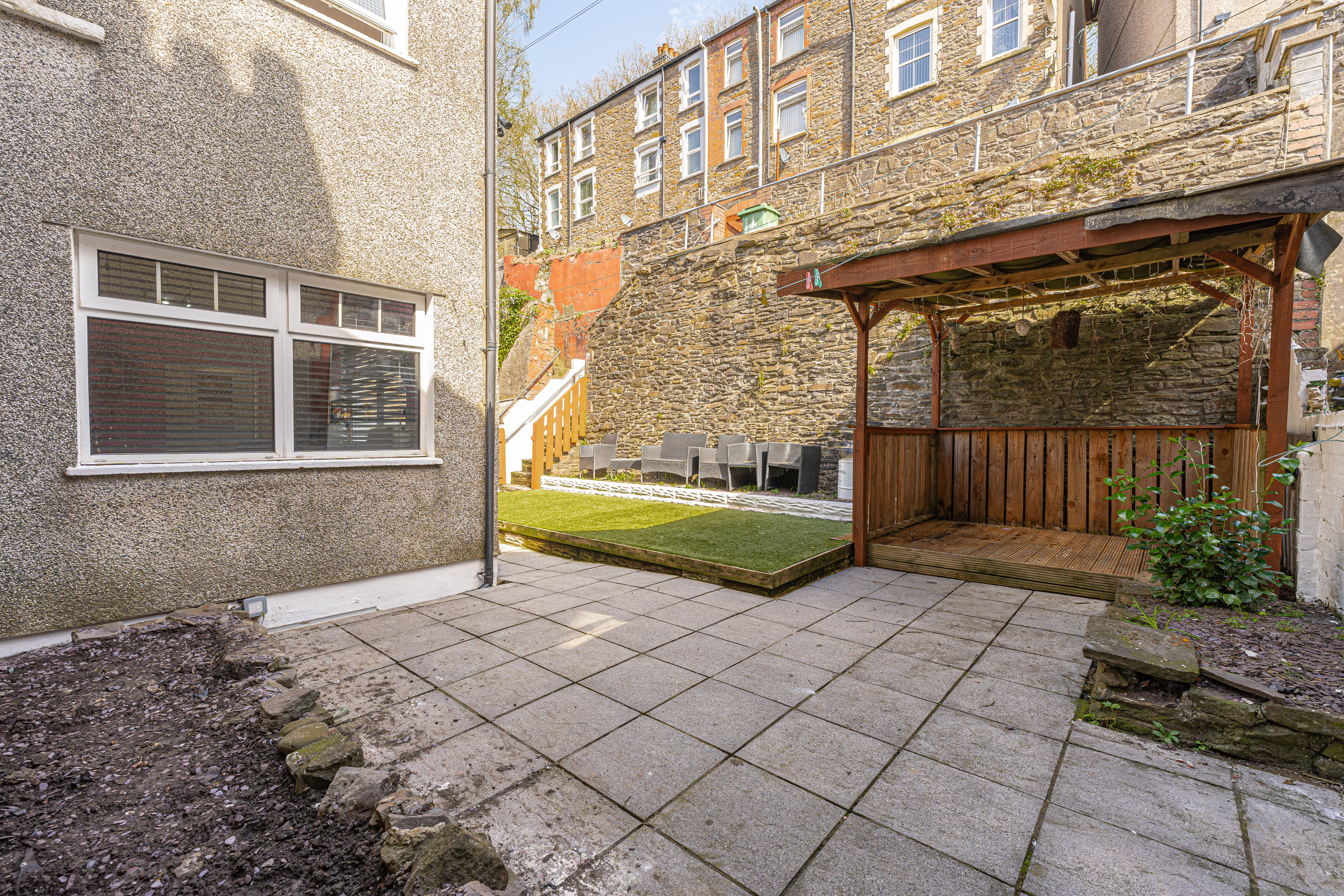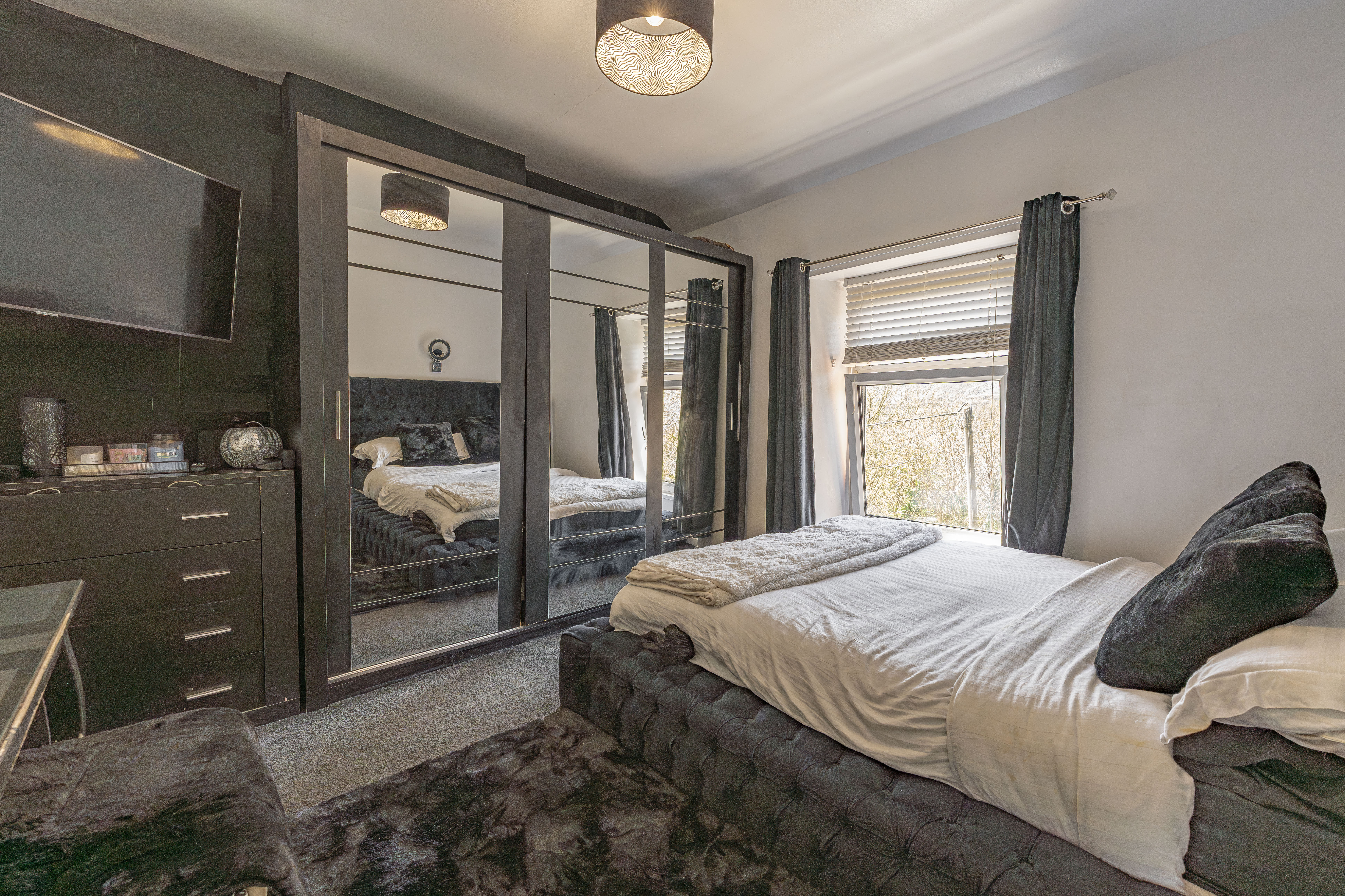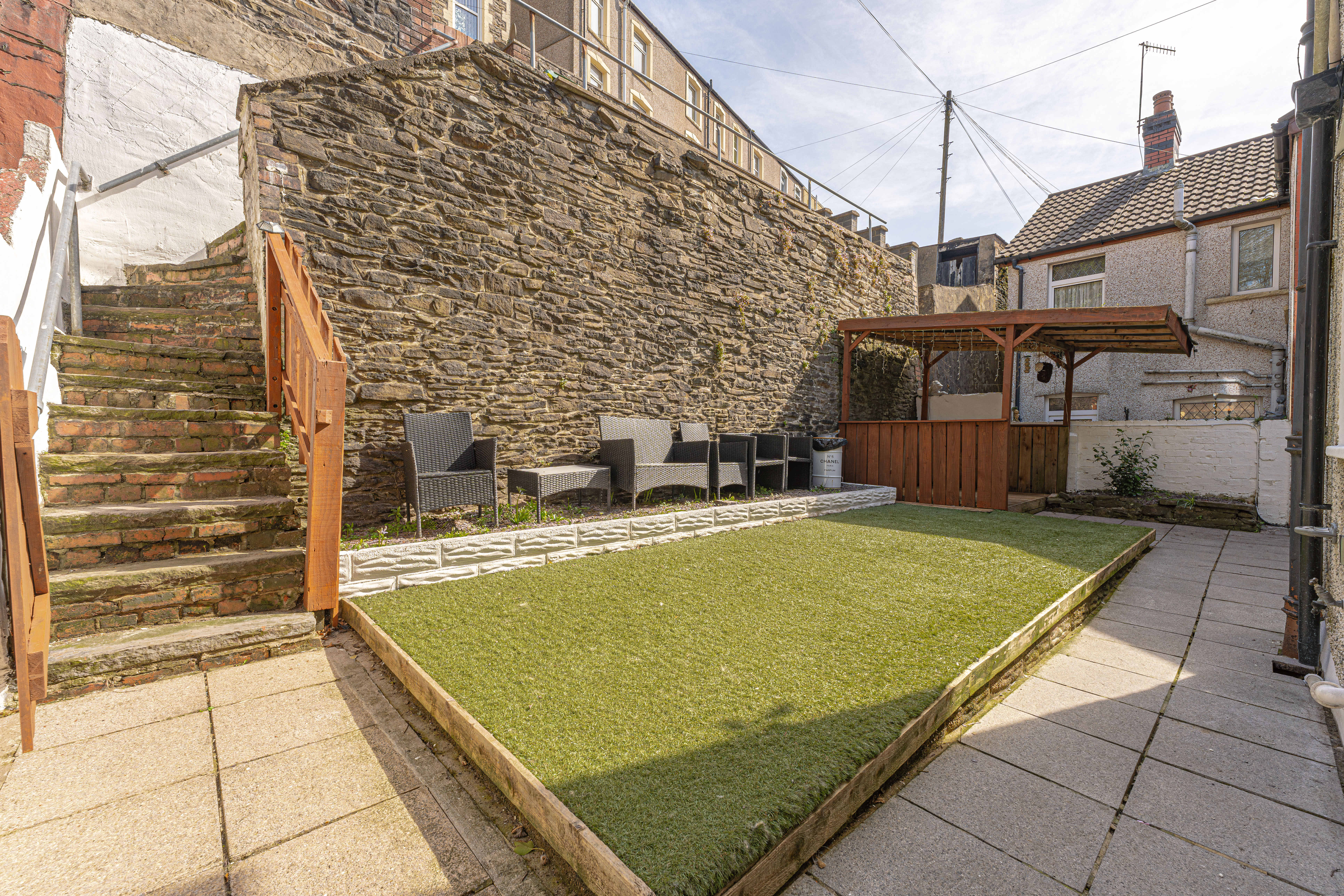 Stepping outside we arrive at the rear garden, which blends artificial lawn and patio space to create an idyllic low maintenance retreat that is ideal for relaxing and entertaining guests. A covered wooden gazebo highlights another perfect space for residents to enjoy dining al-fresco style, with a side walkway that is great for bin storage. The garden continues with a steep staircase above, elevating us to an additional patio space overlooking the house below, while also opening out to the road beyond. At the front of the house we can find a separate patio space at the front of the terrace, providing a beautiful view of the surrounding countryside, with on-road parking readily available below.