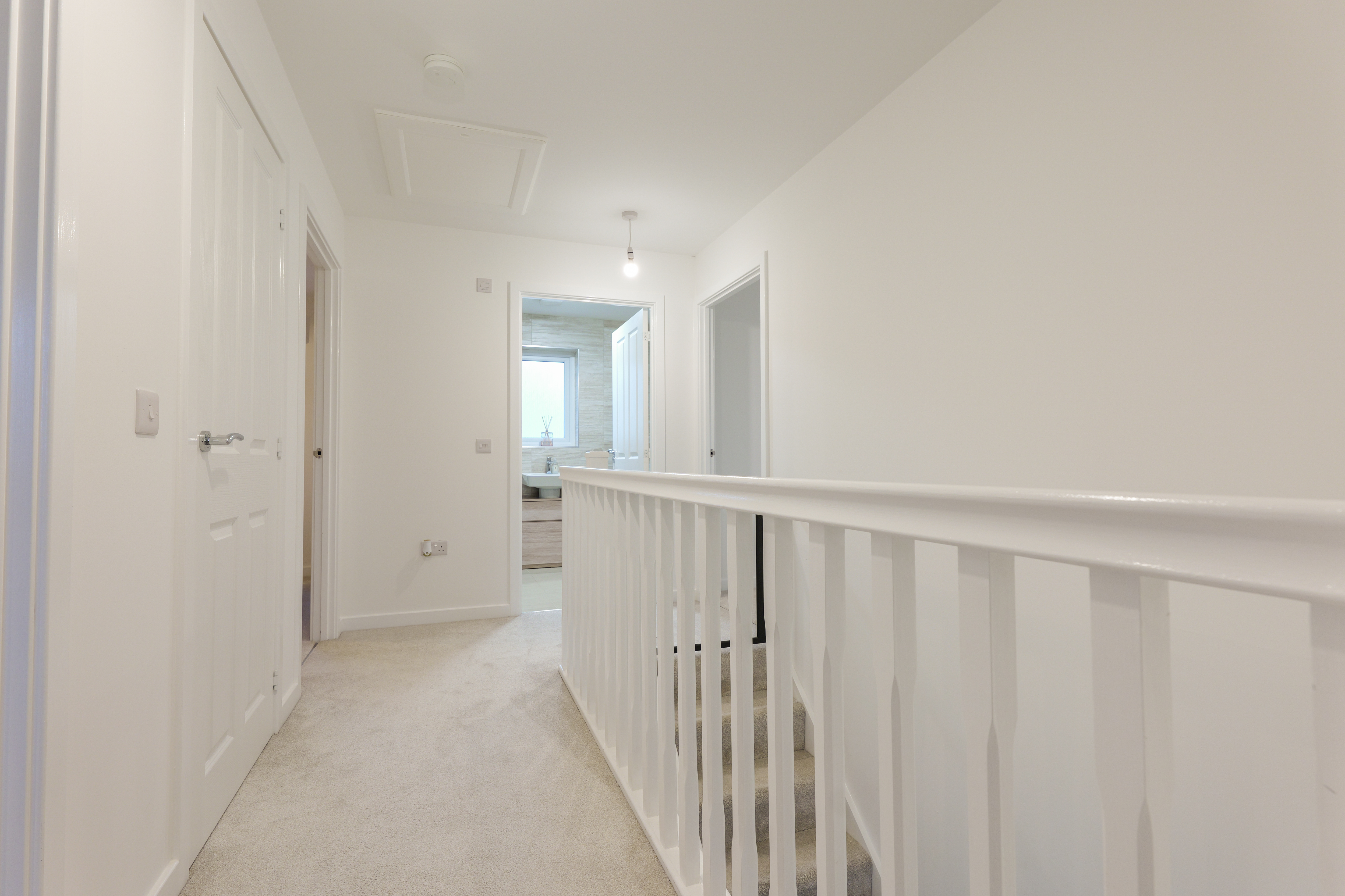 Doors to bedrooms, bathroom and cupboard. Hatch to loft.