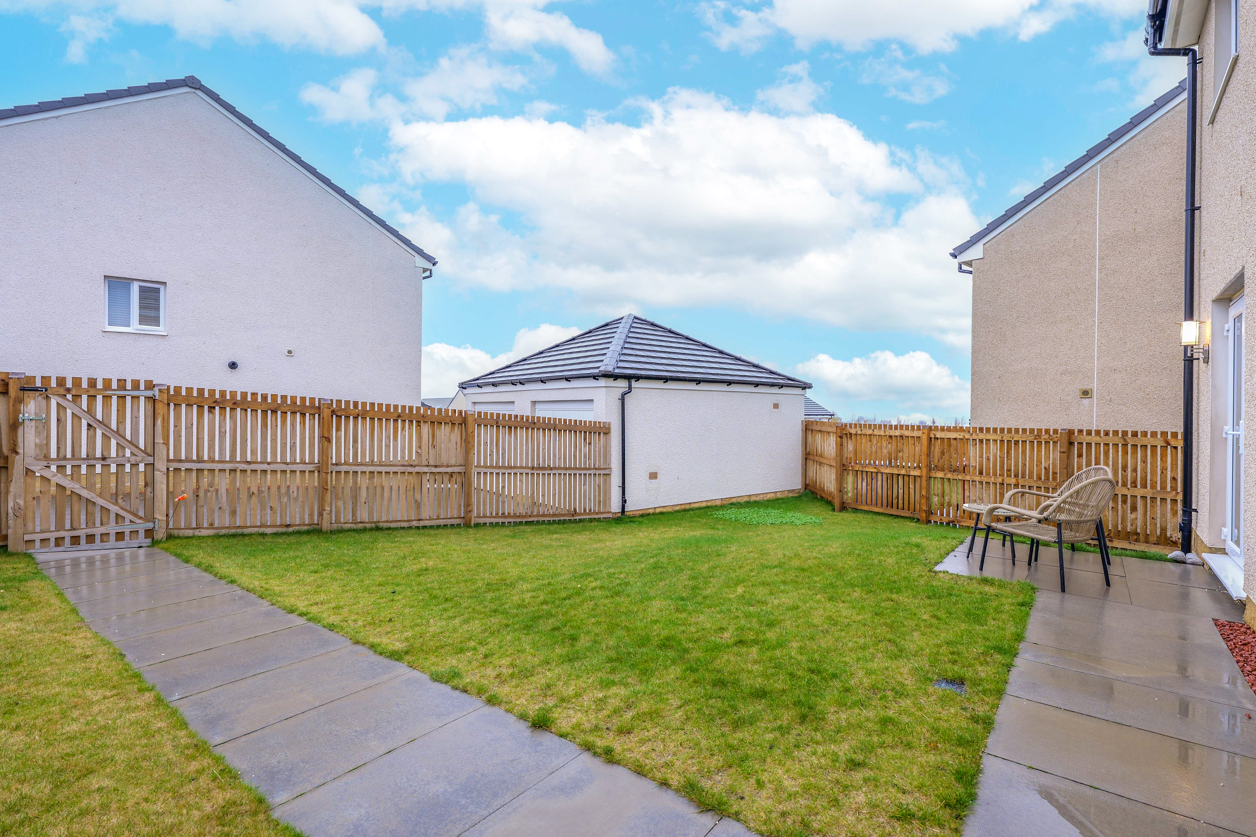 The front garden is laid to grass with shrub borders. The large rear garden is also laid to grass with a suntrap patio, surrounded by full height fencing with gate to garage, outside tap and security lighting.