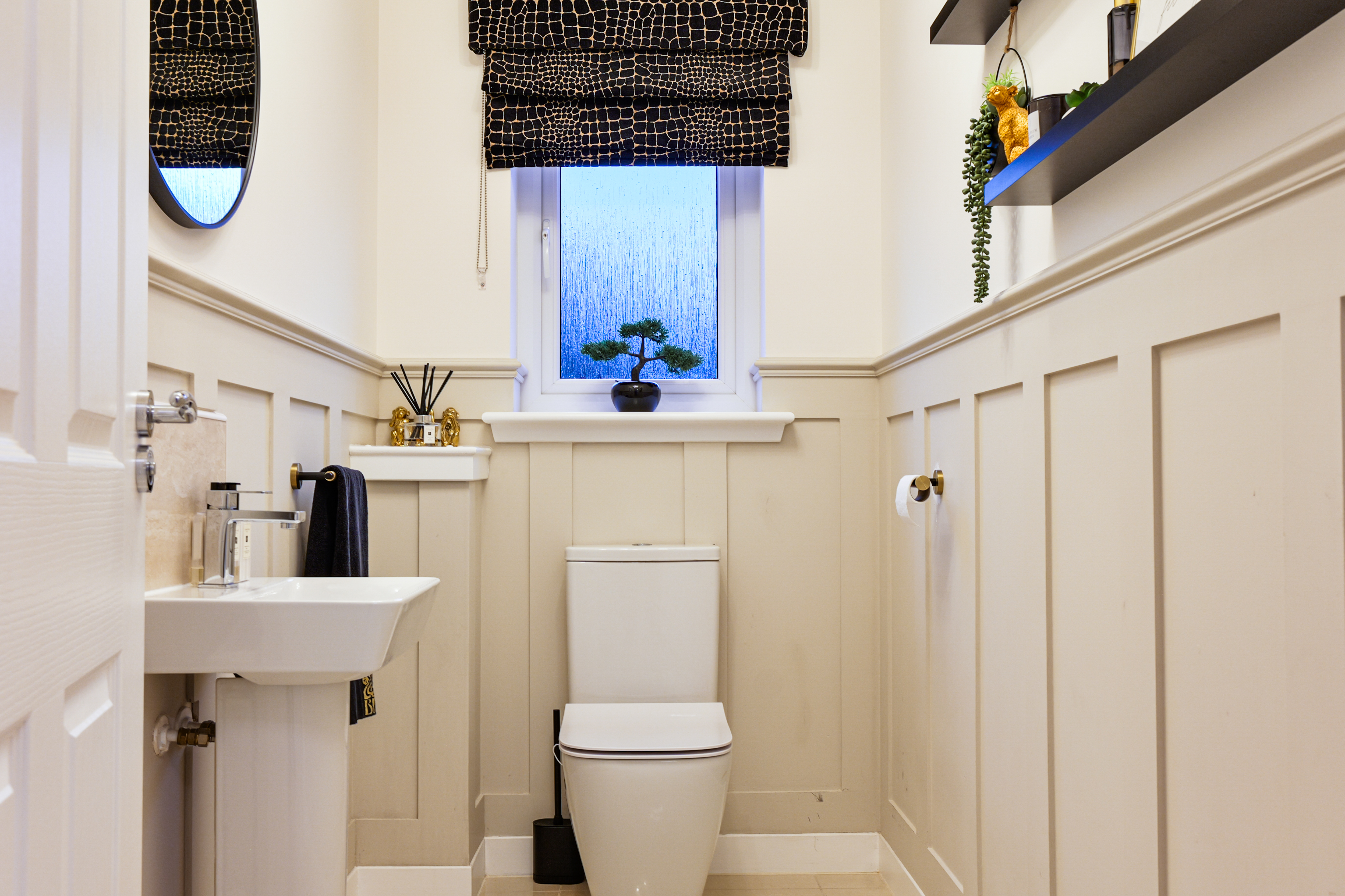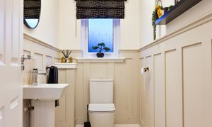 Panelled to dado height and fitted with dual flush WC and pedestal wash hand basin with mixer tap and tiled splashback. Opaque glazed window. Radiator.
