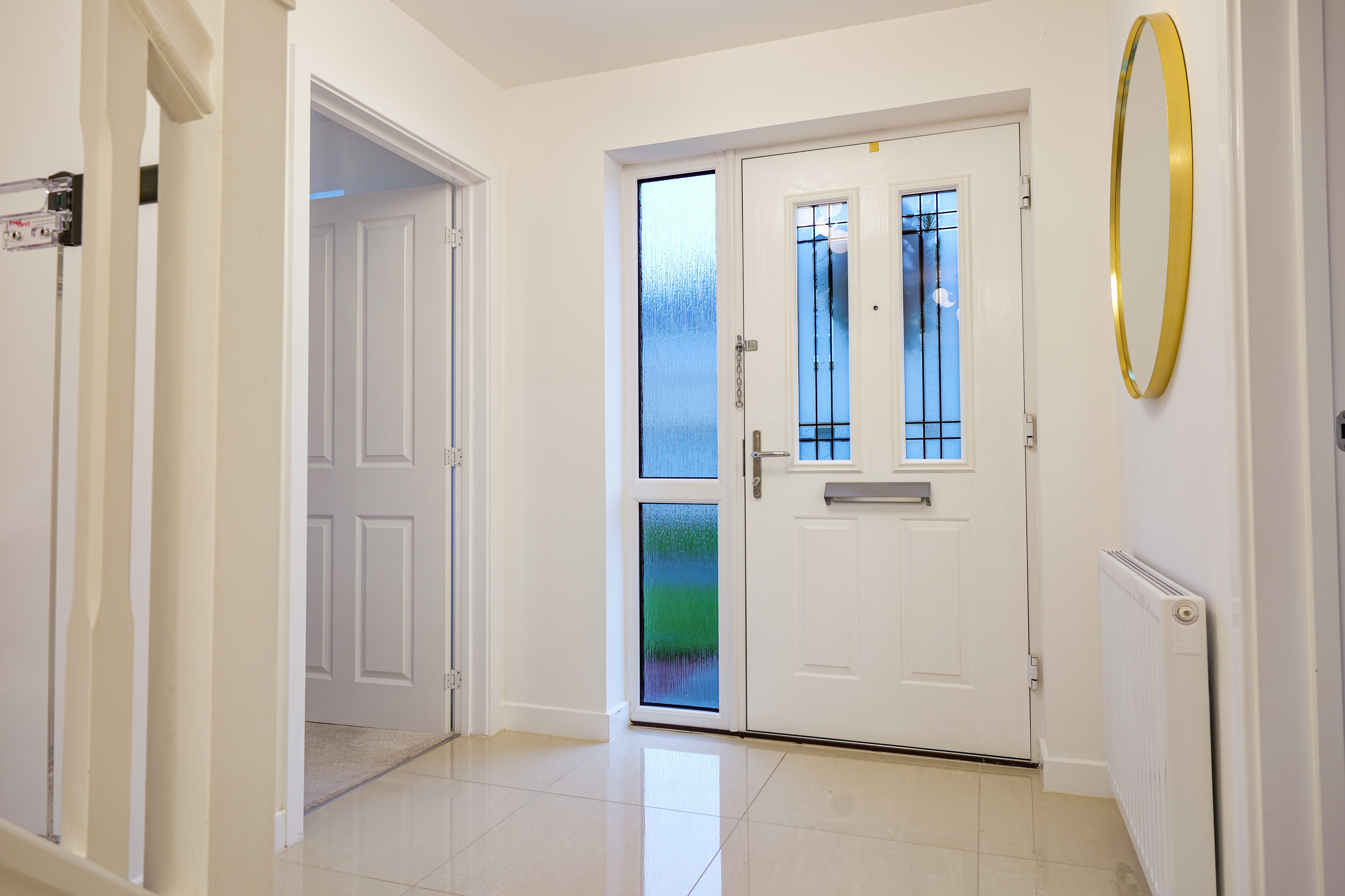 Welcoming hall accessed through door with opaque glazed insets and side panel. Porcelanosa flooring through hall, kitchen/dining/family room, utility room and WC. Doors to lounge, study, kitchen/dining/family room, downstairs WC and understair storage cupboard housing electric switchgear and wifi. Quality carpeted staircase to upper landing and bedrooms. Radiator.