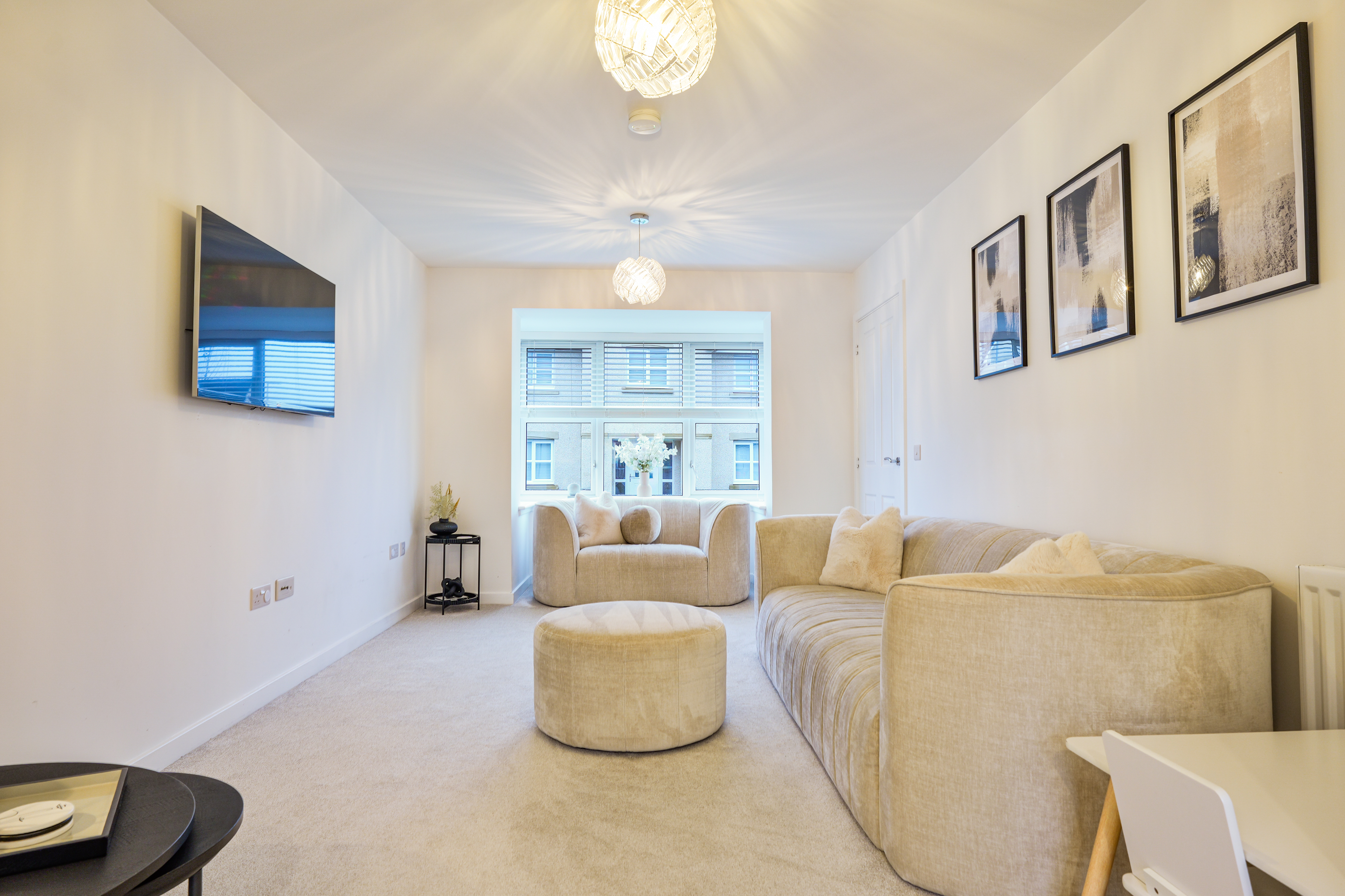 Spacious sitting room with front facing bay window with wood effect venetian blinds and views over the Firth of Forth to Fife. Quality fitted carpet, radiator. Opening to kitchen/dining/family room.