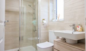 Fully tiled and fitted with double shower cubicle and mains shower, dual flush WC and pedestal wash hand basin with drawers under. Chrome vertical radiator, Porcelanosa flooring. Opaque glazed window.