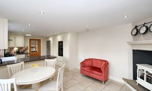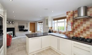 With tiled flooring, double glazed windows, feature fireplace, spotlights, under floor heating, cabinets, sink/drainer, laminate worksurfaces, integrated hob, integrated microwave, integrated oven, integrated dishwasher, fan extractor, space for appliances and door leading to utility room.