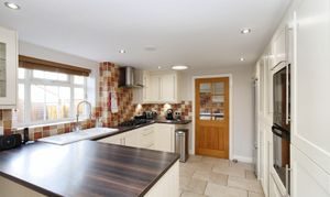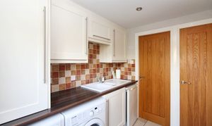 With tiled flooring, space for appliances, storage cupboard, laminate work surfaces, cabinets, spotlights, door leading to front aspect and door leading to downstairs WC.