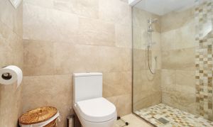 With tiled flooring, vanity hand wash basin, walk in shower, WC, towel radiator and spotlights.