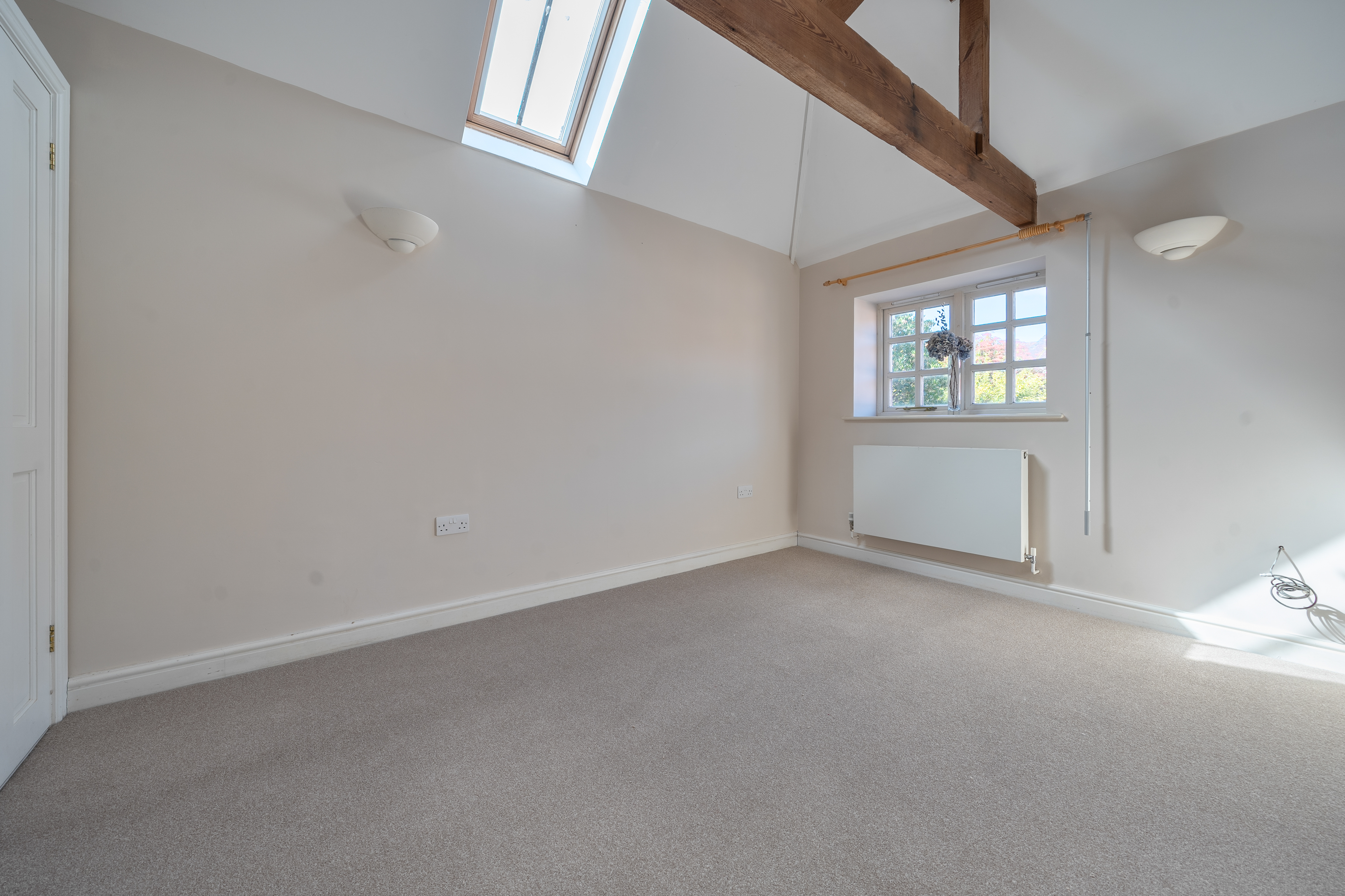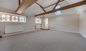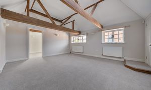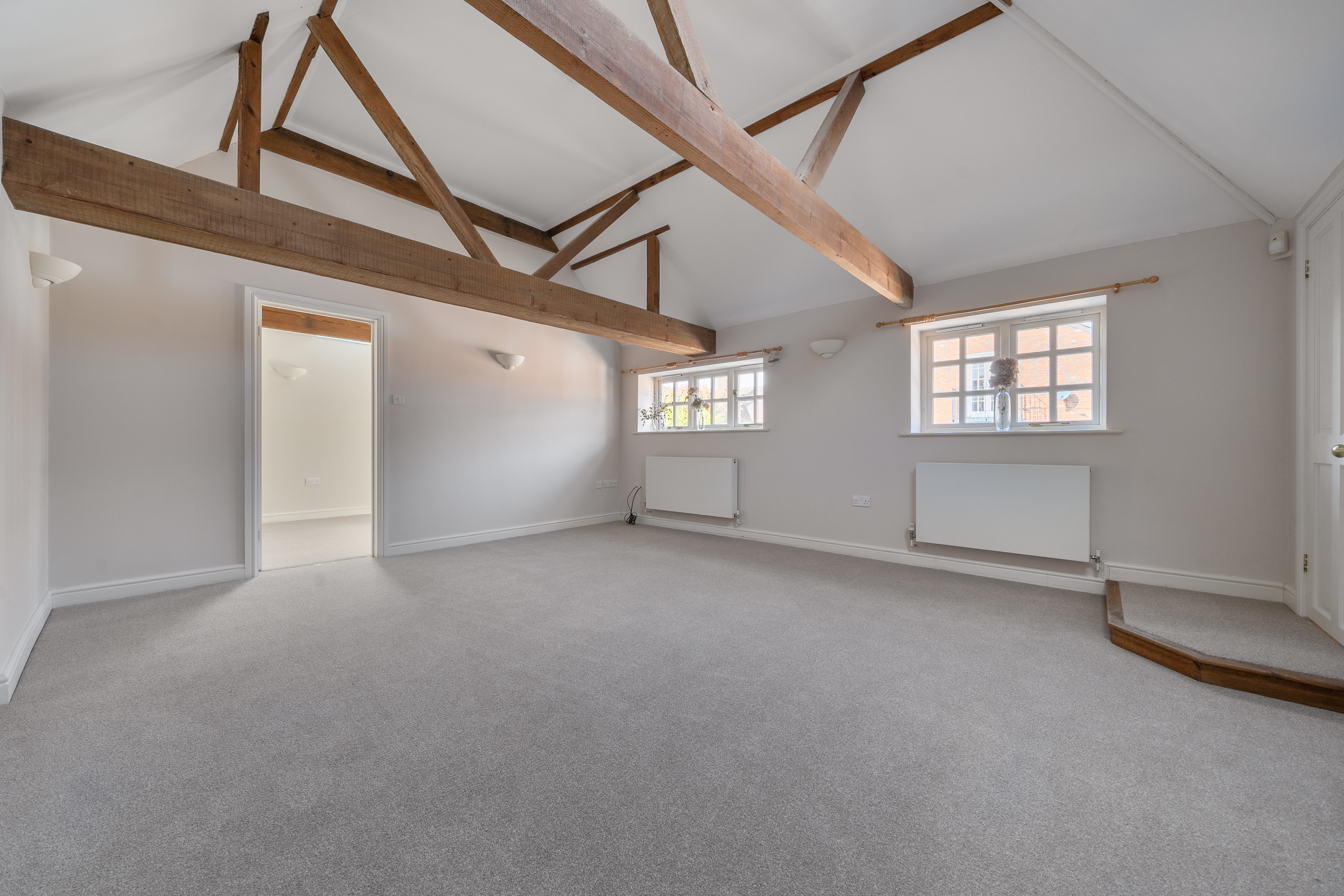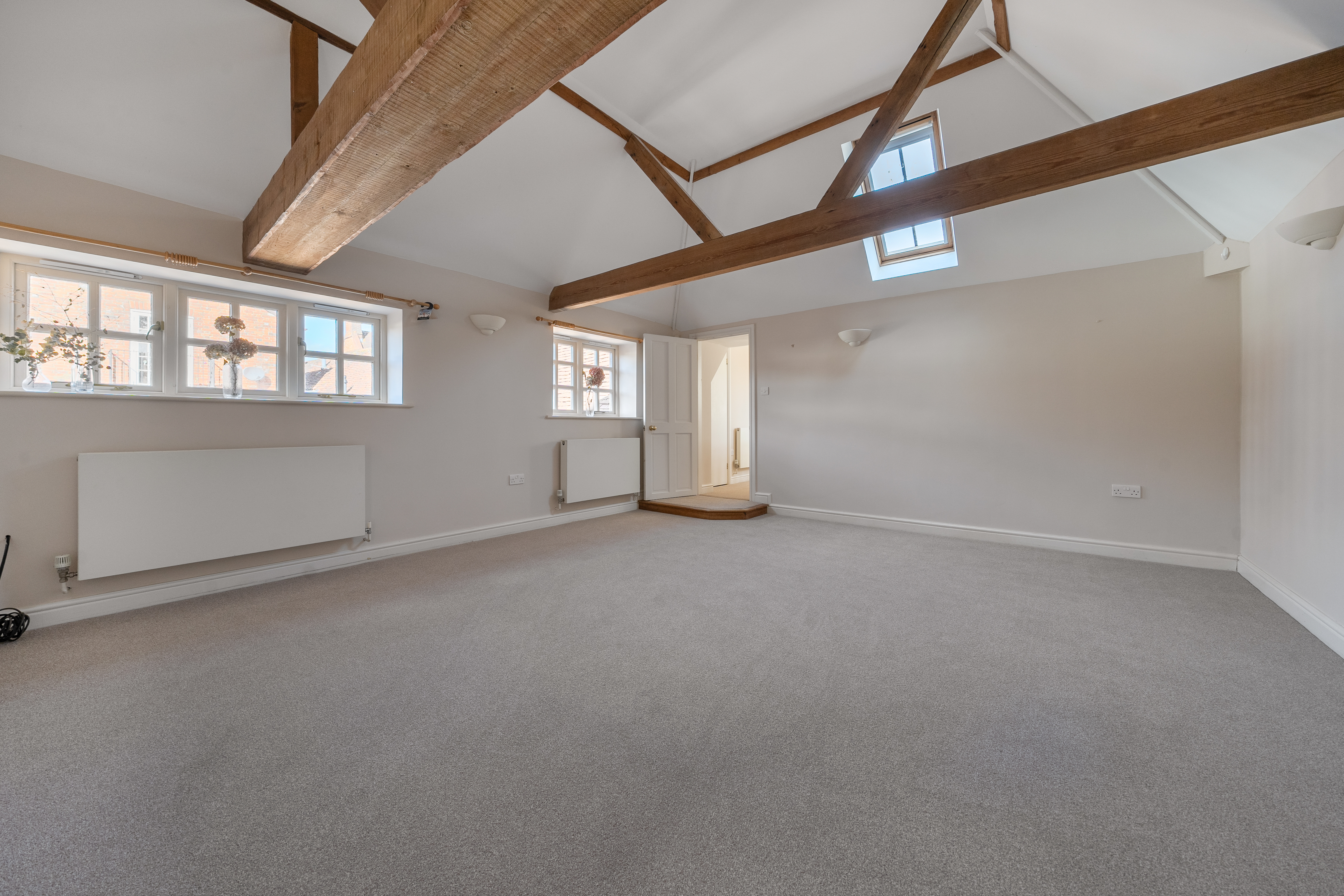 Upstairs, the first floor opens into a spacious and light-filled double-aspect living/dining room, showcasing charming vaulted ceilings and exposed beams that enhance the property’s character.