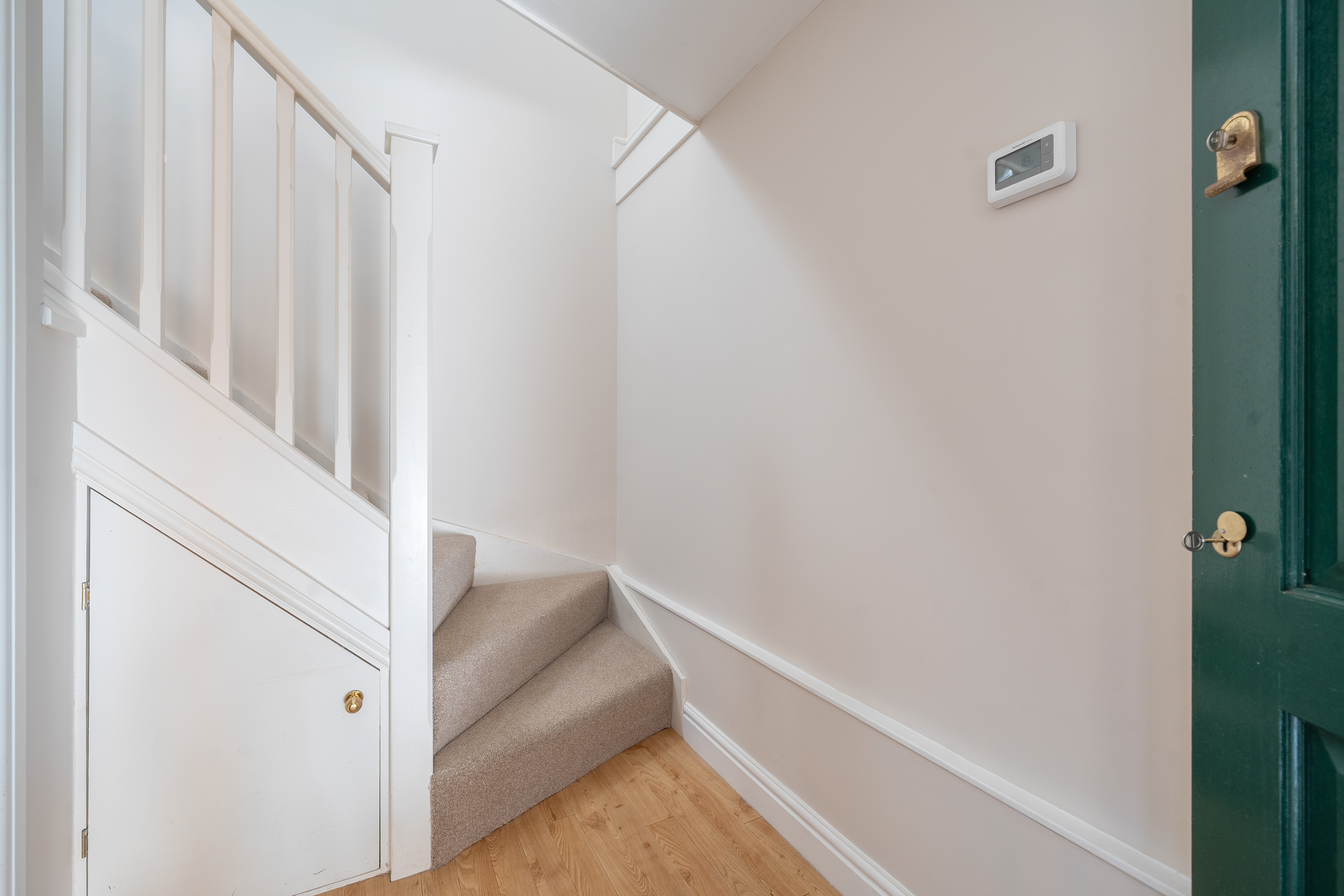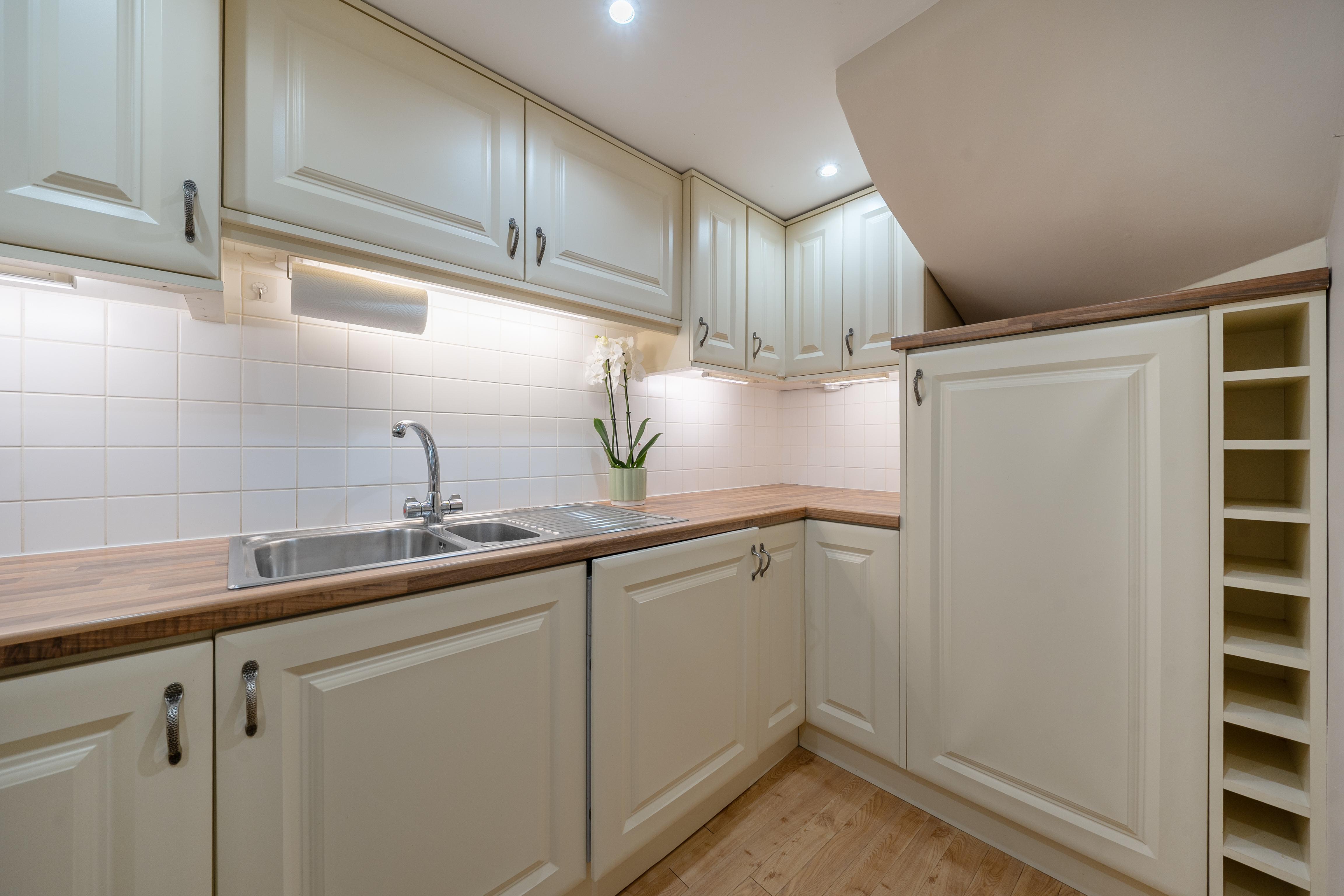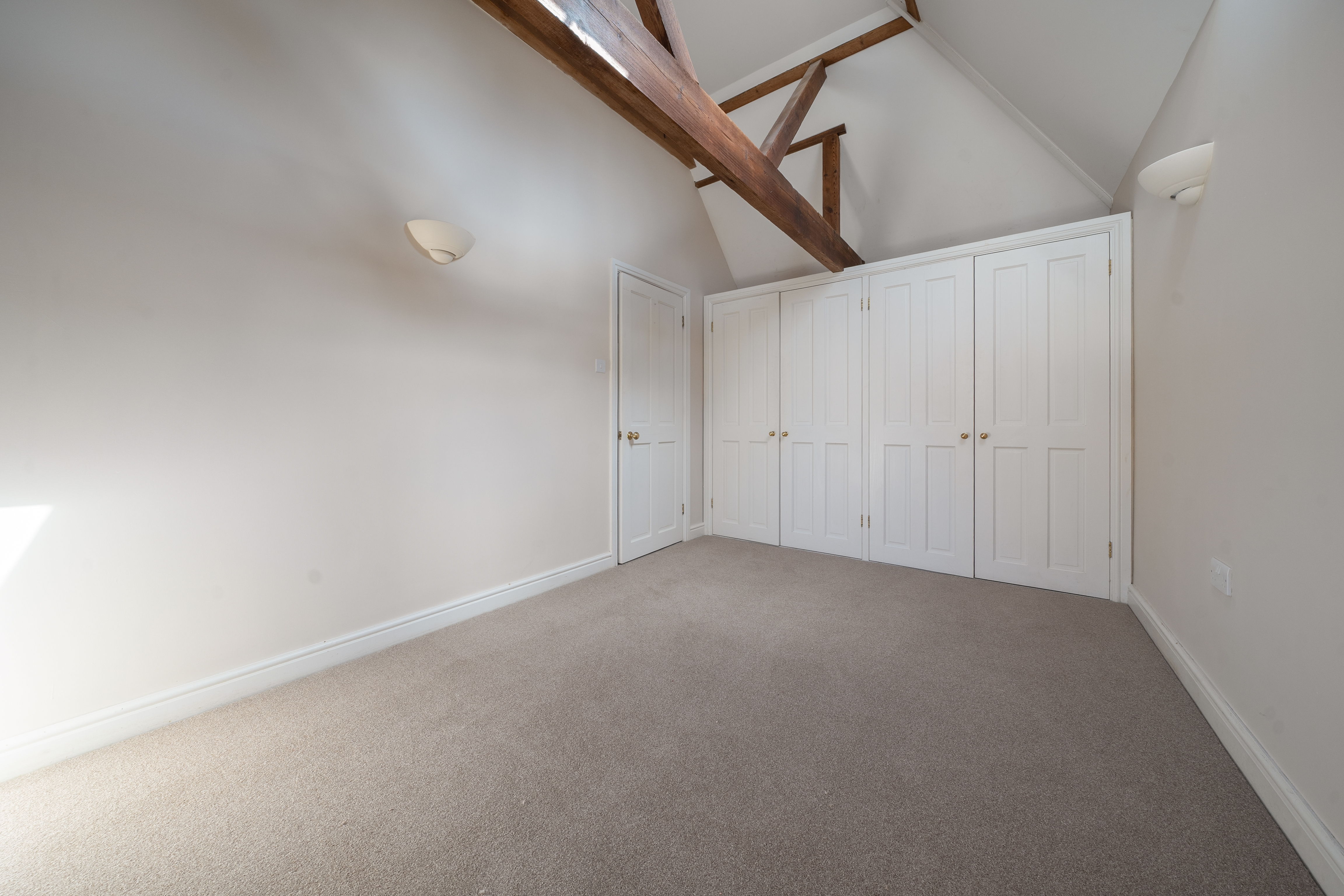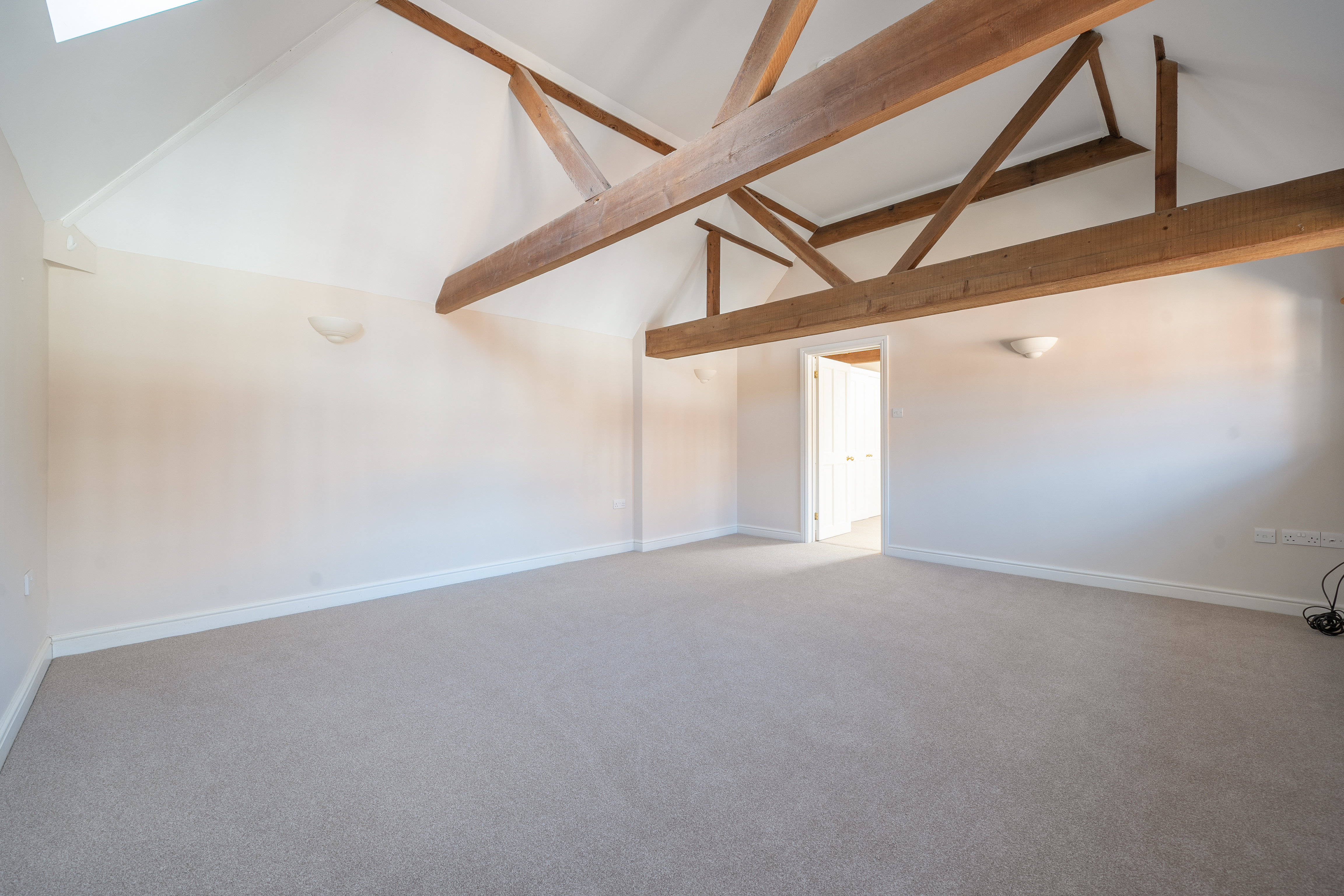Upstairs, the first floor opens into a spacious and light-filled double-aspect living/dining room, showcasing charming vaulted ceilings and exposed beams that enhance the property’s character.