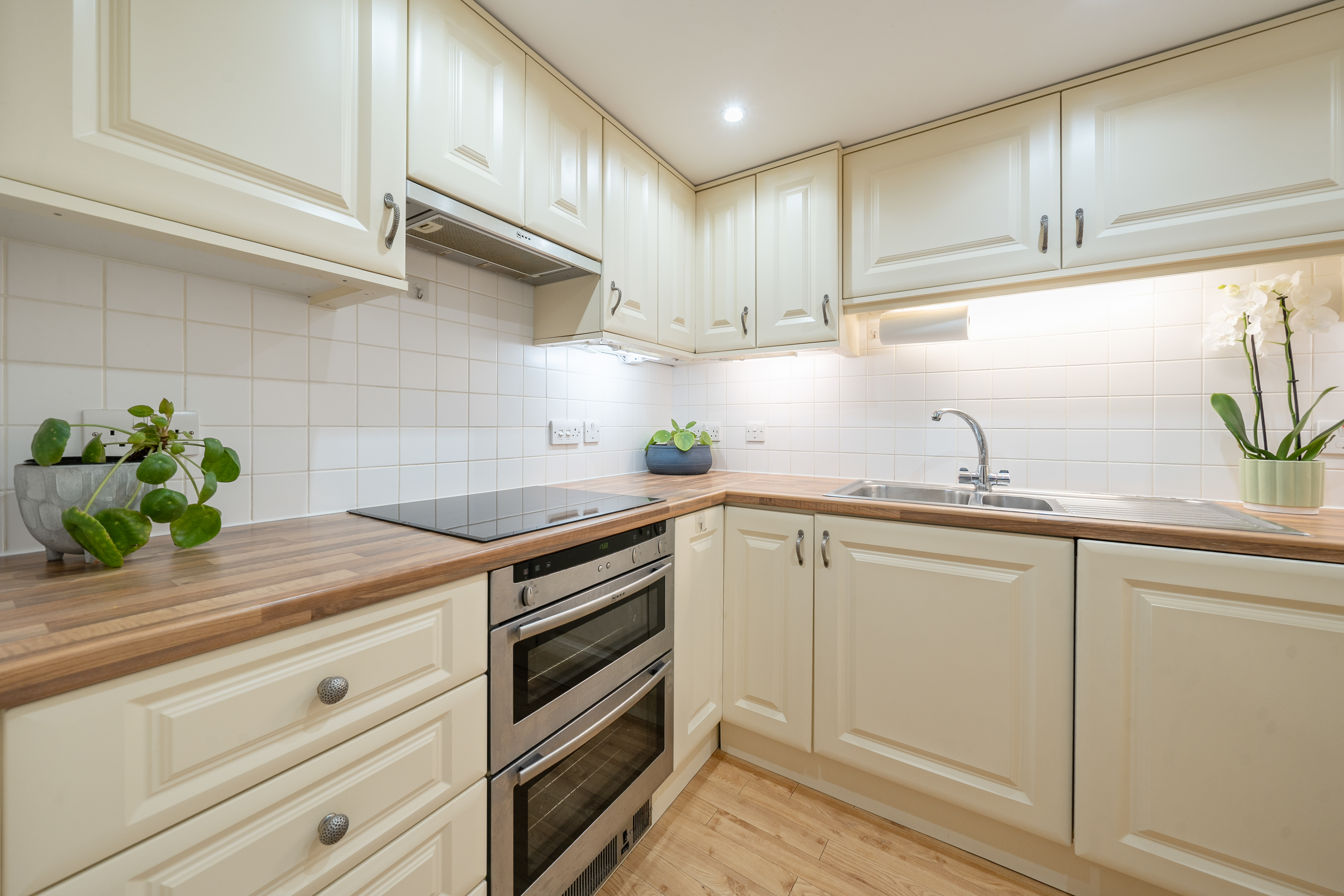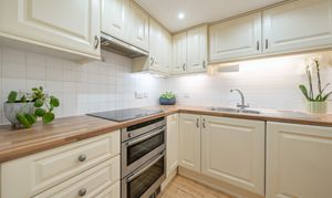 The ground floor features a well-proportioned, fully fitted kitchen complete with integrated appliances, offering both style and practicality.
