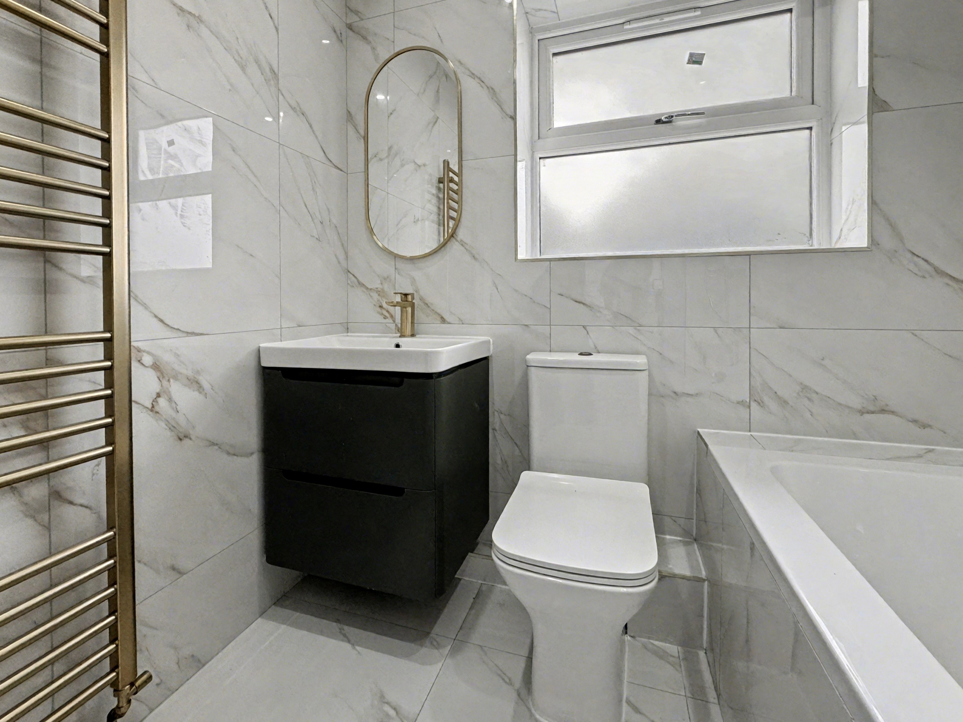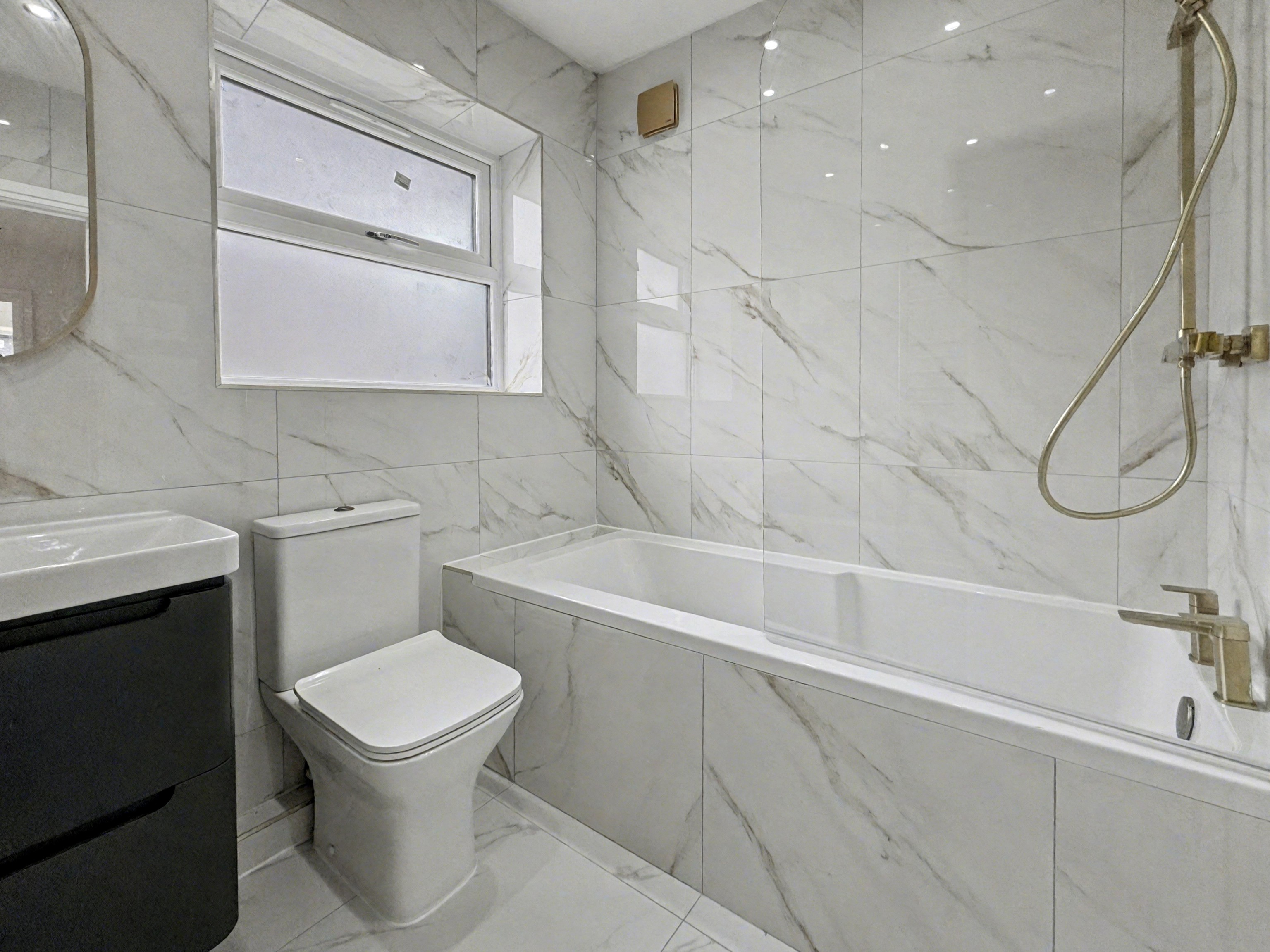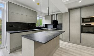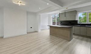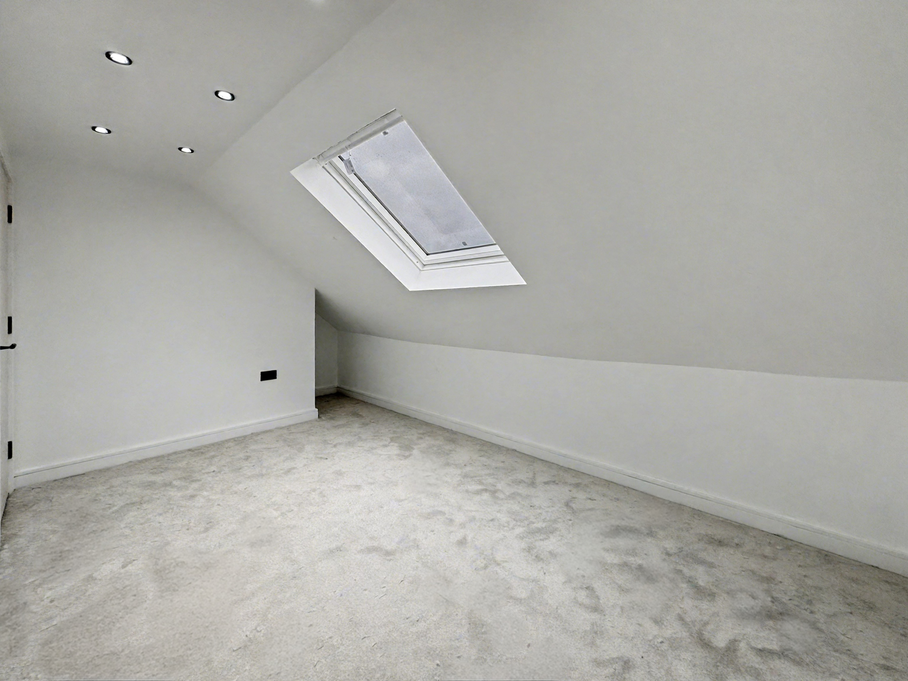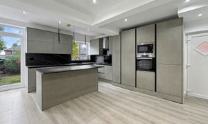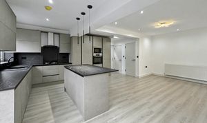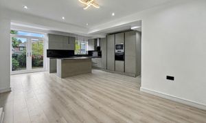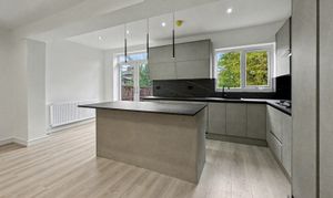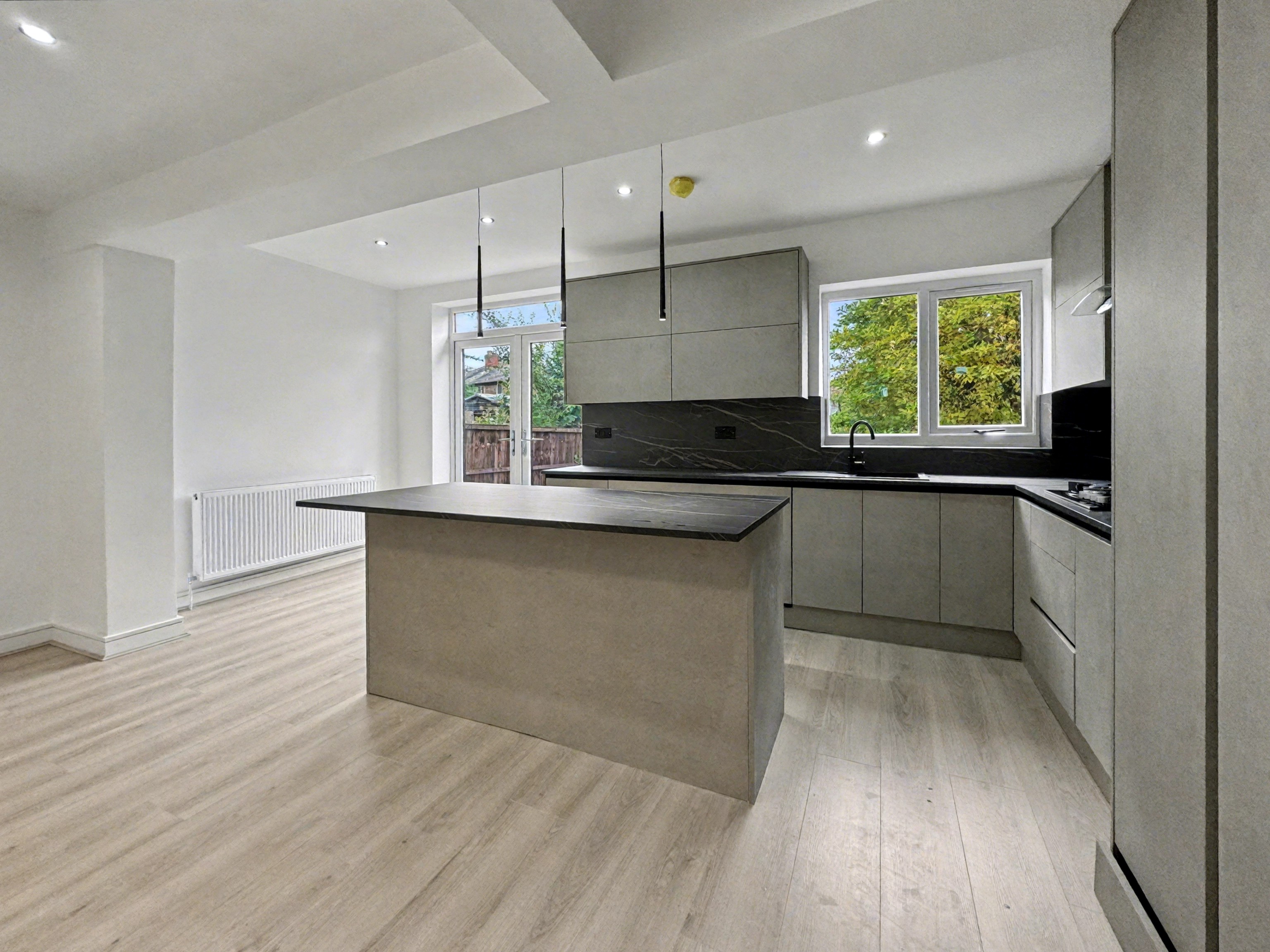 Upon entering, you’re welcomed by a bright hallway that leads into a stylish front reception room, ideal for relaxing or entertaining. To the rear, you’ll find a stunning open-plan kitchen and dining area — the true heart of the home — featuring sleek modern units, high-quality fittings, a central island, and elegant drop-down lighting. Large double doors open out to the garden, creating a seamless flow between indoor and outdoor living spaces.