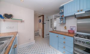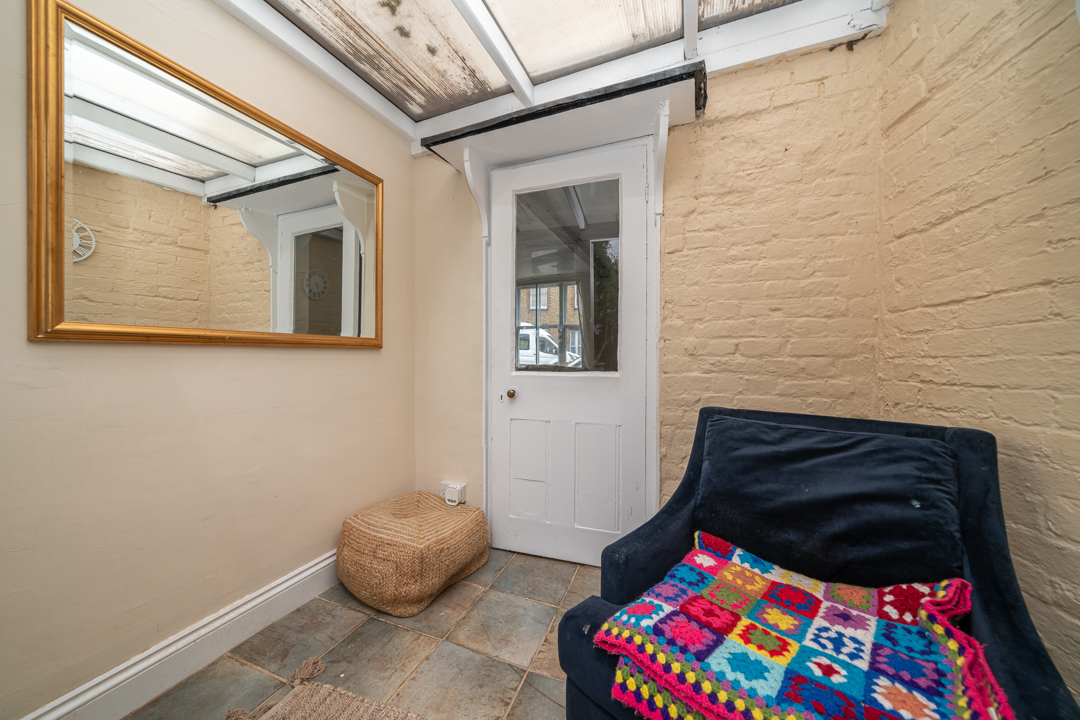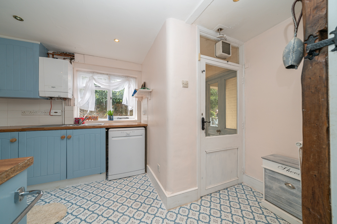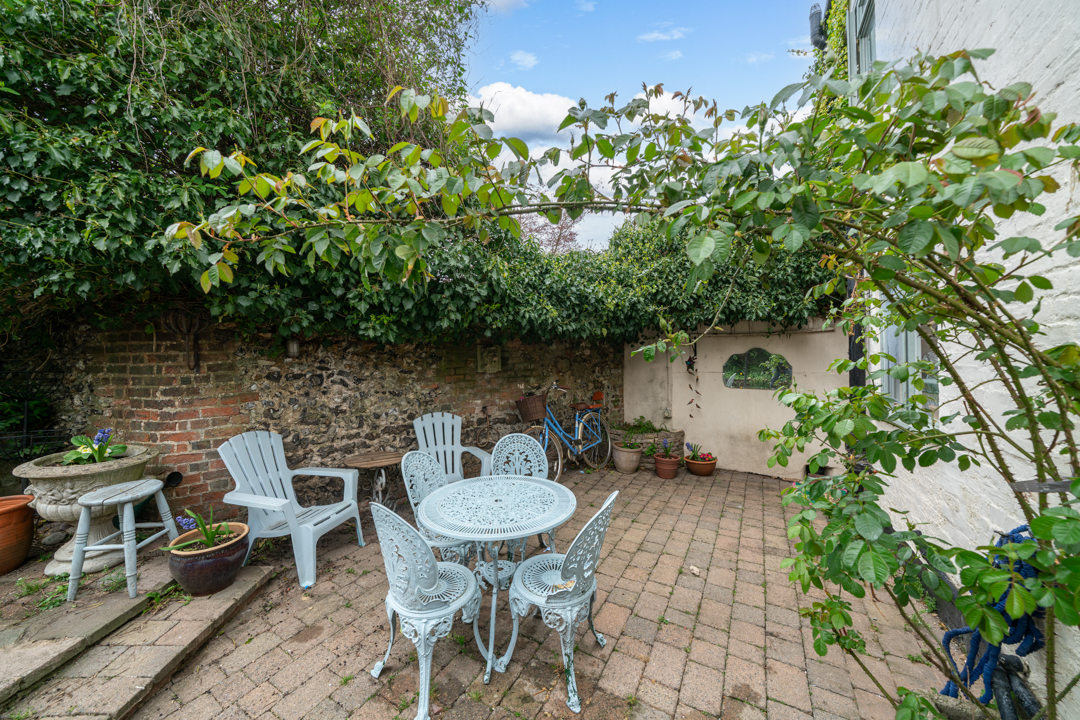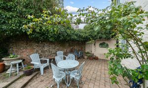 Outside, the kitchen leads to a private, low-maintenance rear garden enclosed by an attractive brick wall. The property also benefits from a rear outbuilding and access.