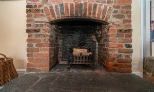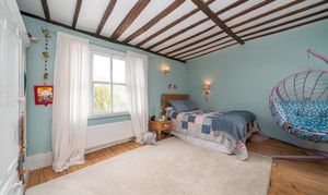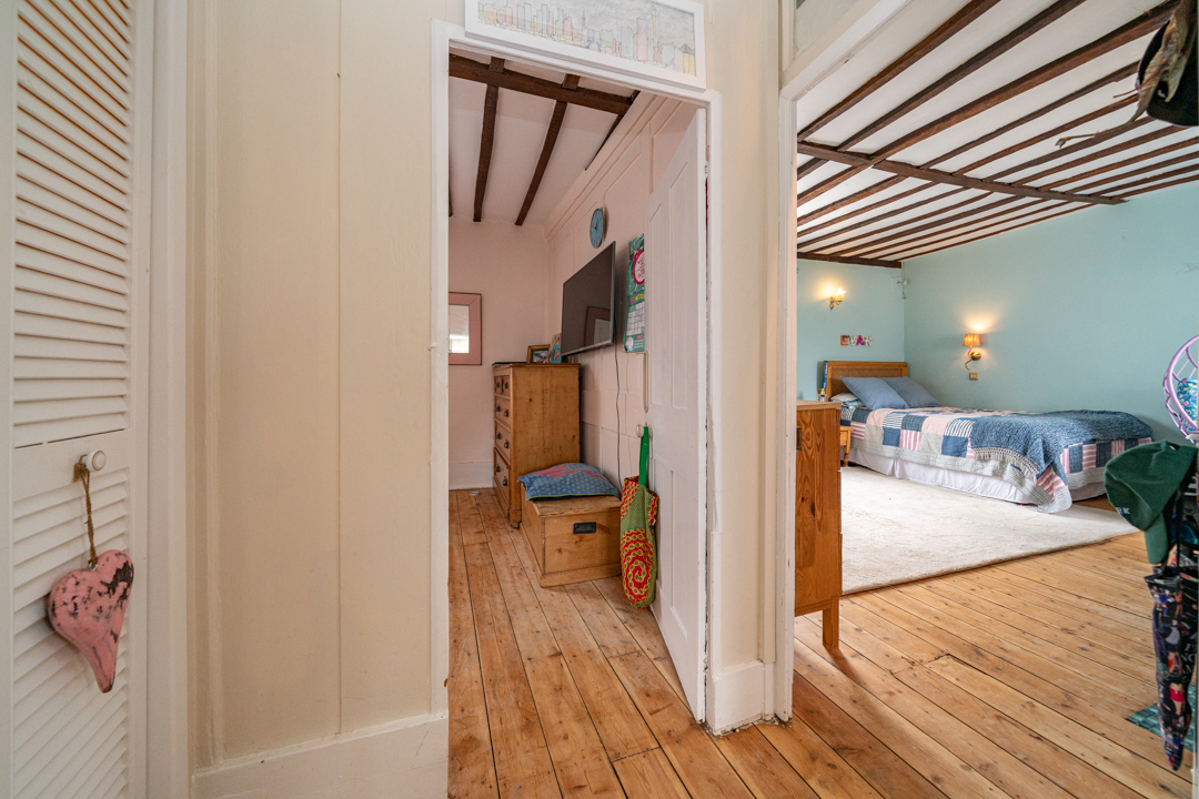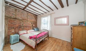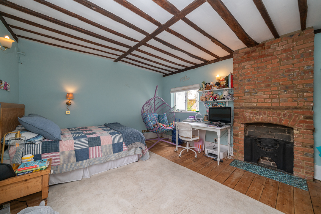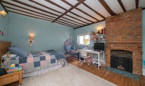 Upstairs, the impressive principal bedroom features exposed beams, brickwork, and its own fireplace, complemented by two further well-proportioned, characterful bedrooms and a three-piece family bathroom.
