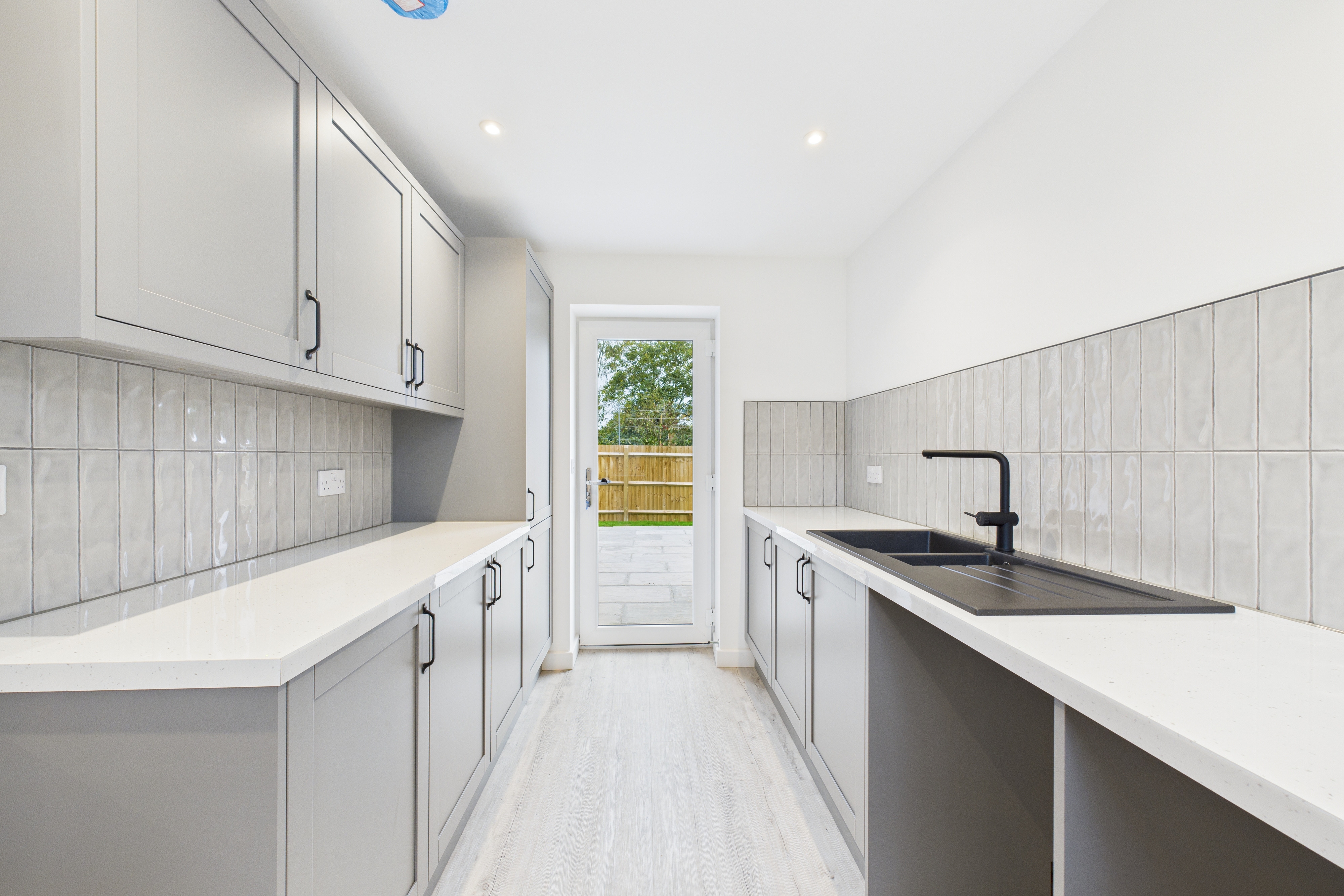 At the heart of the home is a stunning Shire kitchen and dining area, featuring a central island breakfast bar, grey cabinetry, sleek light fittings, and integrated appliances, including a wine fridge. The open-plan layout creates a welcoming hub for family life and entertaining, while glass doors ensure light flows freely through the space. A spacious utility room offers additional appliance space and storage, with a glass door opening onto the patio.