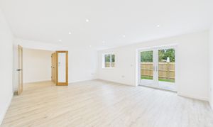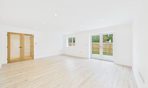 The large living room is bright and inviting, with French doors opening onto the rear patio and garden, offering a seamless connection between indoor and outdoor living.