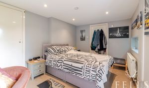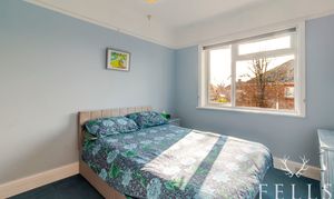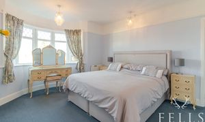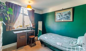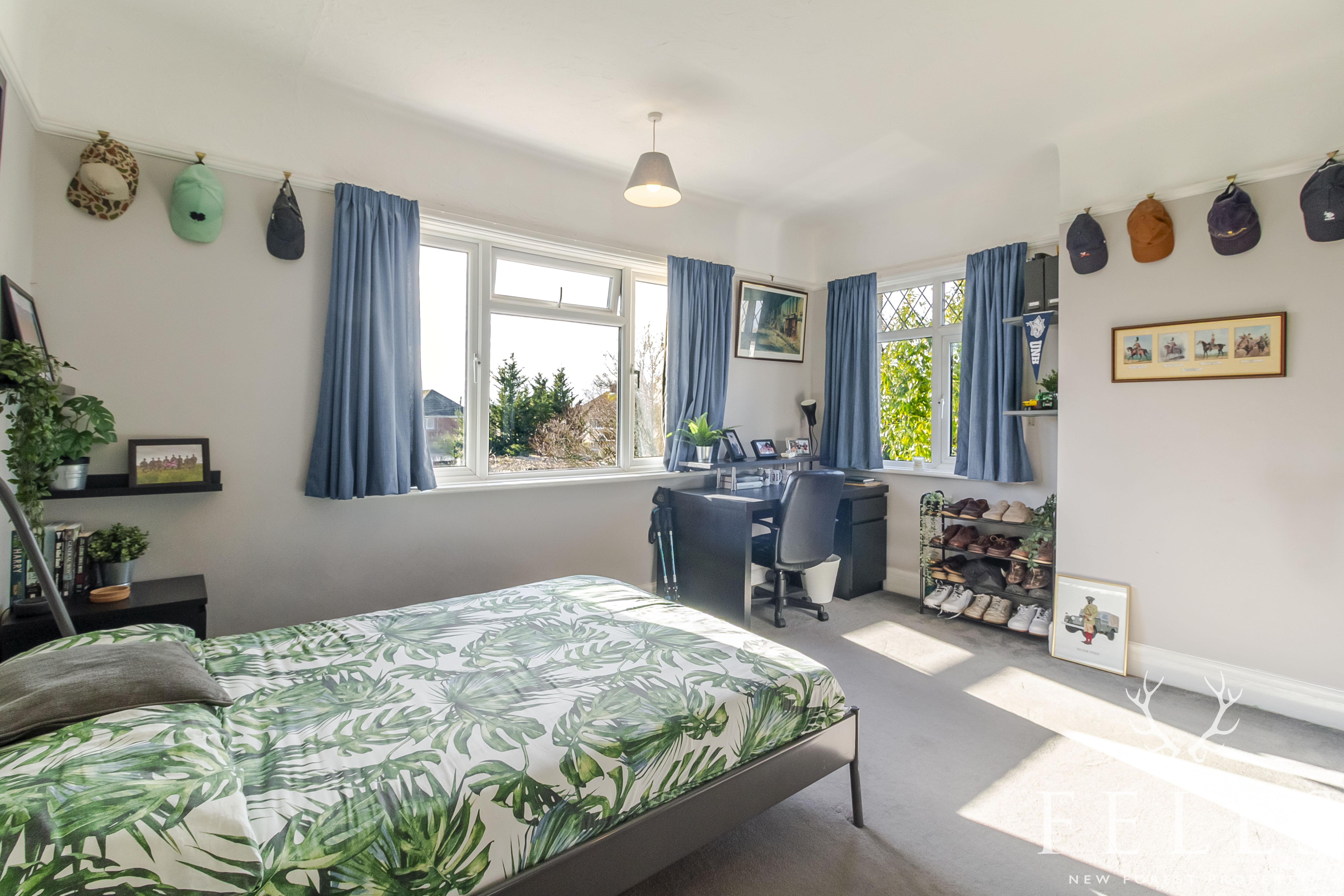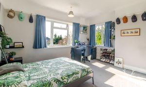 The first floor landing leads to four well proportioned bedrooms and access to the loft space. The principal bedroom is positioned to the front with a double aspect, including a striking bow bay window and the potential for an en-suite. Bedrooms Two and Three overlook the rear garden, enjoying peaceful, leafy outlooks, while Bedroom Four is located to the front of the property. Built in cupboards provide useful storage and house the boiler, with additional shelving.