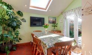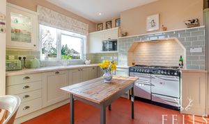 The kitchen breakfast room sits at the rear of the house and forms the heart of everyday living. Fitted with a range of cupboards and drawers, white washed solid wood worktops and integrated appliances including a dishwasher, microwave and upright fridge, it also offers space for a range style cooker set against a tiled surround. A one and a half bowl sink sits beneath a rear aspect window overlooking the garden, while a skylight and French doors flood the space with natural light and open onto the patio. A separate utility room provides additional storage and space for appliances, keeping the main kitchen calm and clutter free.
