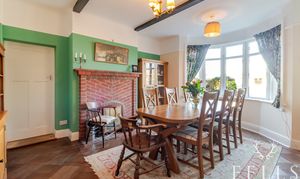 To the front of the property, the dining room provides a superb setting for entertaining, featuring a bow bay window overlooking the driveway, a character brick fireplace and ample space for a large table and chairs. A door leads through to Bedroom Five, currently configured as a home office. This versatile room benefits from a front aspect window and its own en suite shower room, comprising a shower cubicle with thermostatic shower, pedestal basin and WC. Whether used as a ground floor bedroom, guest suite or retained as a home office, it offers flexibility rarely found in homes of this era.
