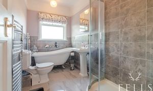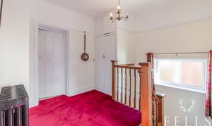 The family bathroom serves the first floor accommodation and provides a bath, corner shower, wash basin and WC, offering practical space for busy mornings and family life. Built in cupboards on the landing house the boiler and provide additional shelving for storage.