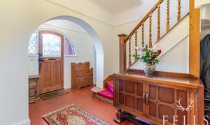 A spacious entrance hall immediately sets the tone, with tiled flooring underfoot, cast iron period radiators and a striking staircase with beautifully turned wooden spiral spindles rising to the first floor. Practical storage is neatly arranged beneath the stairs, while doors lead to the majority of the ground floor rooms. A cloakroom sits just off the hallway, fitted with a pedestal basin and WC and enjoying both front and side aspect windows.