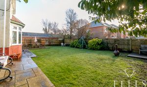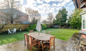 The rear garden enjoys a southerly aspect and is ideal for both relaxation and entertaining. A paved terrace sits directly behind the house, perfect for outdoor dining, while the remainder is laid mainly to lawn and bordered by mature trees and well stocked flower and shrub beds. At the far end of the garden, a raised deck creates a sociable space complete with a characterful outdoor bar. A timber built storage shed runs along the side of the property, offering useful access between the front and rear gardens.